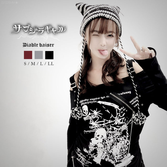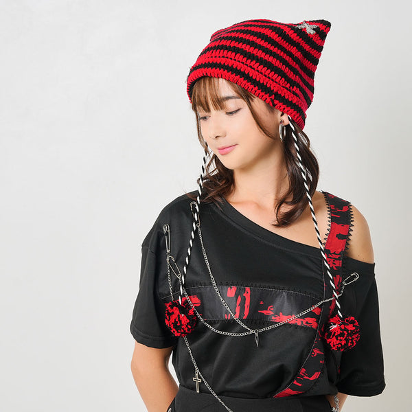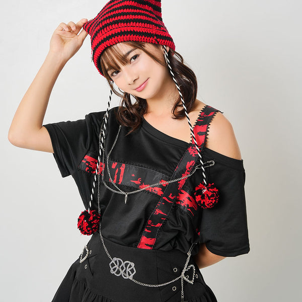 ▶ 十字架パーツチェーン付オフショルカットソーチュニックトップス