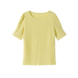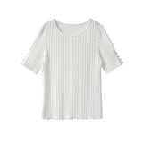 ふっくらとしたレディな袖と袖口のパールボタンが上品なアクセントに。