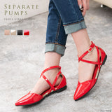 すっきりとしたポインテッドトゥと、クロスしたアンクルストラップが足を華奢に見せ、デイリーに活躍してくれるパンプス。