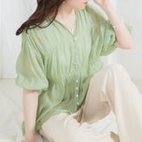 程よく透け感のある素材を使用した、軽やかなシャツブラウス。