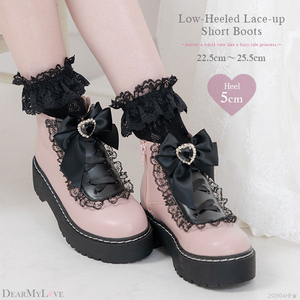 デザインは安定の可愛さ、レースアップやリボン、ビジューがポイントです。ヒール縁のステッチがアクセントになっています。