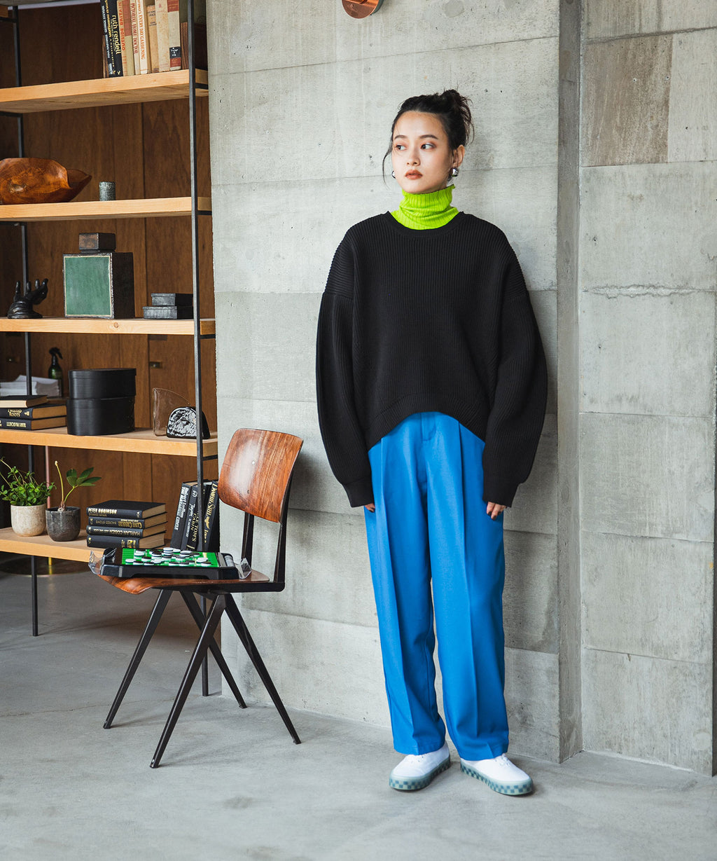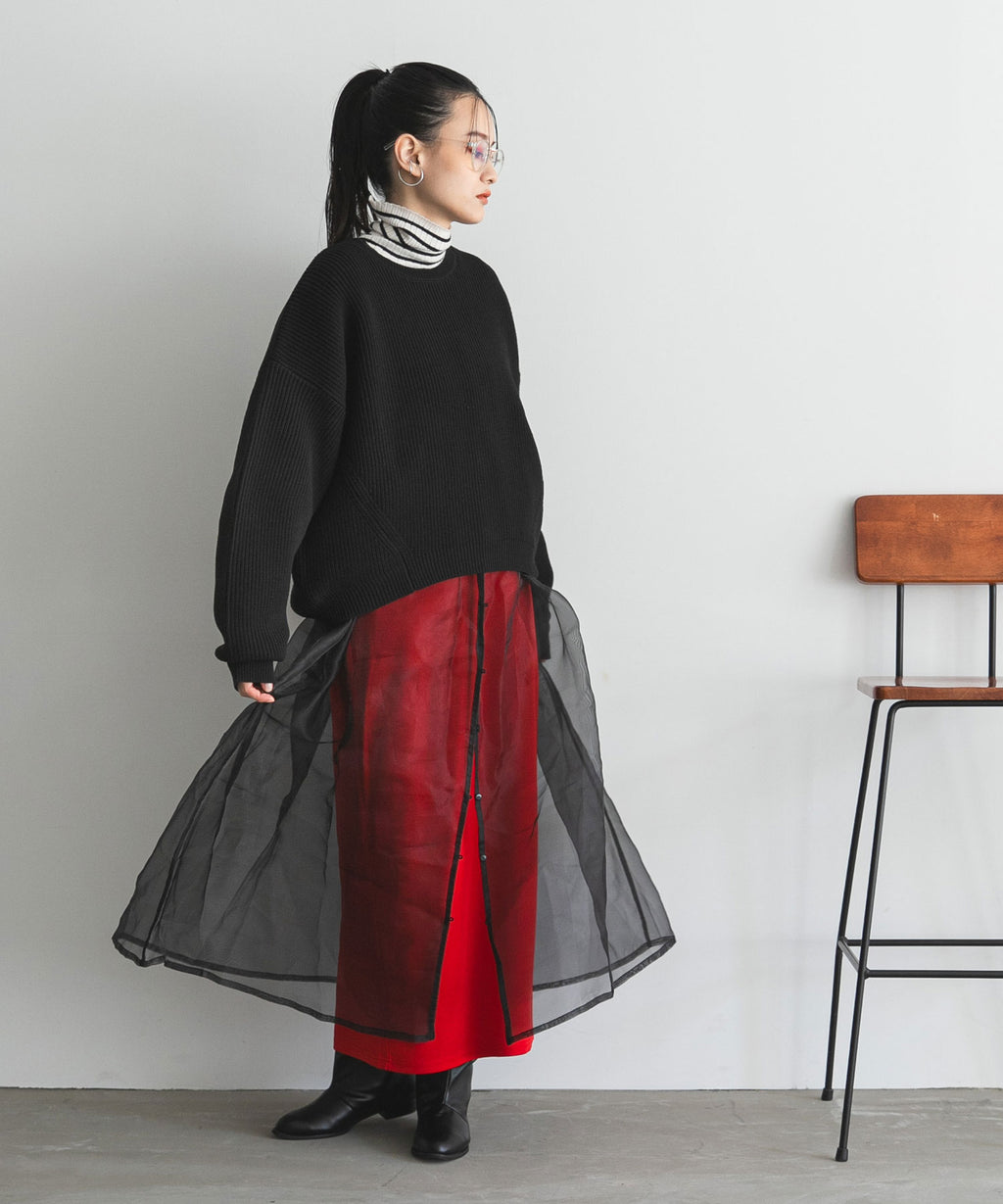 インナーにハイネックや白T、シアーアイテムを合わせてレイヤードコーデも。