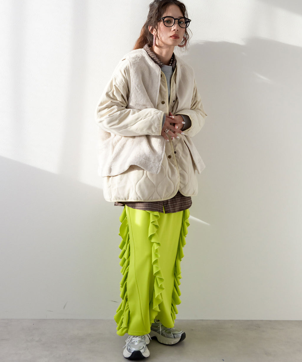 カジュアルな印象のキルティングアウターをファーベストとセットで着ることで