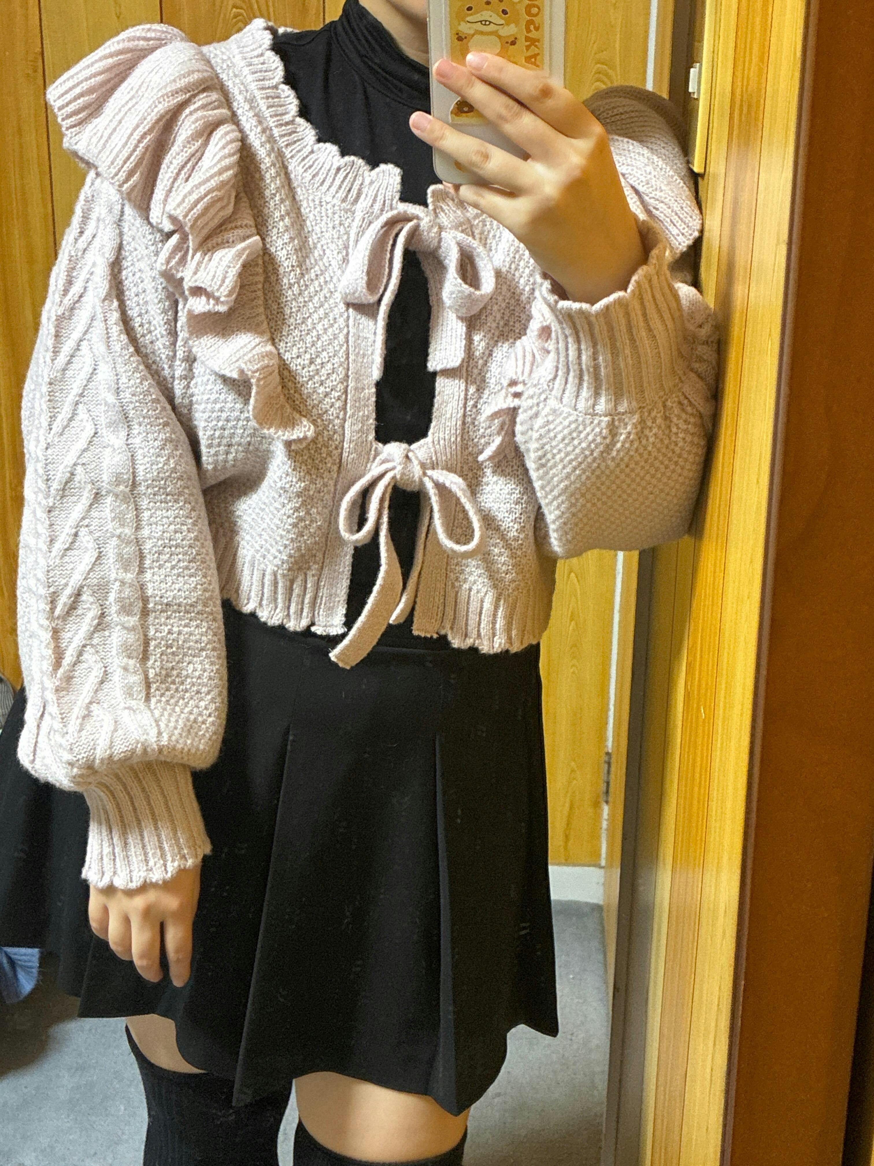 ふりっとしたショルダーフリルやダブルリボンが可愛いショートカーデ。