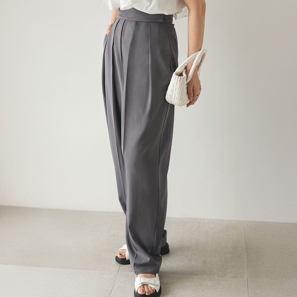 フロントのダブルタックが、ウエストからヒップにかけて丸みを帯びたシルエットを生み出します。