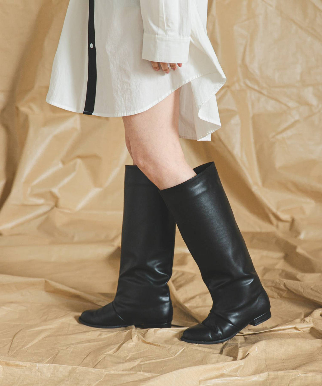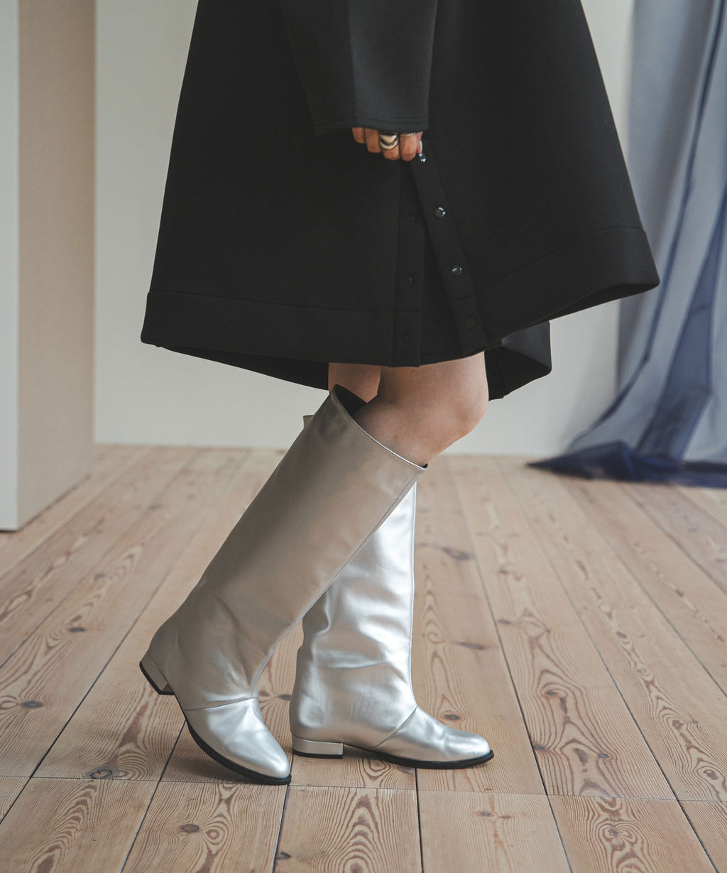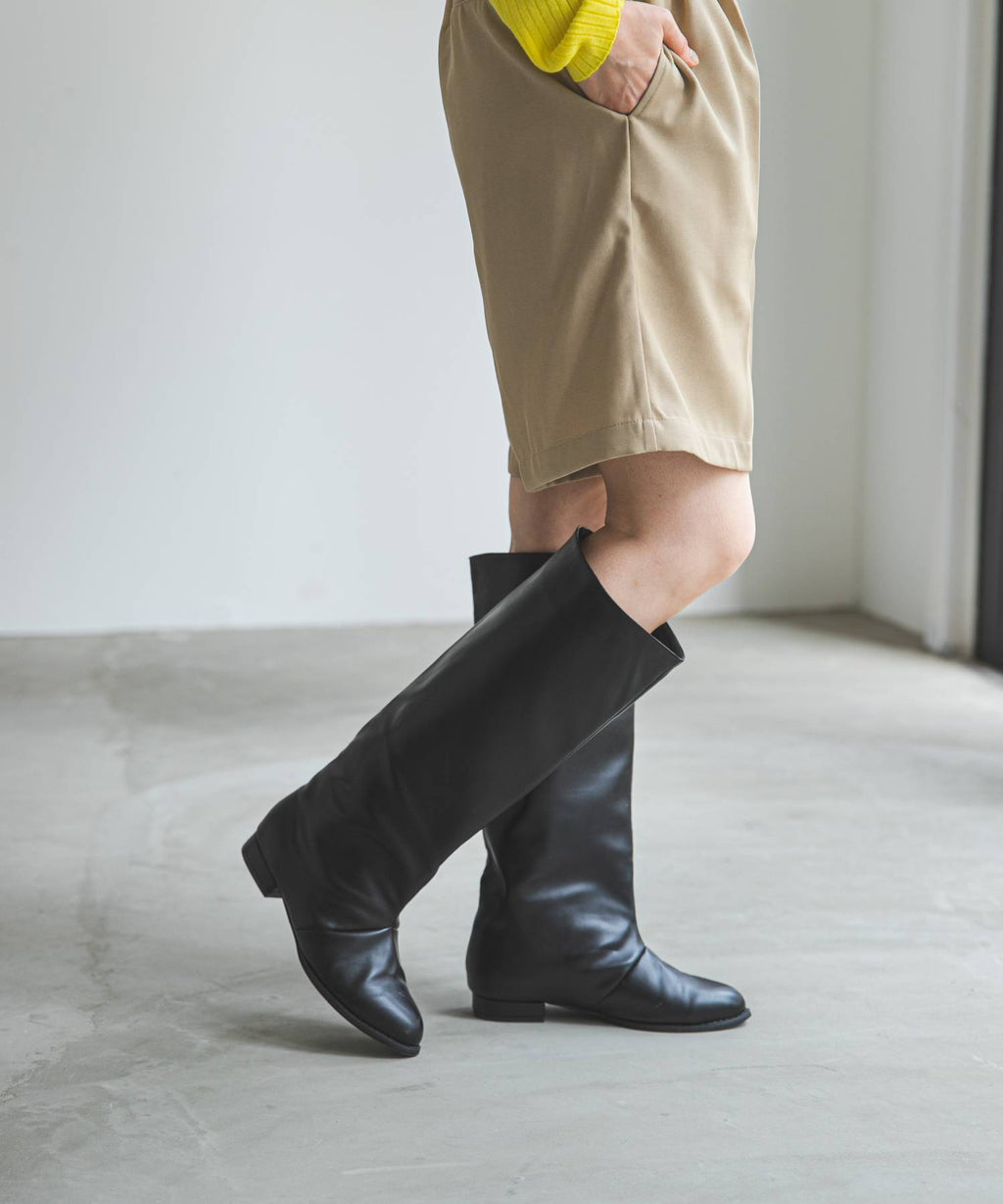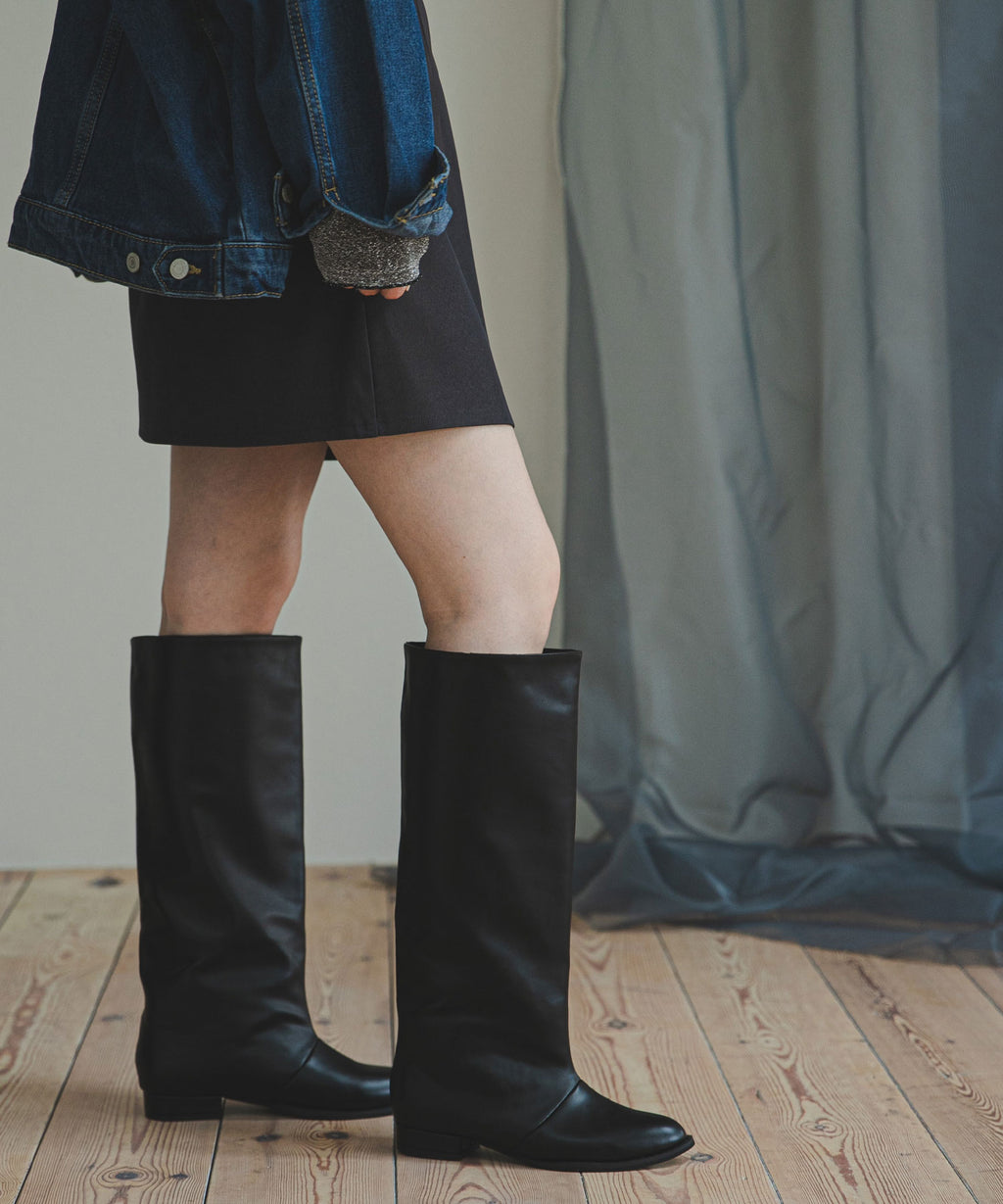 ストレートなワイドシャフトが旬の足元に導いてくれるロングブーツ。