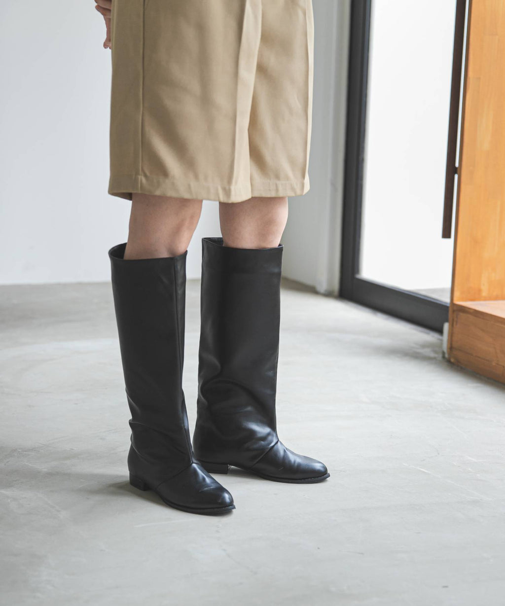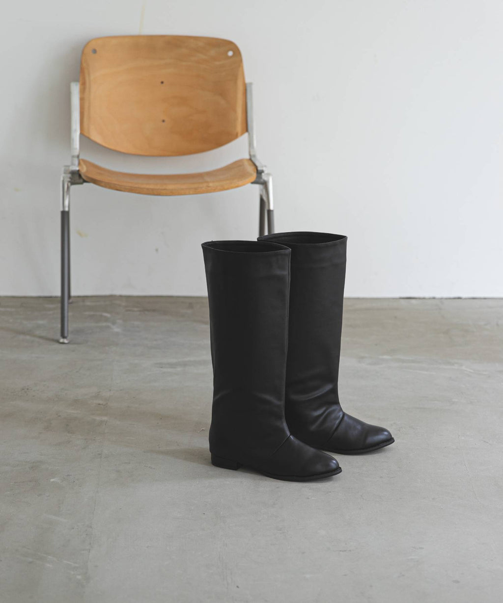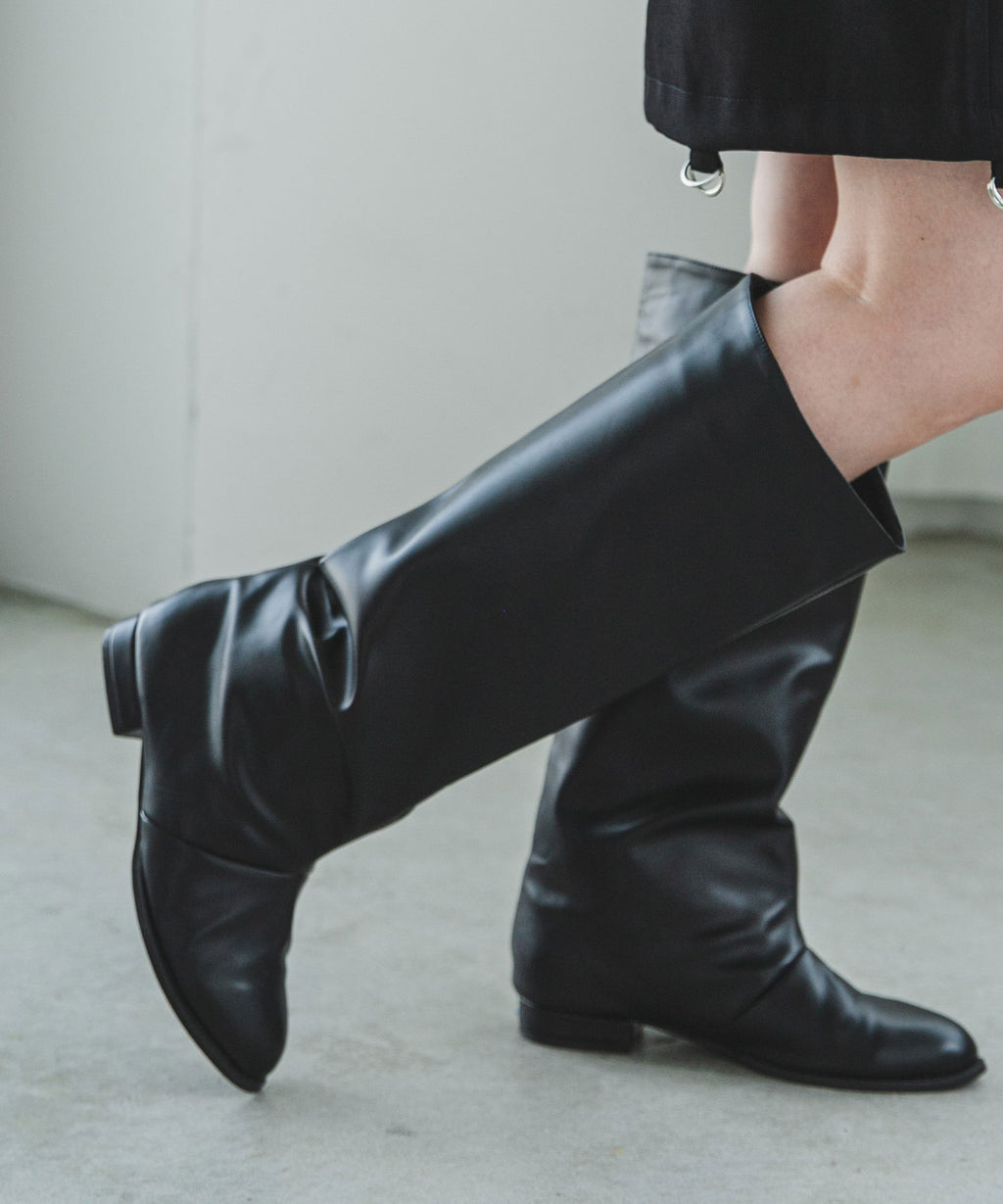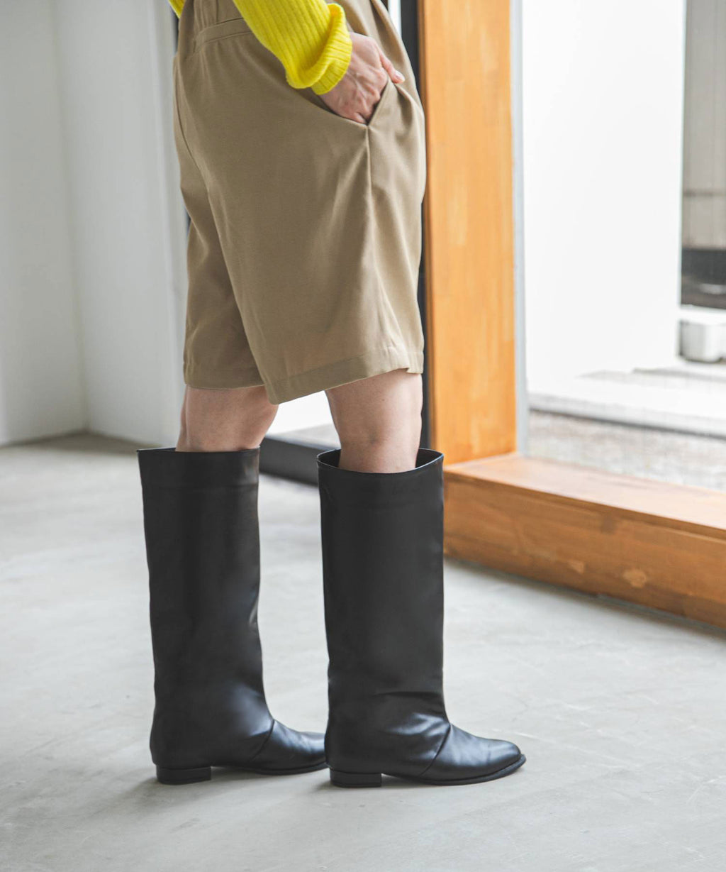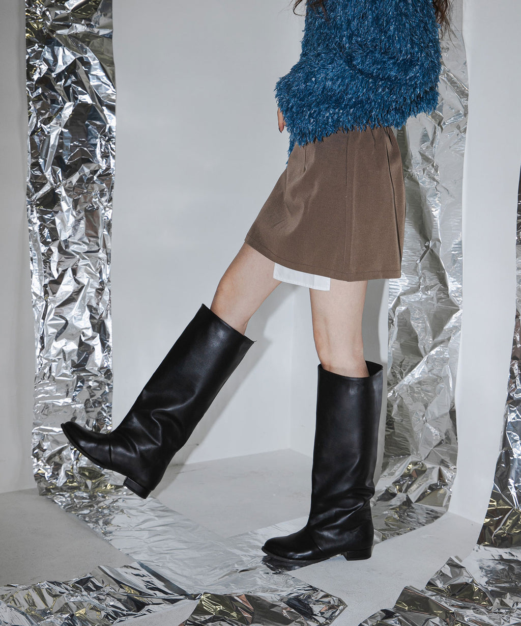 ストレートなワイドシャフトが旬の足元に導いてくれるロングブーツ。