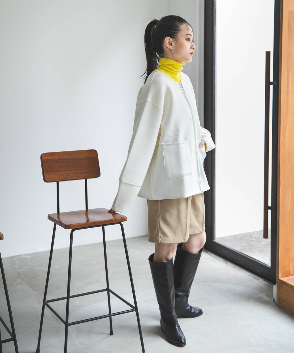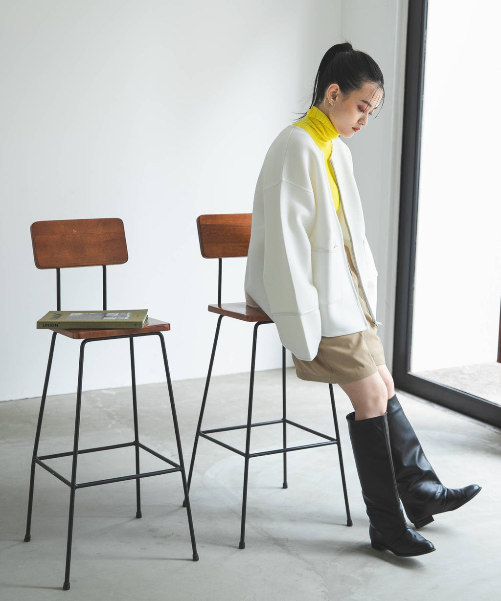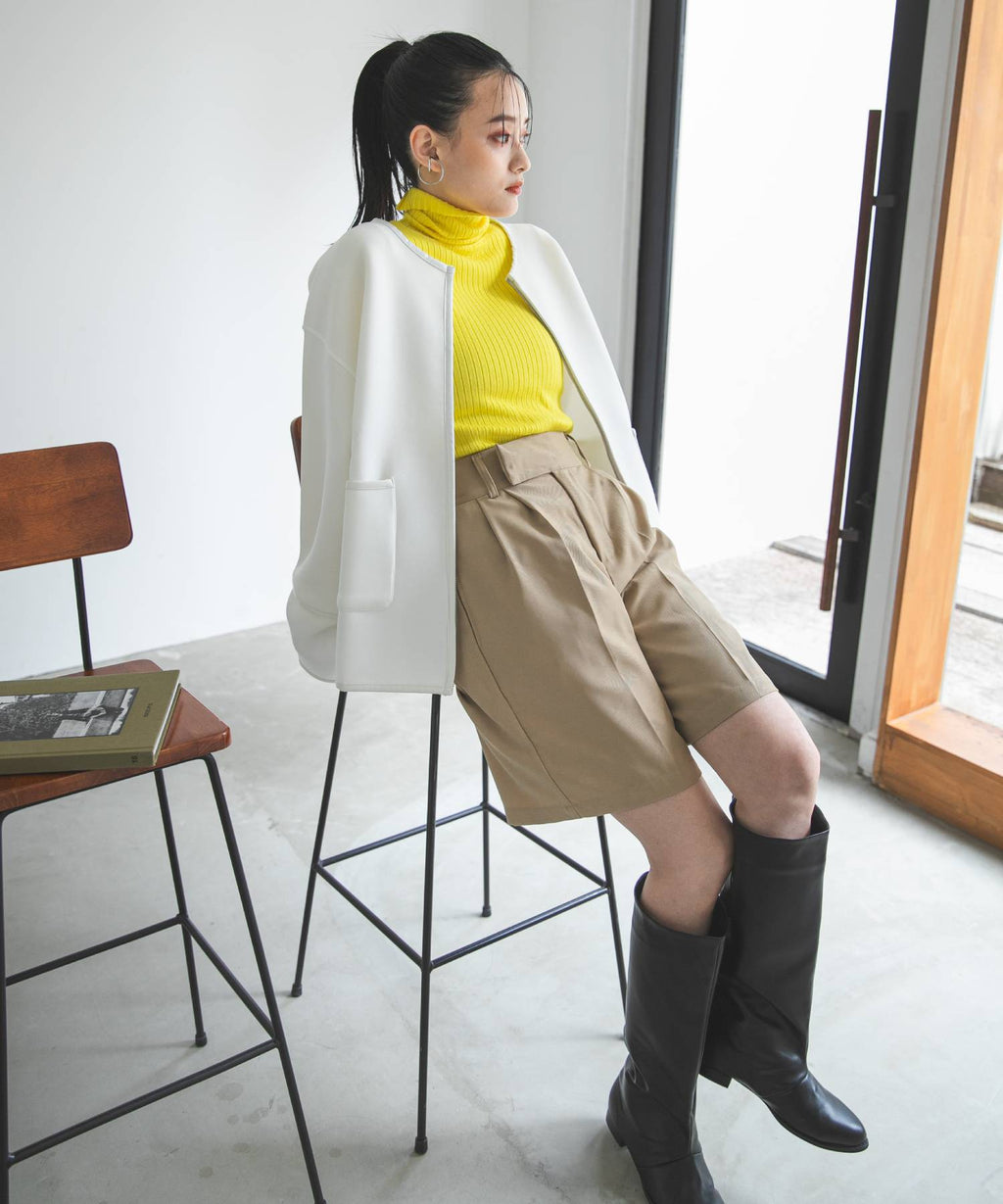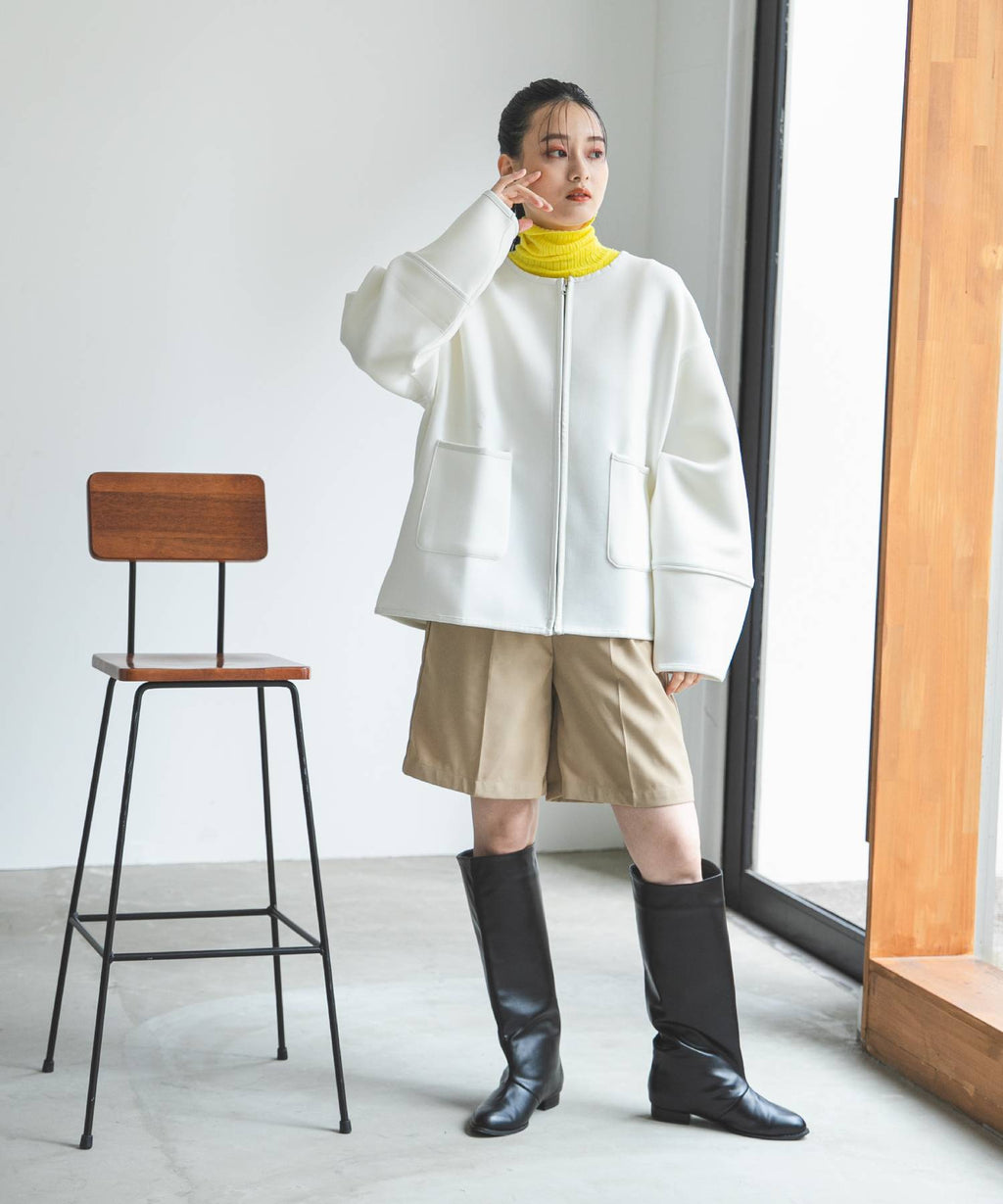 ミニ丈や膝丈のショートボトムとの合わせがおすすめ。