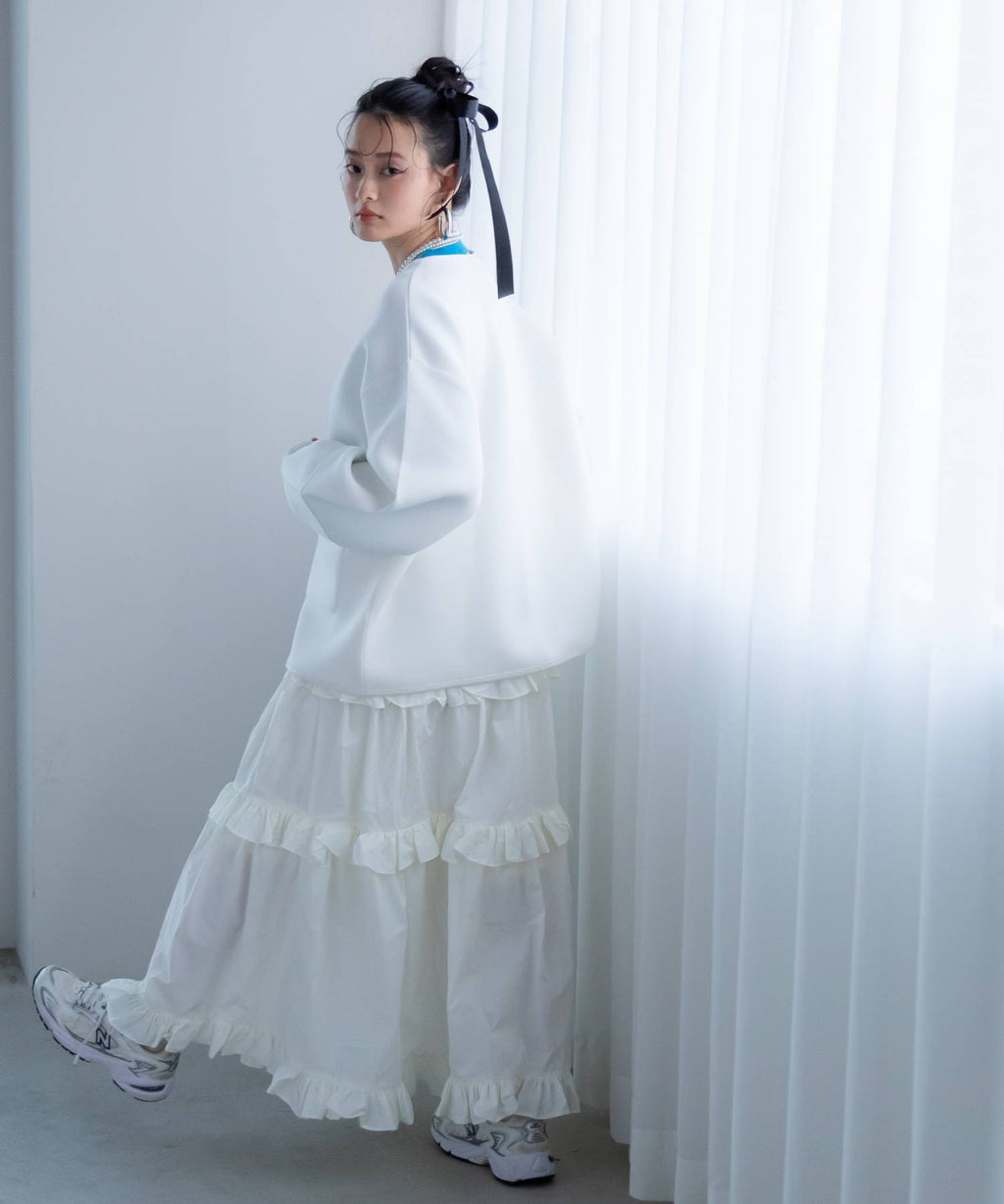 ゆったりとしたワイドシルエットとランタンスリーブがアクセント