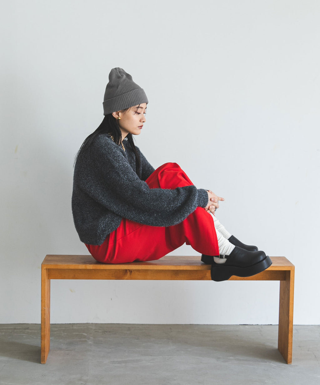 畦編みで膨らみを出し、暖かみと存在感を際立たせた1枚です。