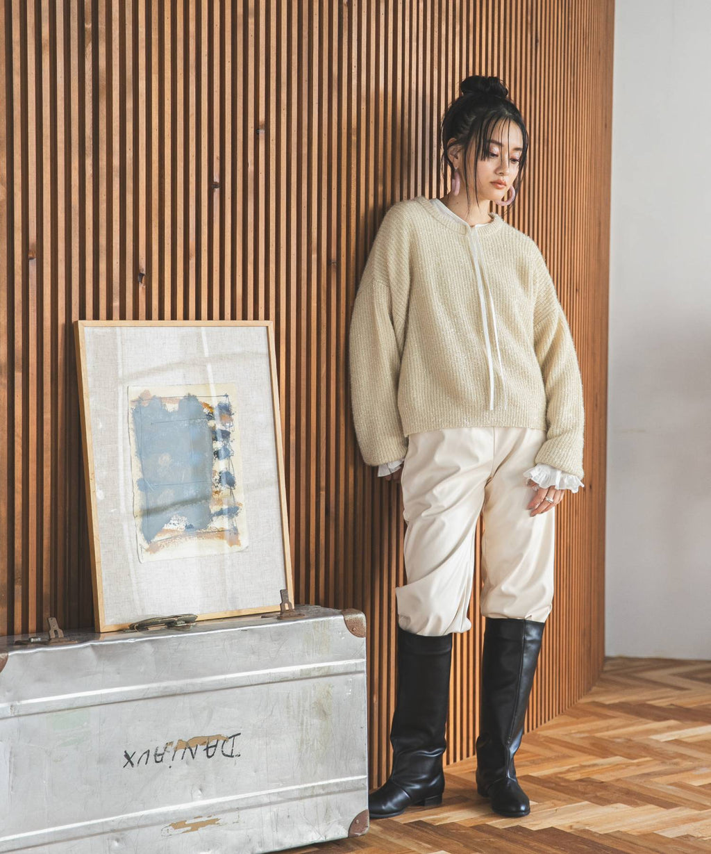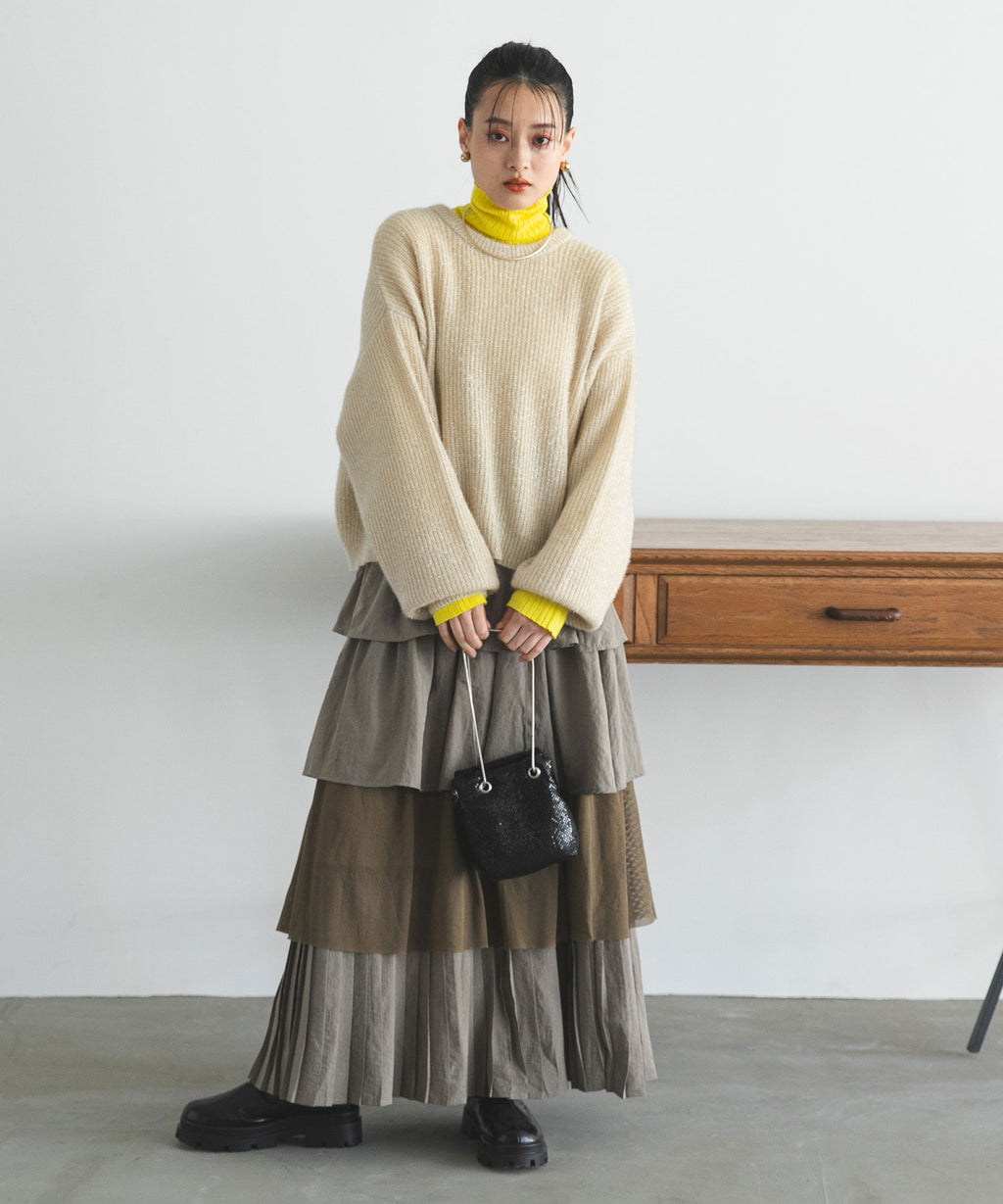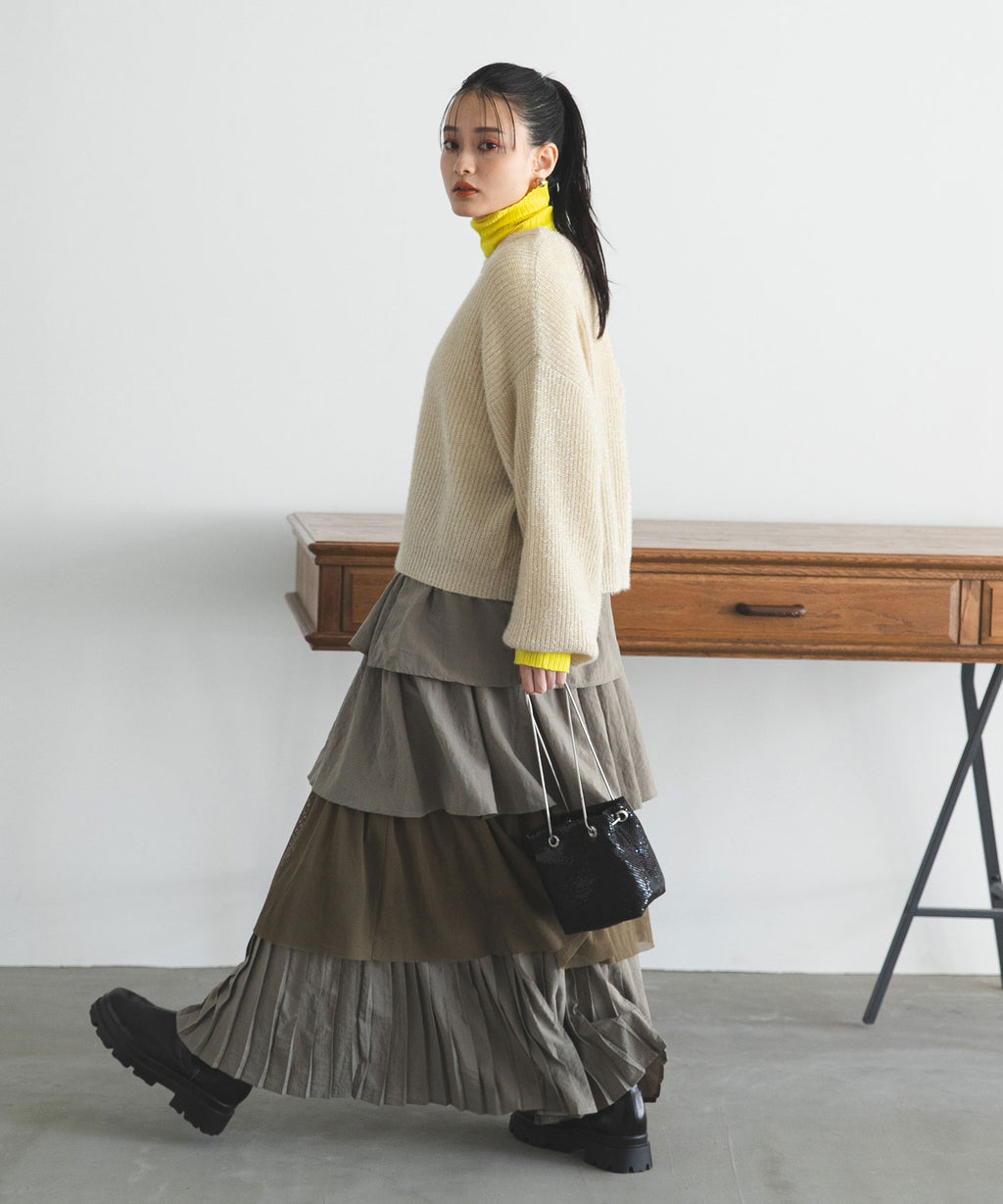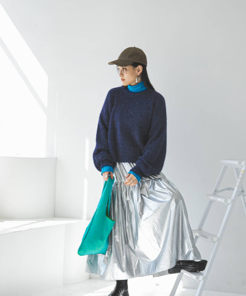 カラーリブタートル、シアーアイテムなどと合わしたレイヤードコーデがおすすめ。