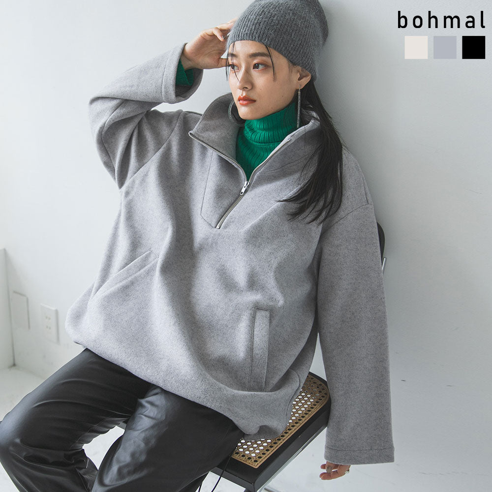 オーバーサイズシルエットなので、スッキリしたボトムがおすすめ。