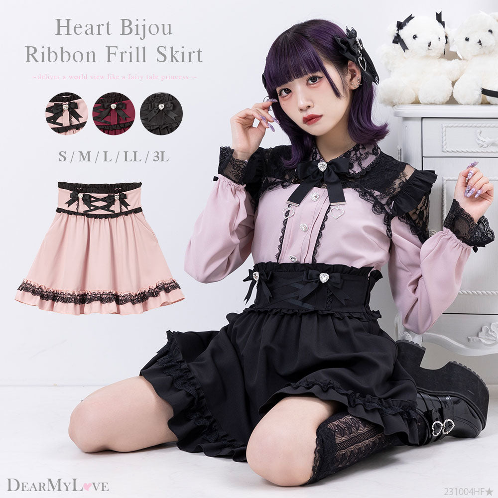 ウエストベルトデザインにレースアップ、ハートビジュー付きのかわいいスカート