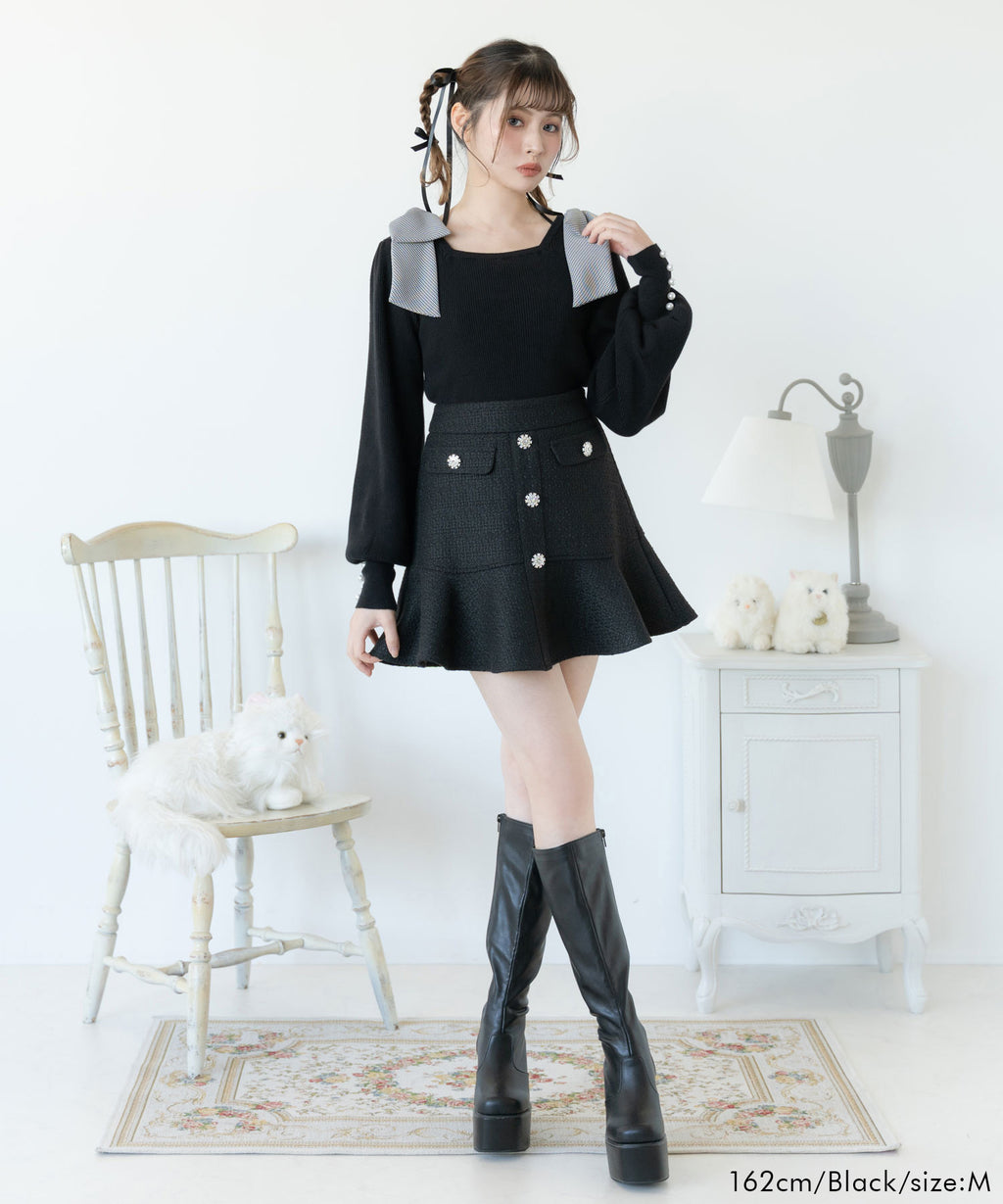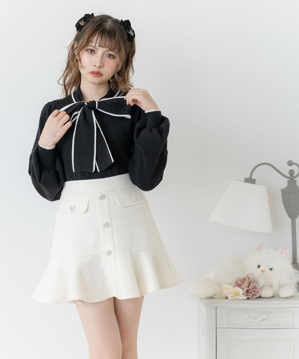 シンプルなボウタイや丸襟のブラウスを合わせたり、Roseのビジューニット等を合わせればシーズンムード高まるコーデに♪