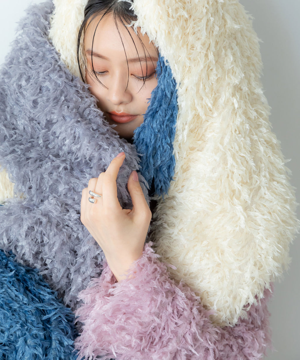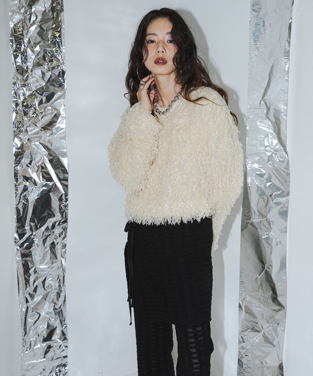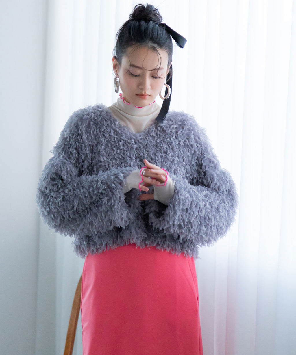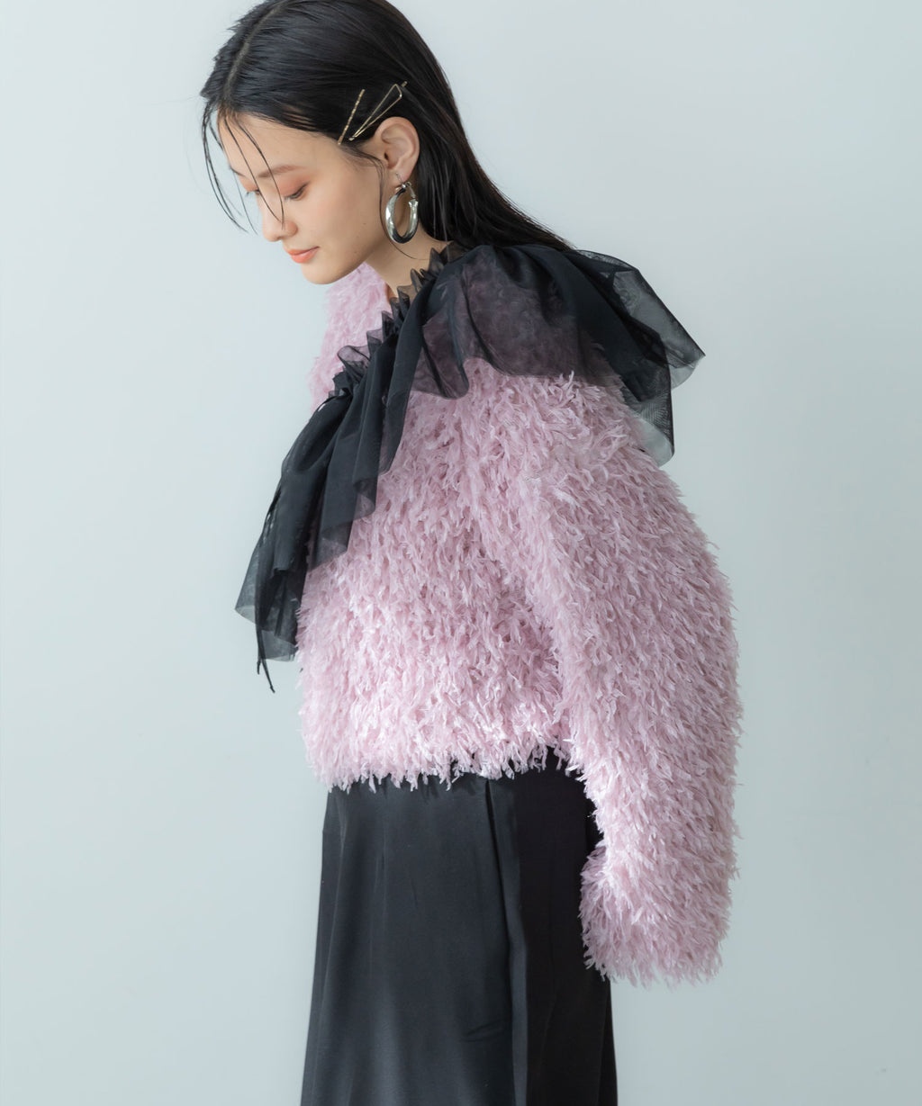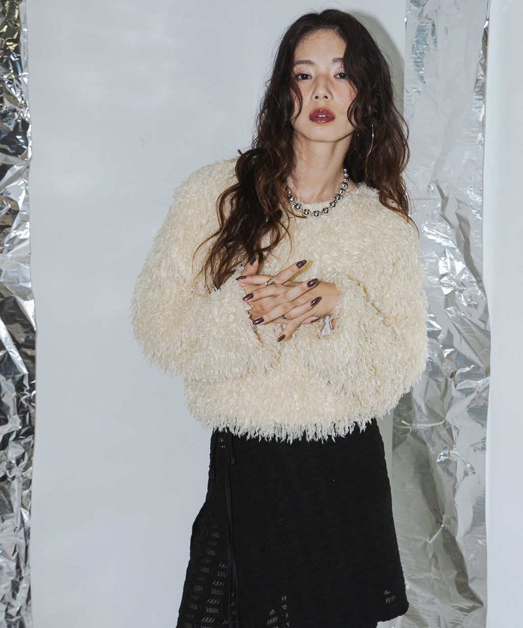 ふわっとしたフリンジの編み地で女性らしい立体的なシルエットに。