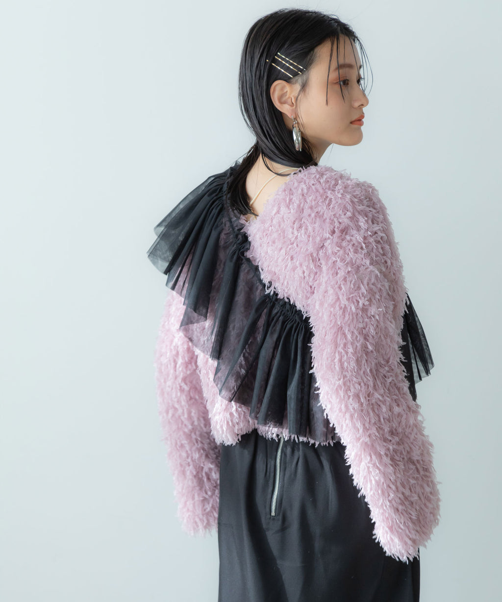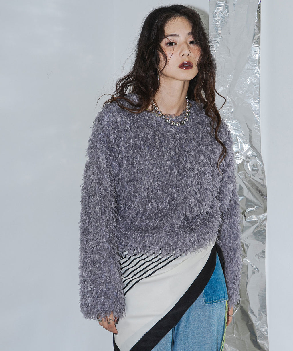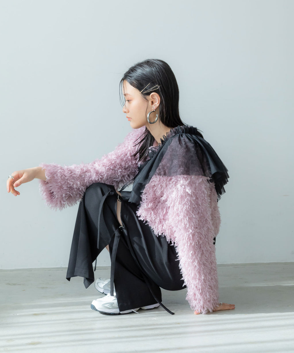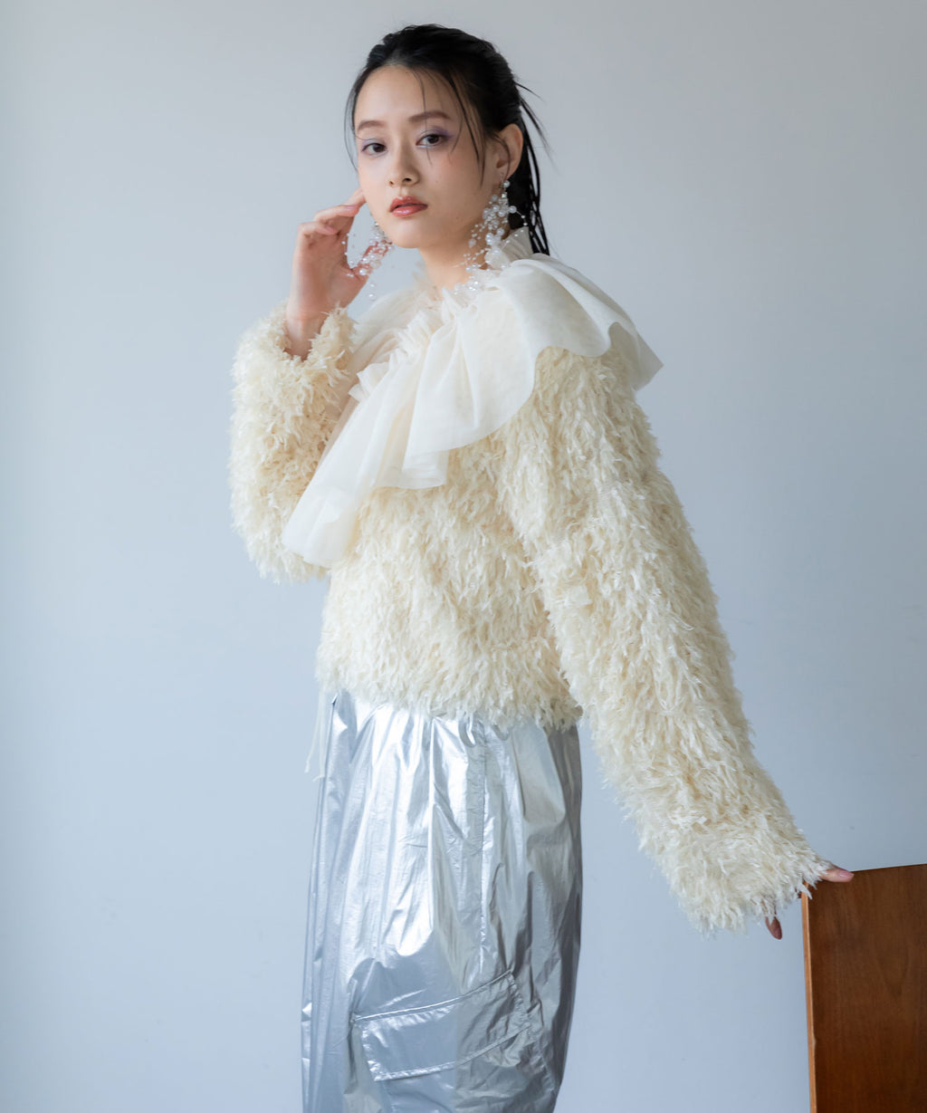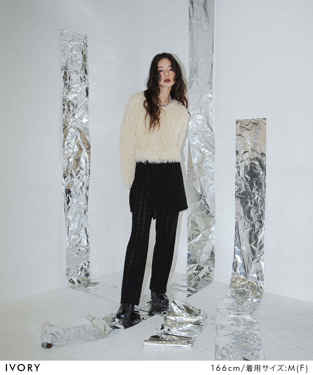 ふわっとしたフリンジの編み地で女性らしい立体的なシルエットに。