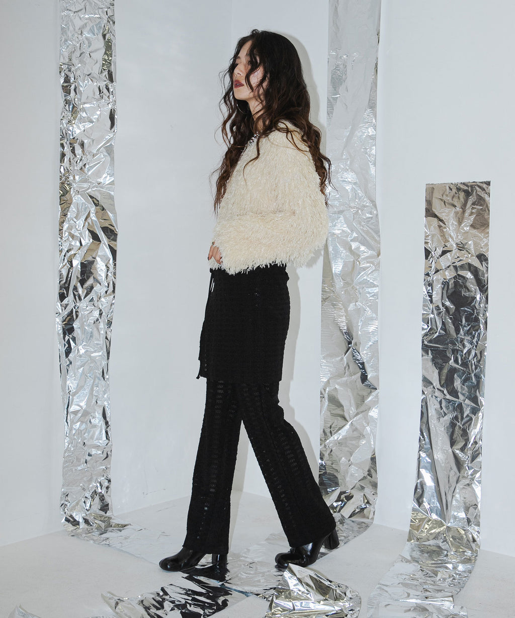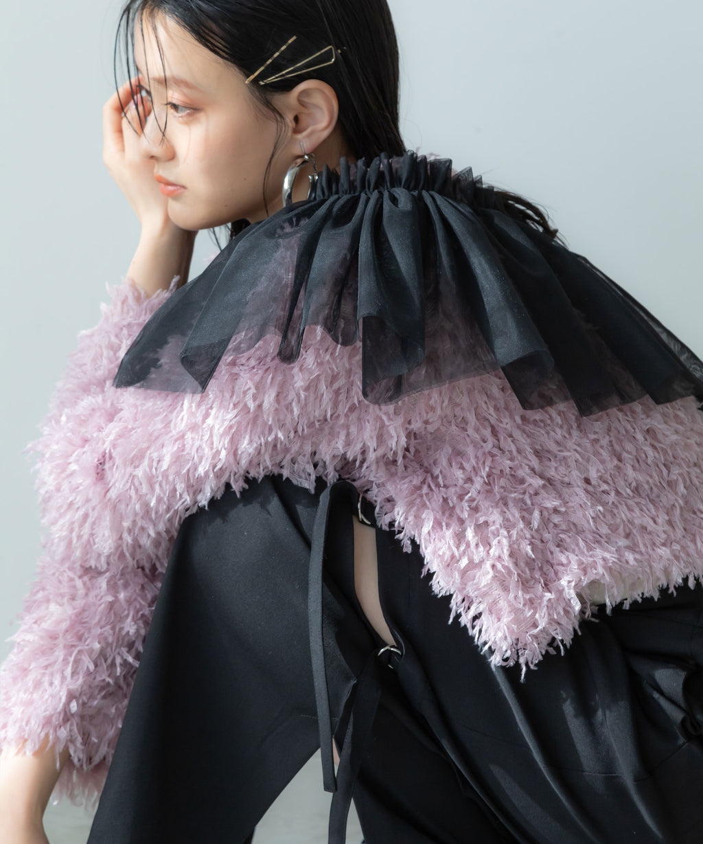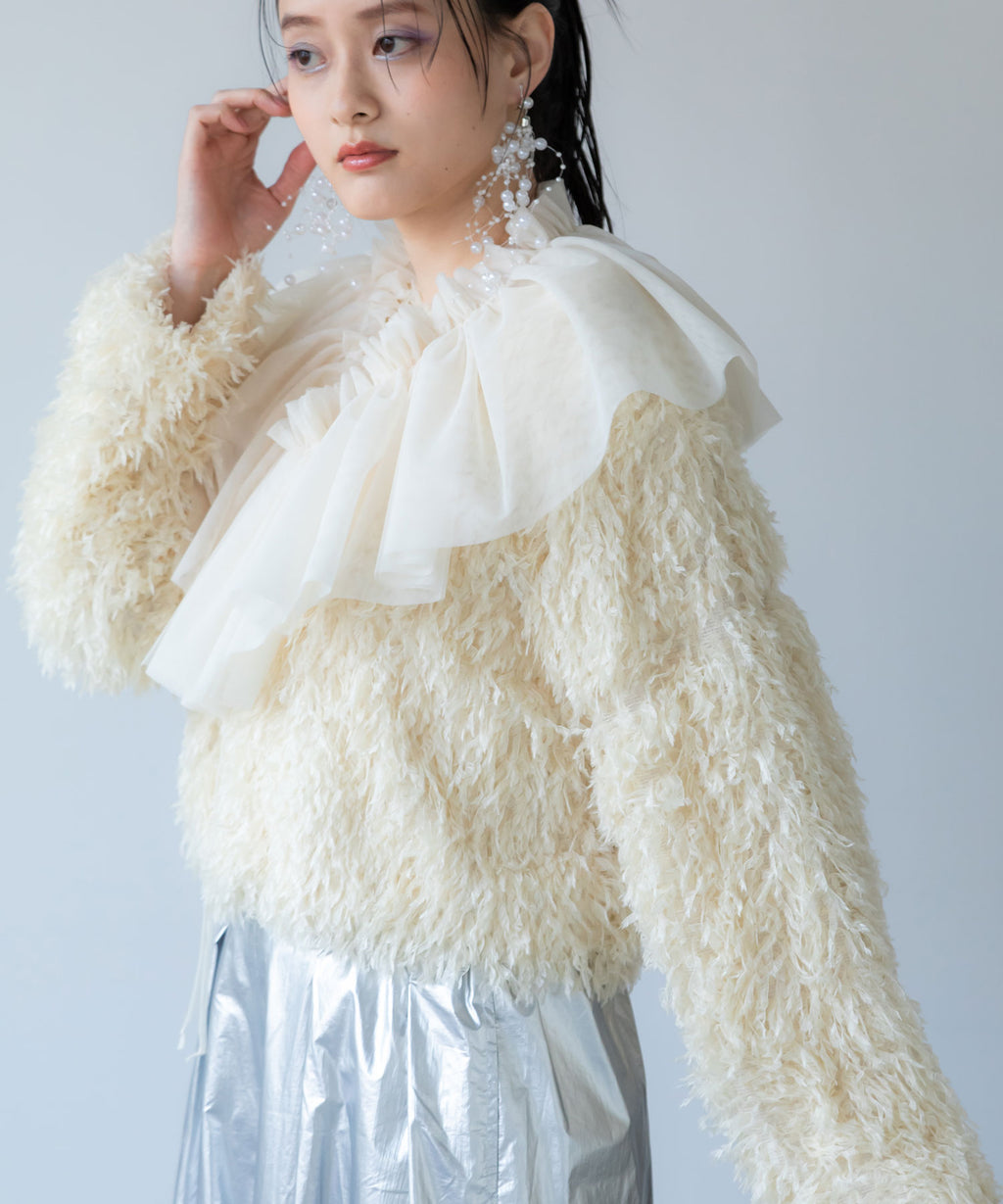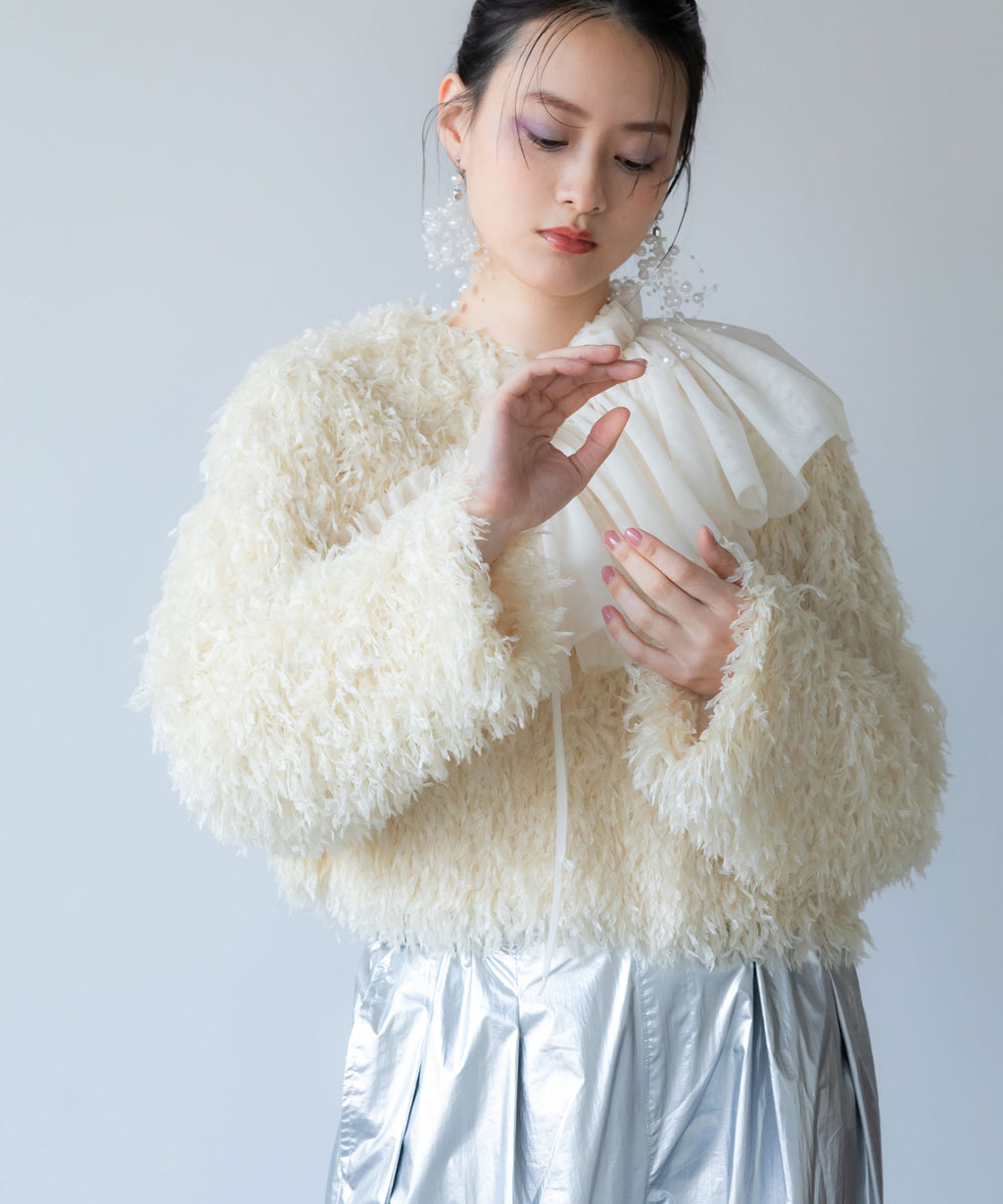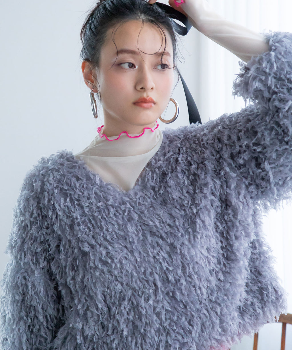 ふわっとしたフリンジの編み地で女性らしい立体的なシルエットに。