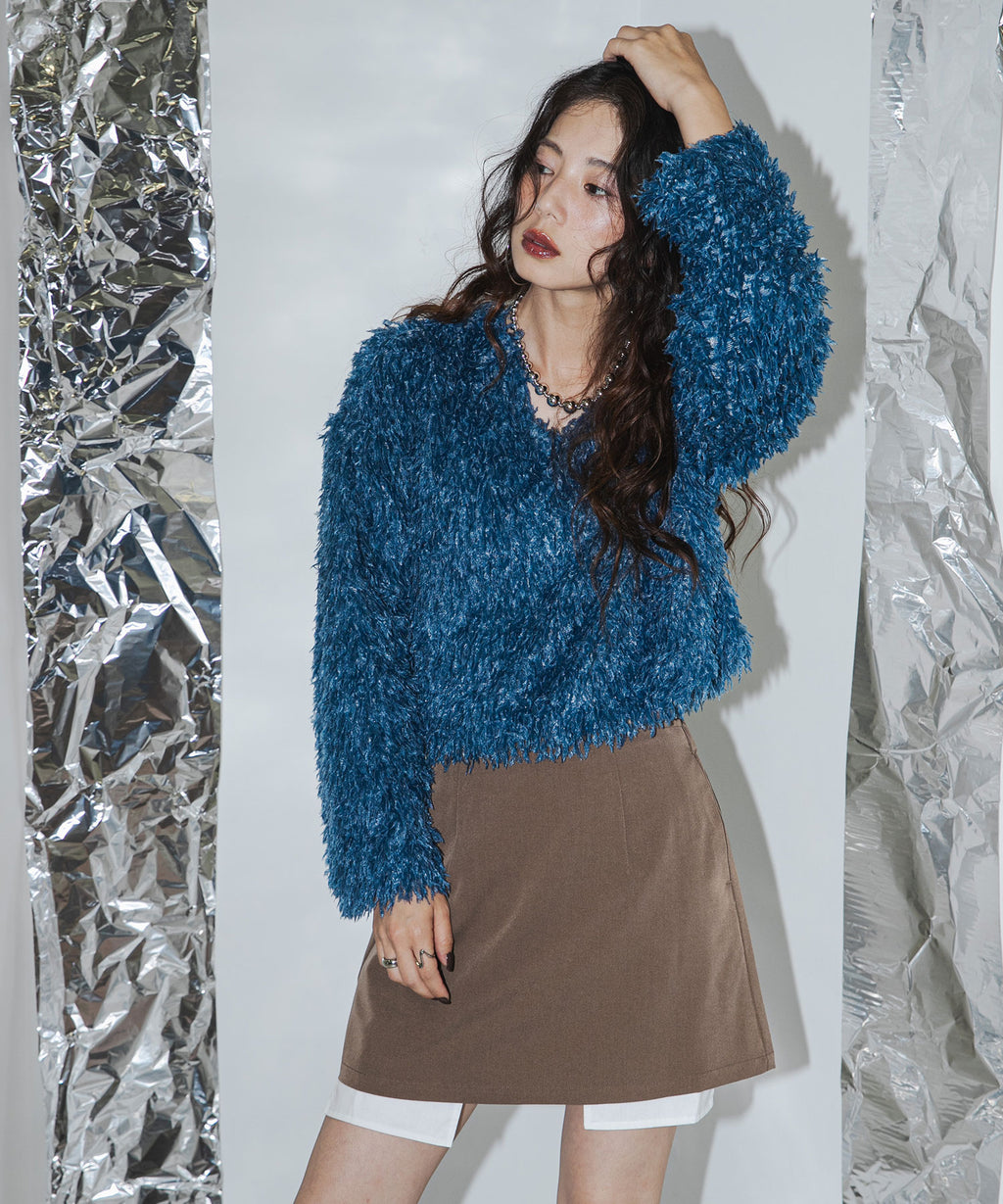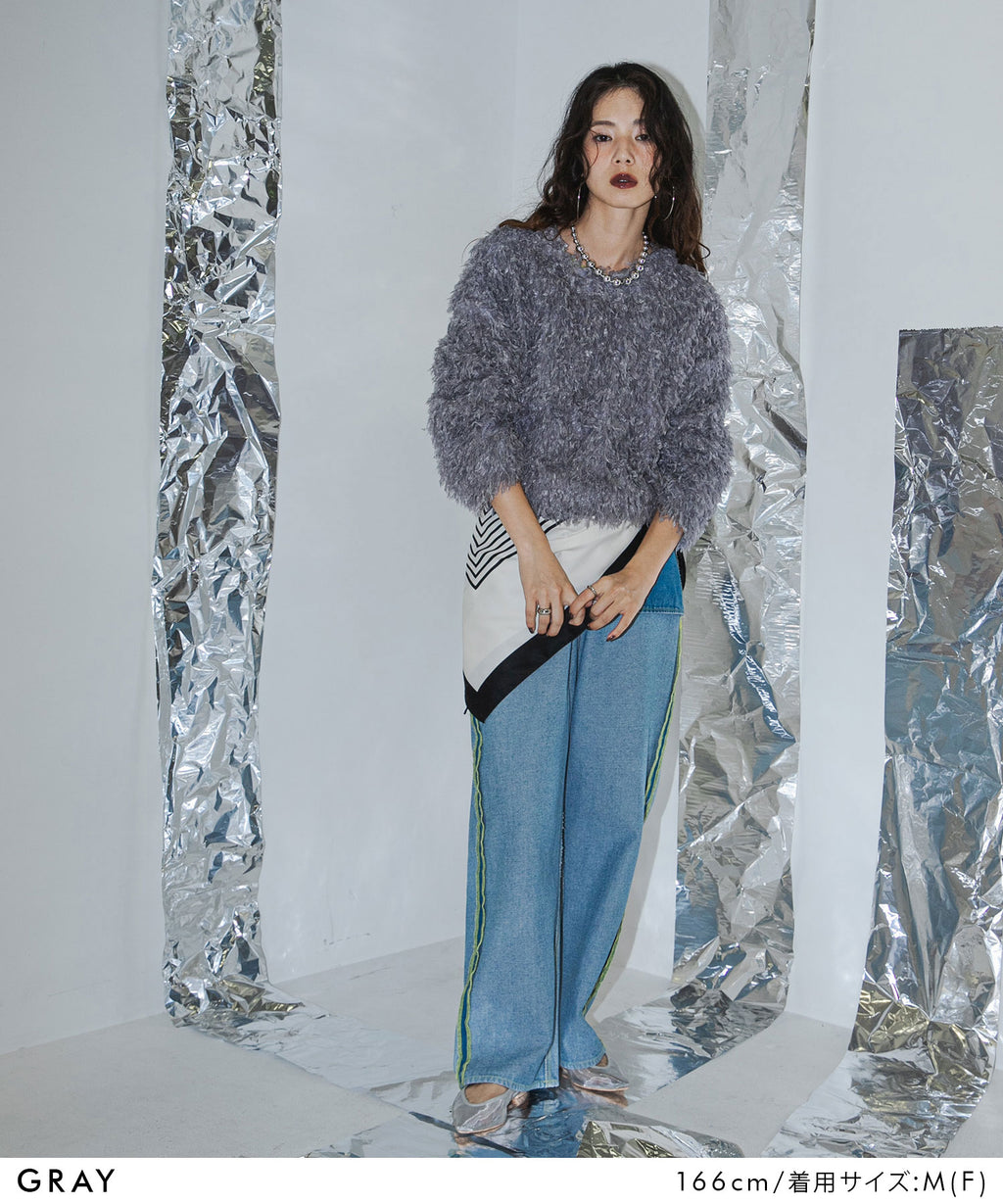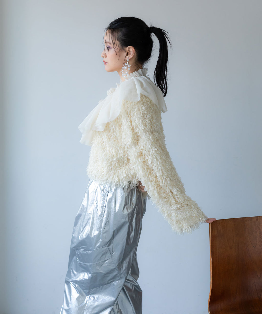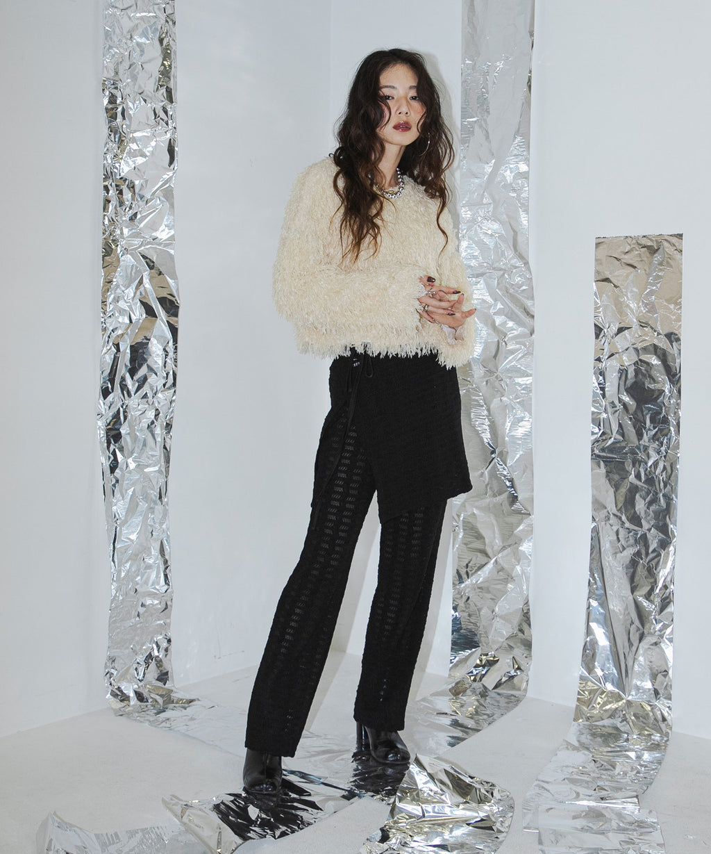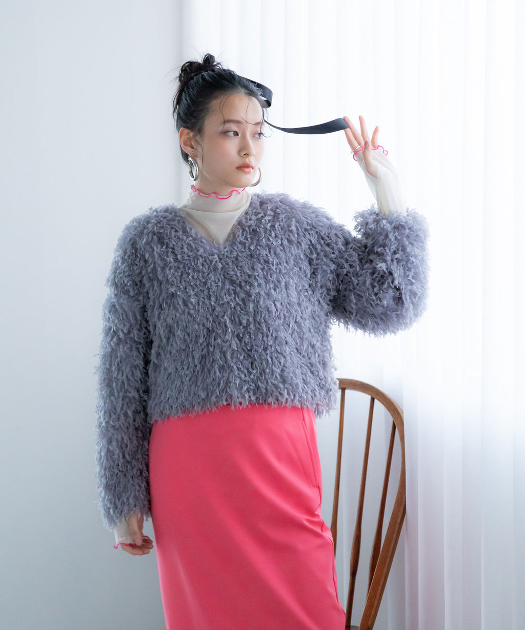 ふわっとしたフリンジの編み地で女性らしい立体的なシルエットに。