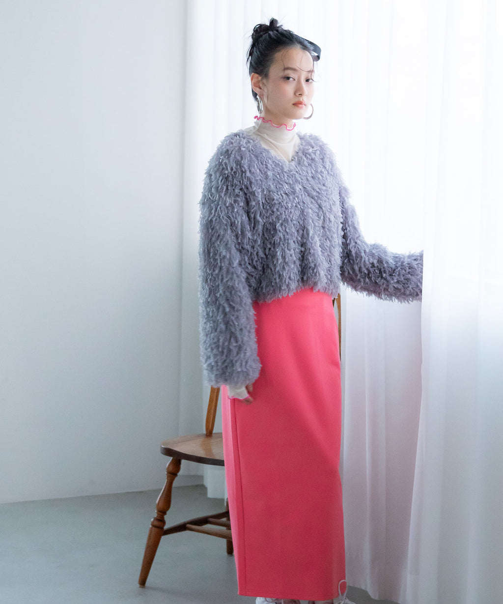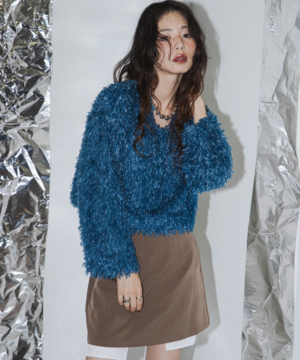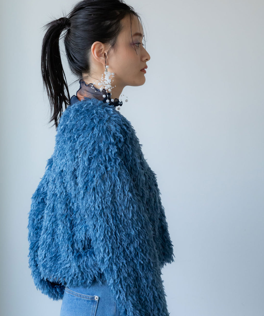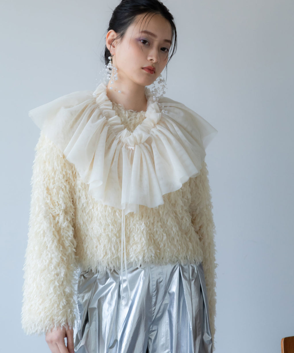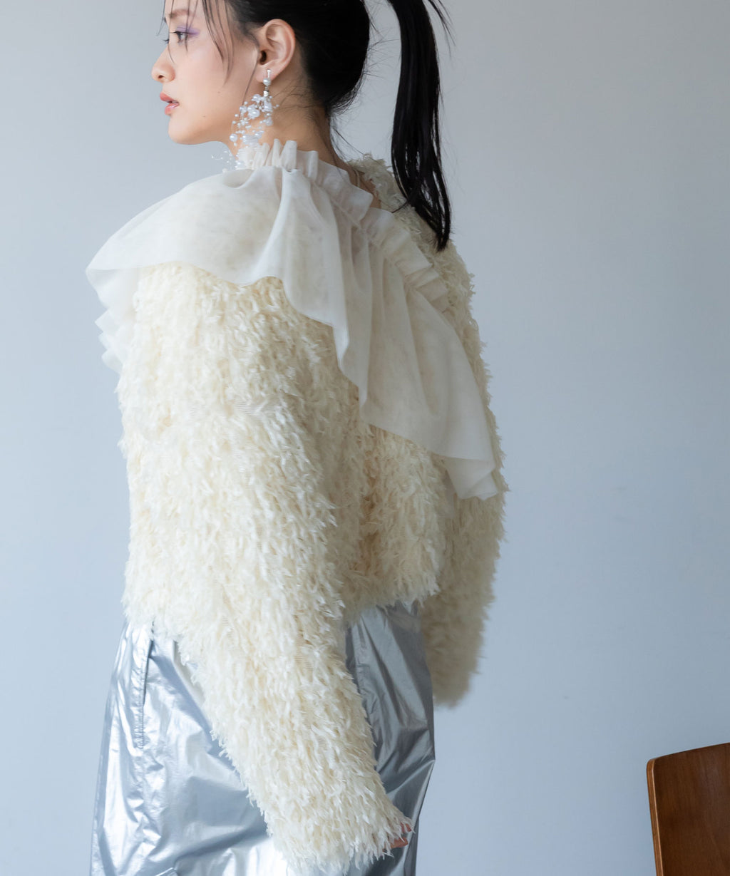 ふわっとしたフリンジの編み地で女性らしい立体的なシルエットに。