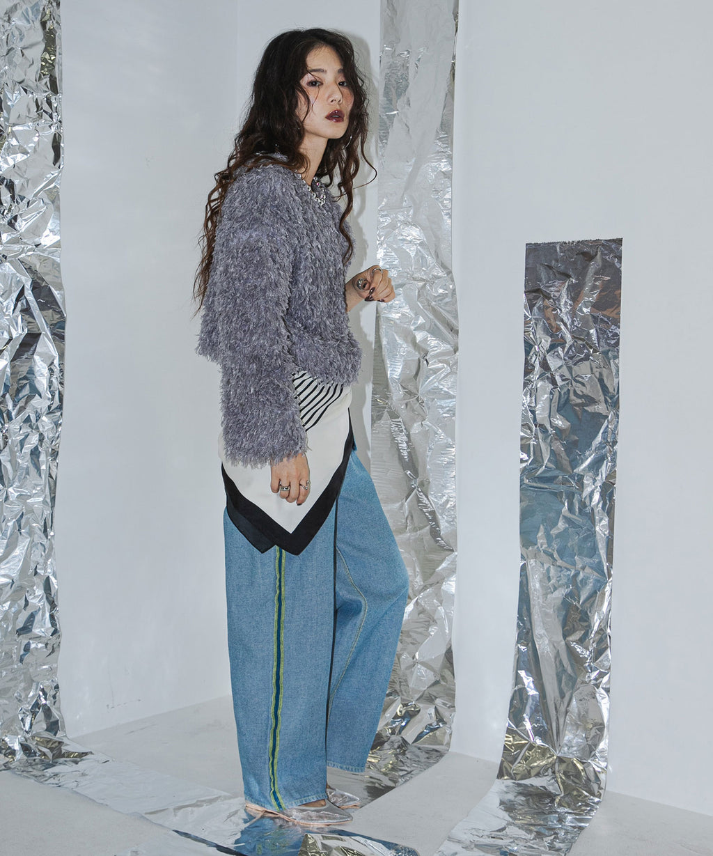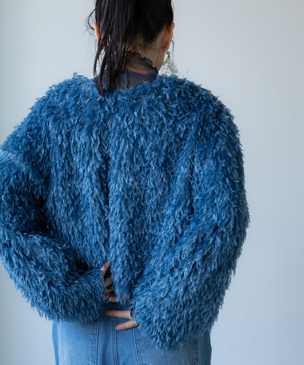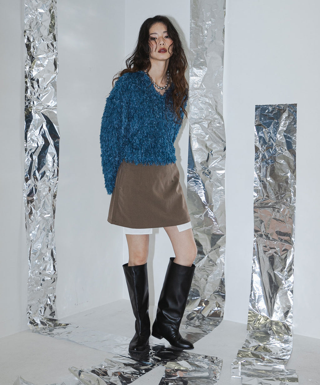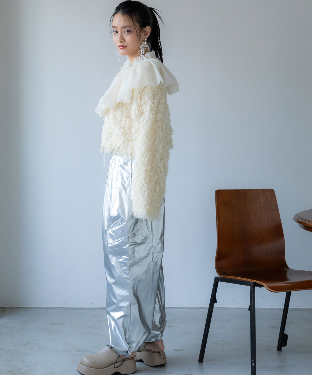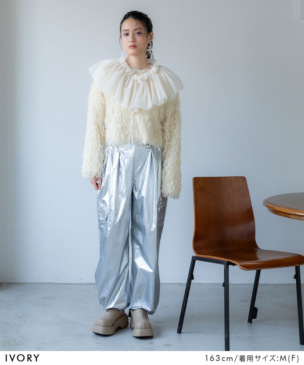 ふわっとしたフリンジの編み地で女性らしい立体的なシルエットに。