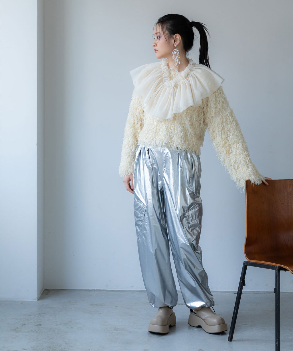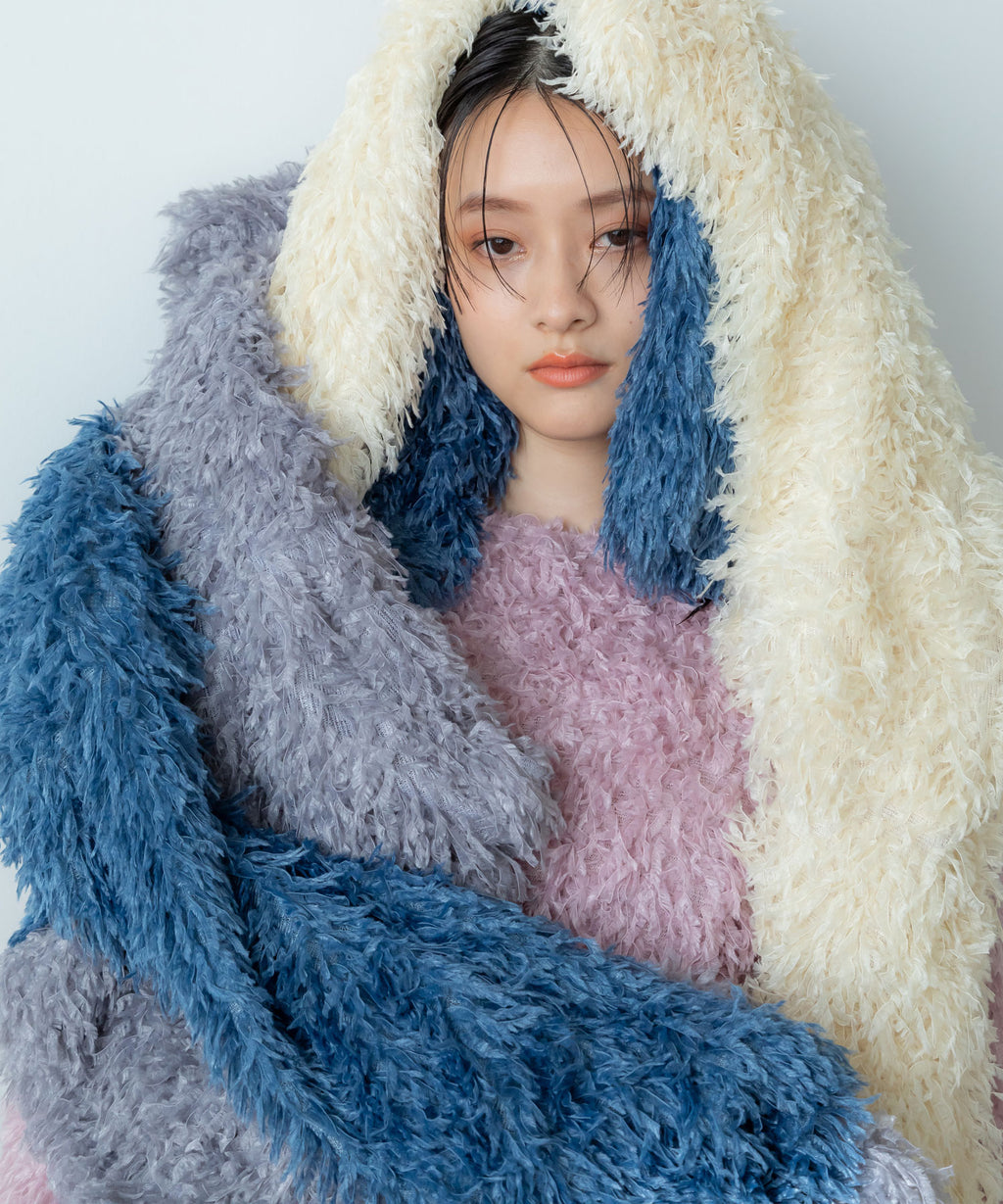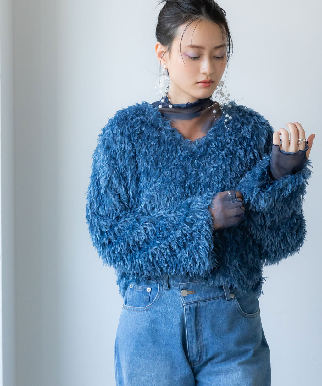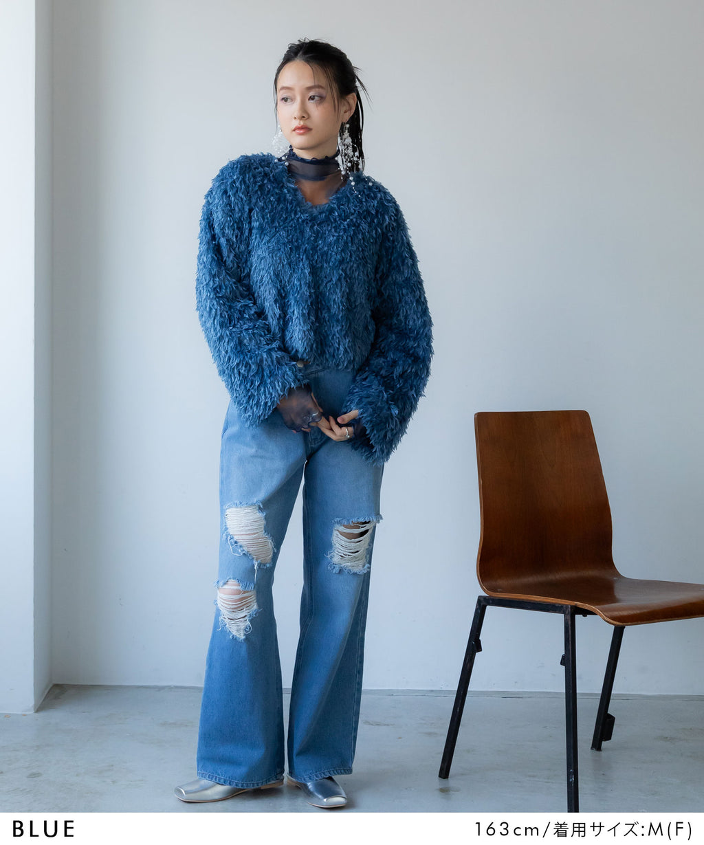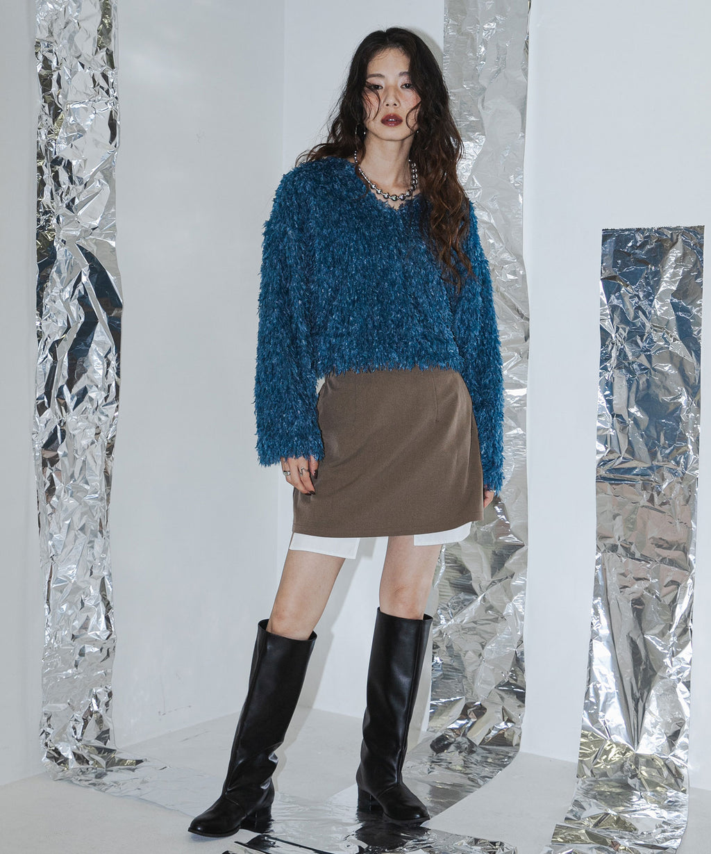ふわっとしたフリンジの編み地で女性らしい立体的なシルエットに。