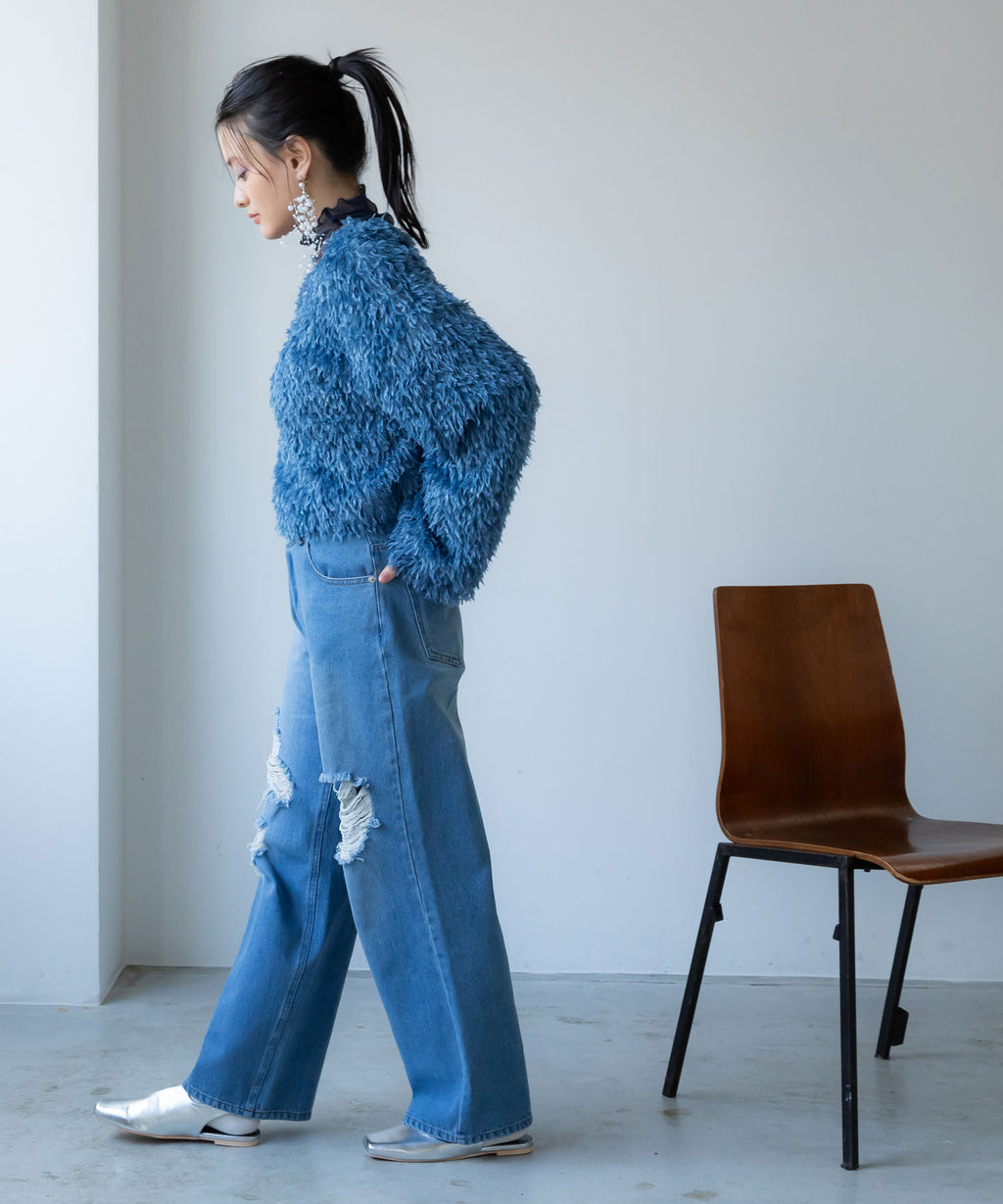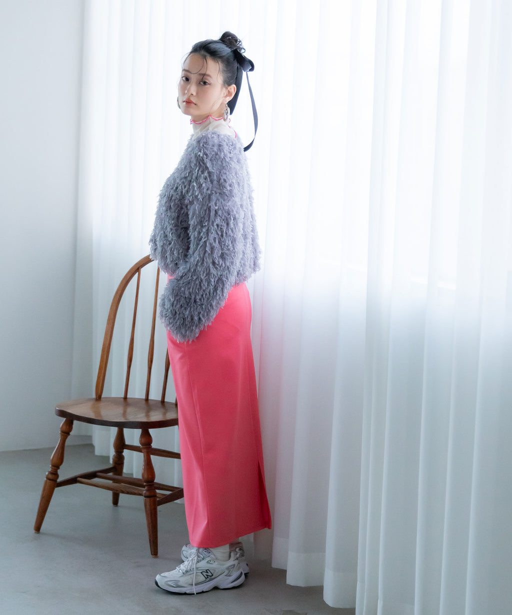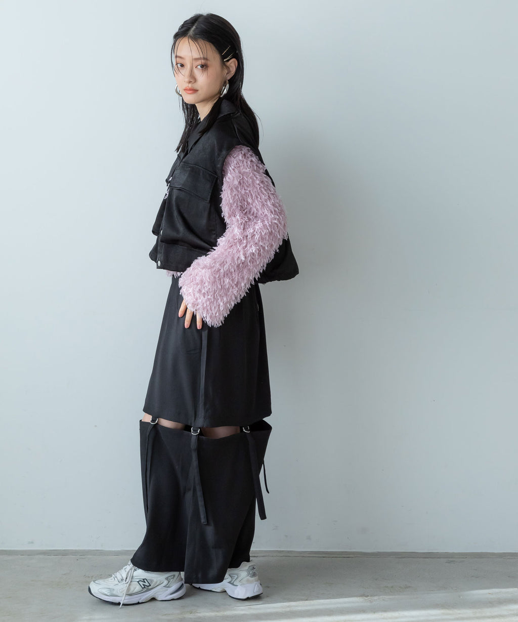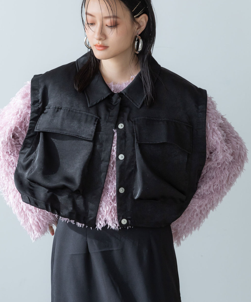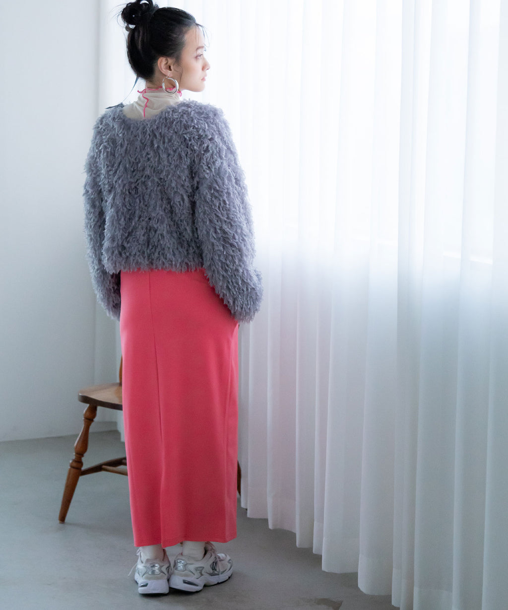 ふわっとしたフリンジの編み地で女性らしい立体的なシルエットに。