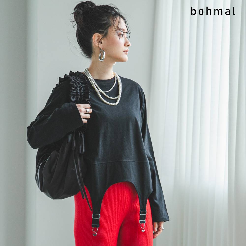 裾のサスペンダー風デザインが目を引く、オシャレトップス。