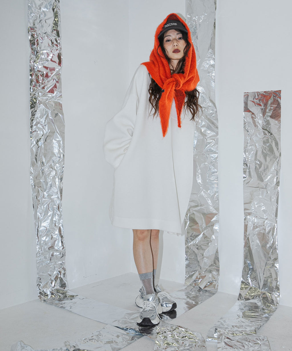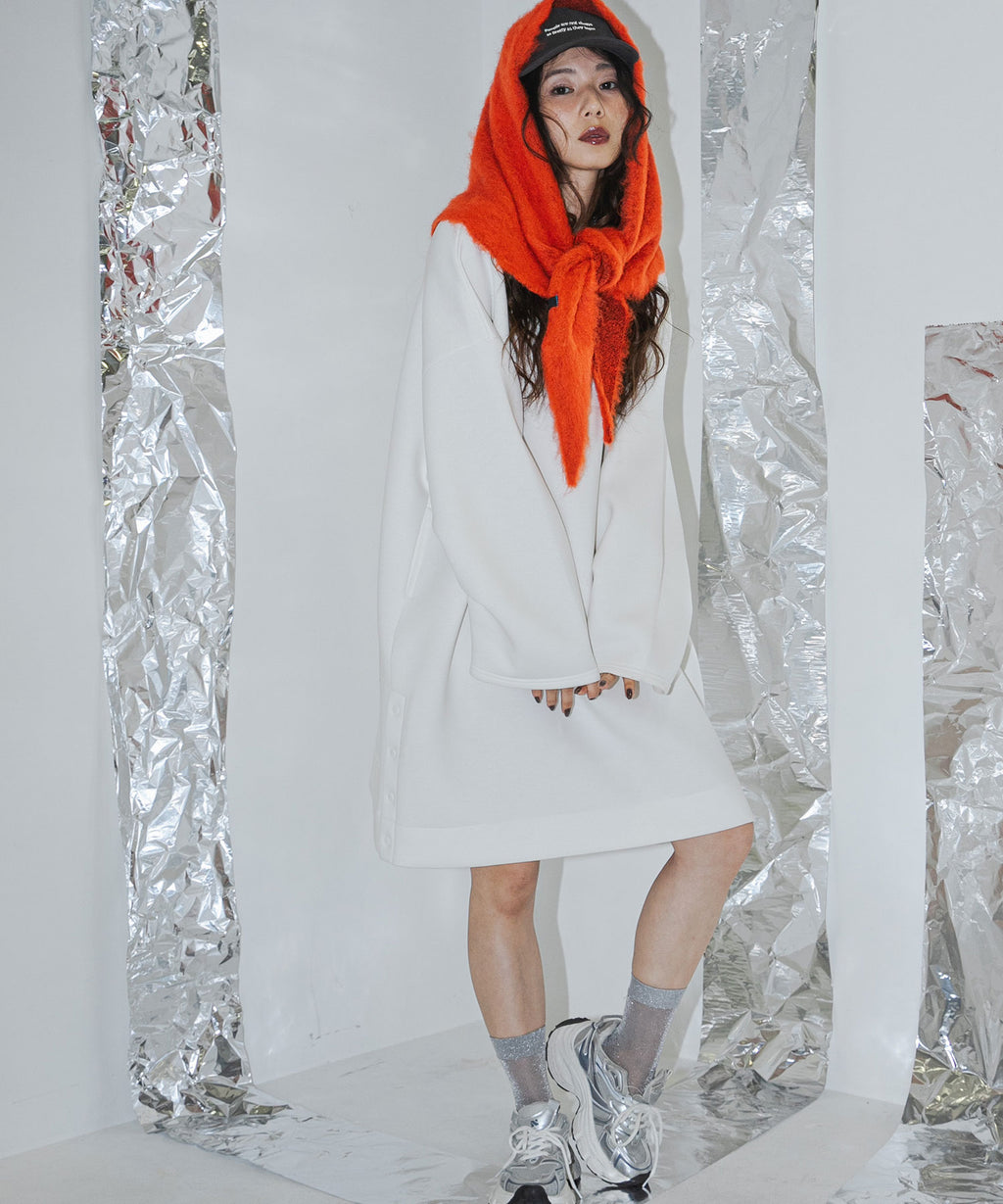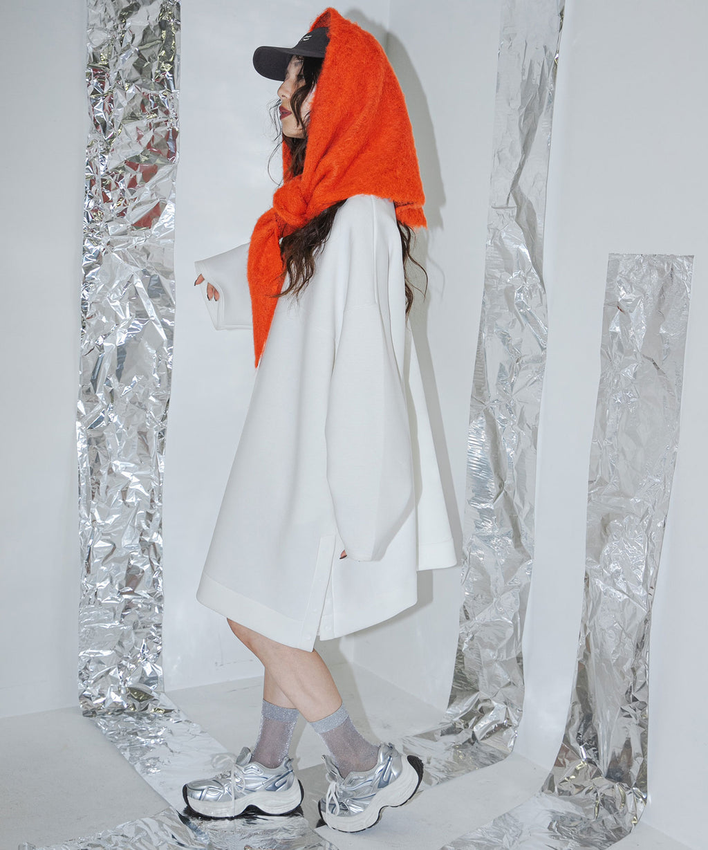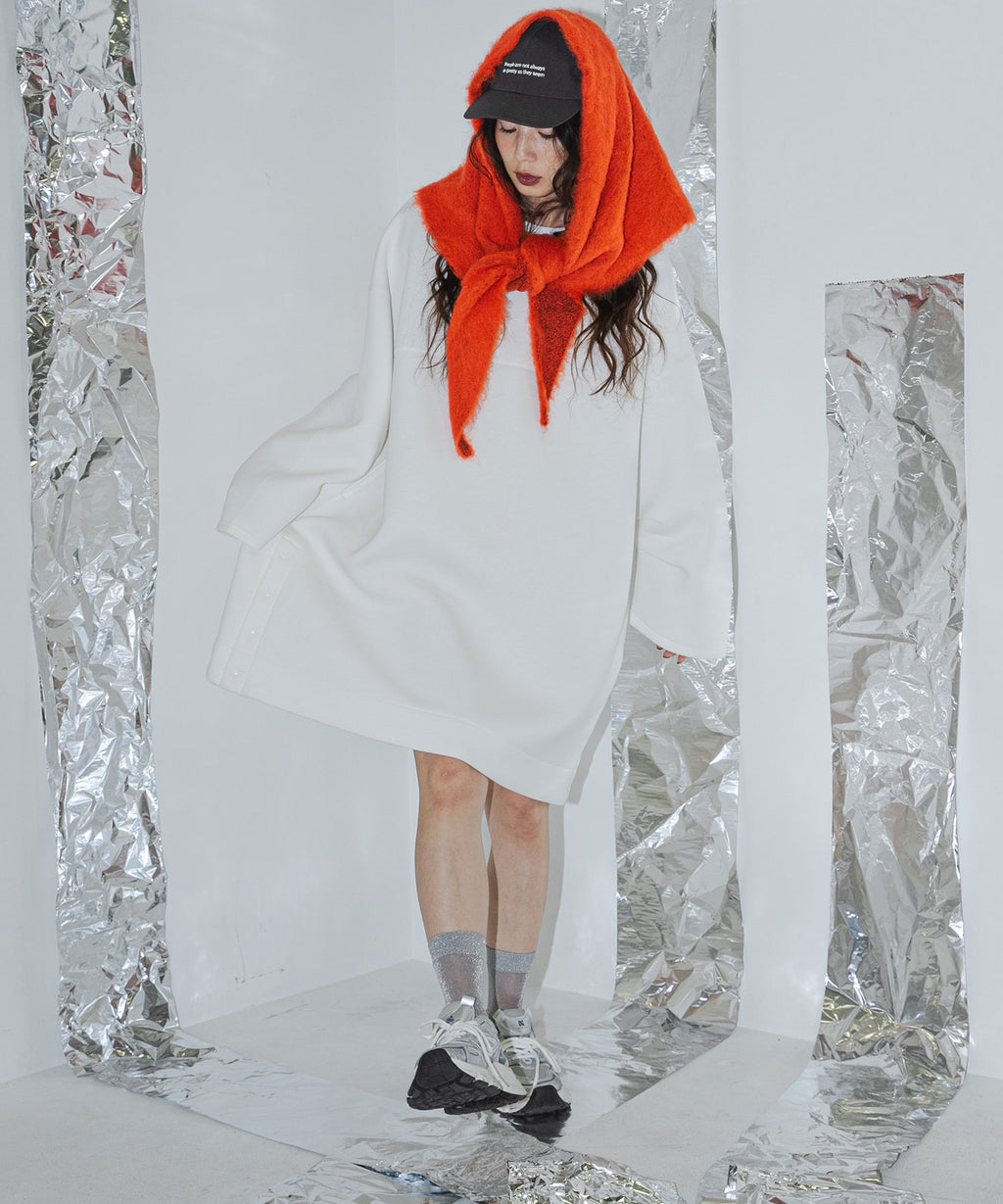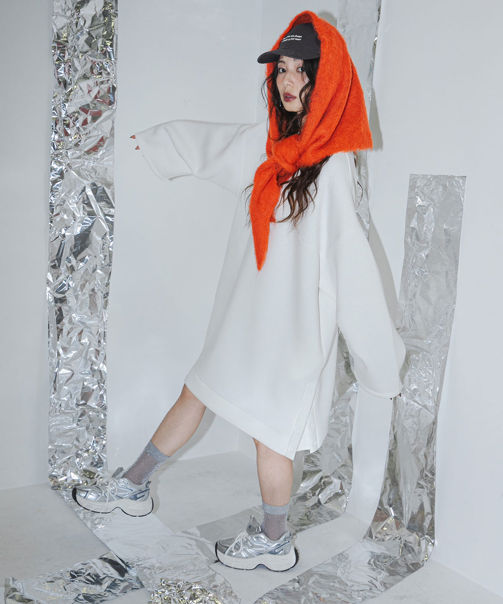 オーバーサイズのシルエットに、あえてミニ丈にする事でカジュアル可愛い着こなしに。