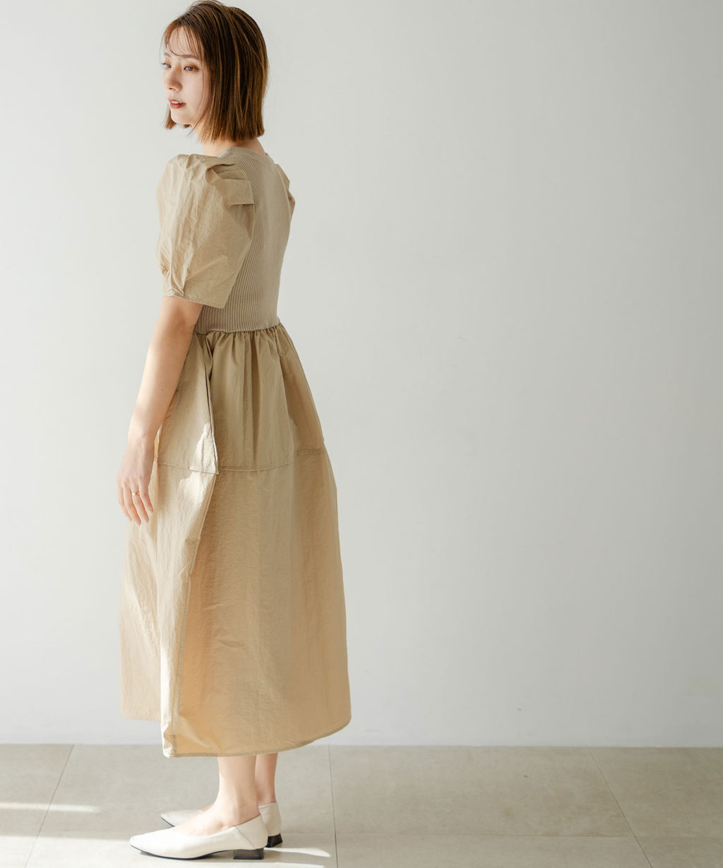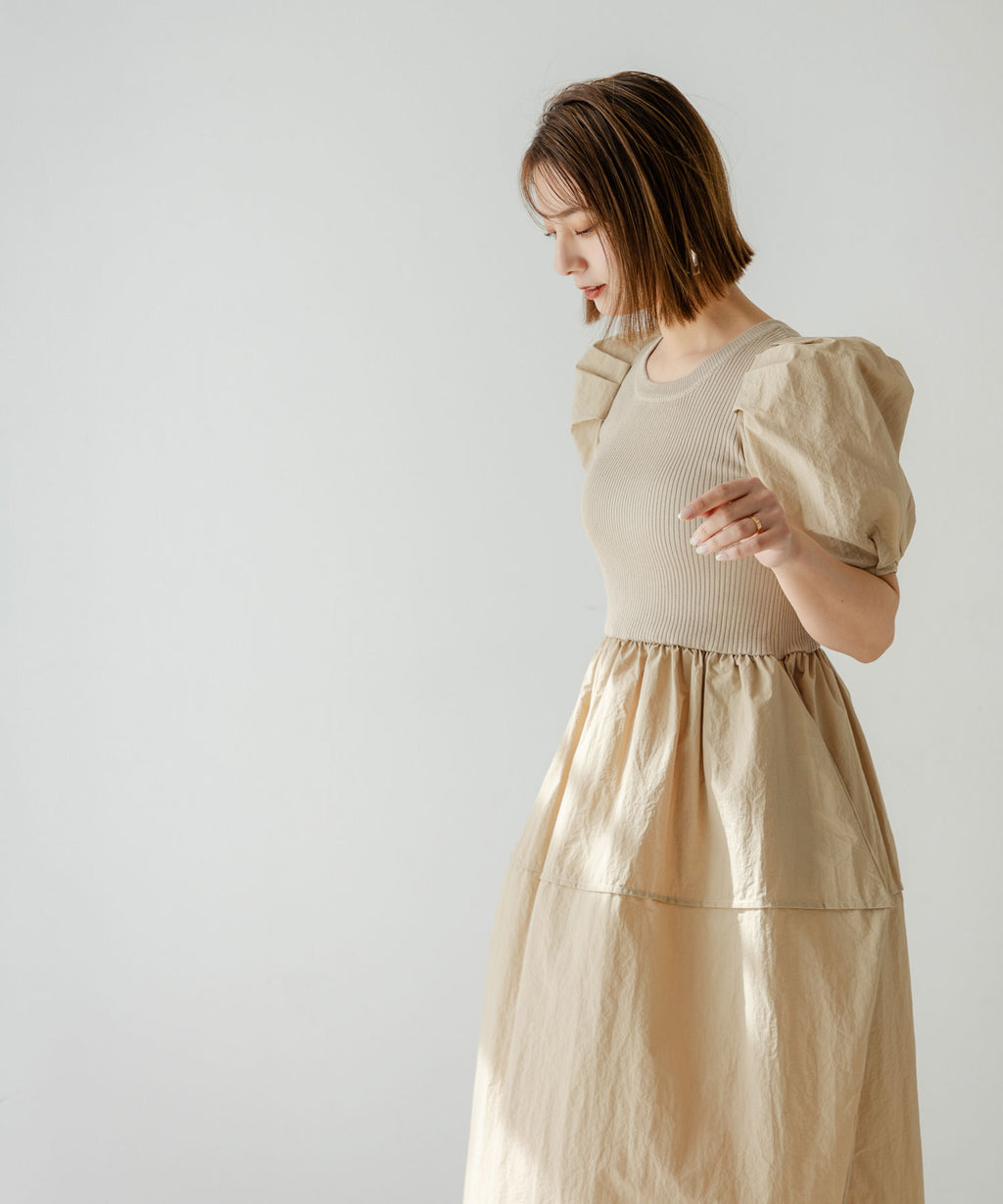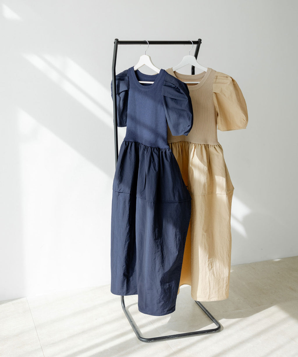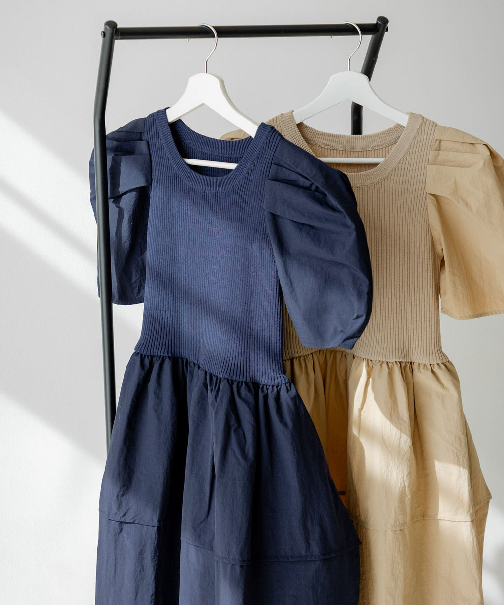 さらりとした着心地の良いリブ編みニットに異素材をドッキングさせたワンピース。