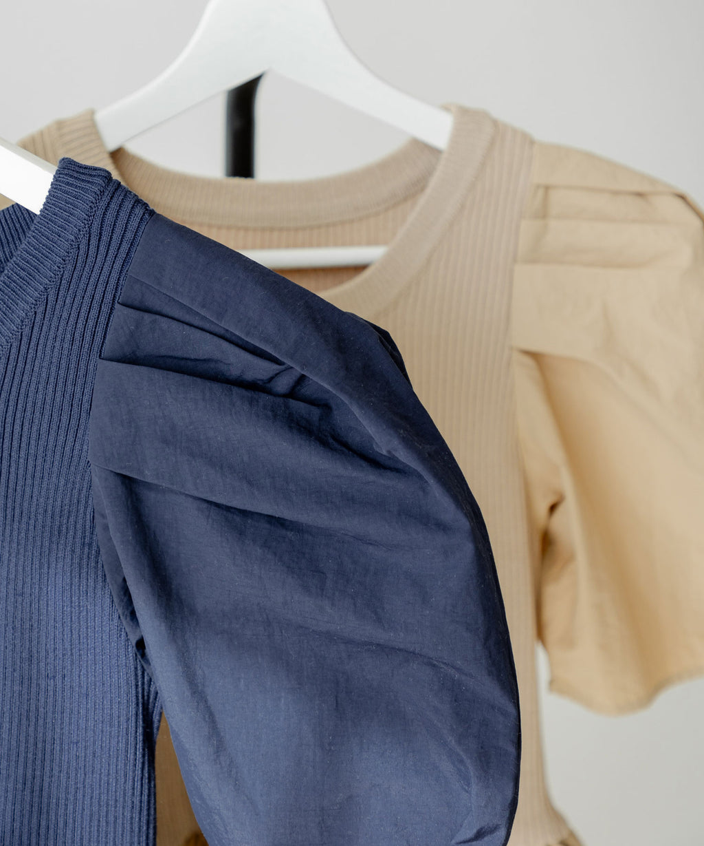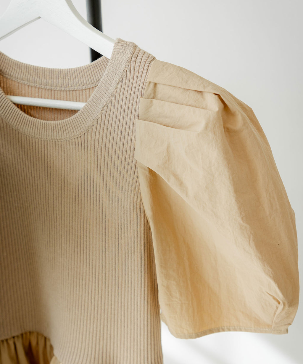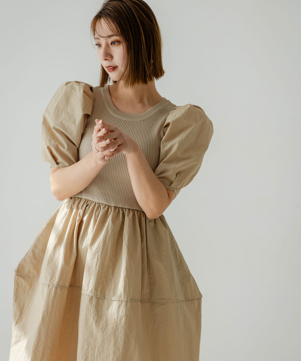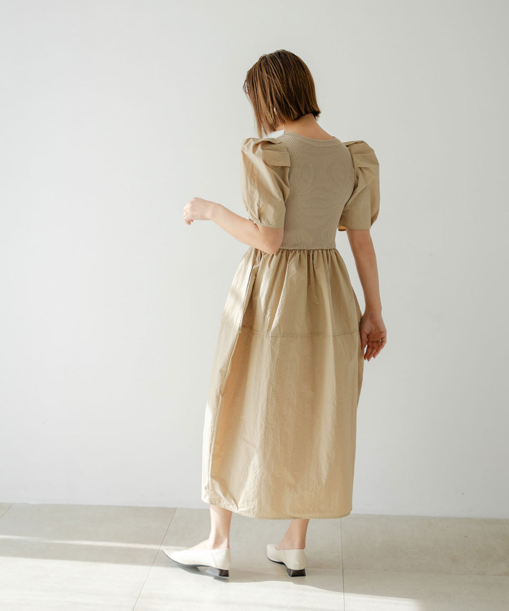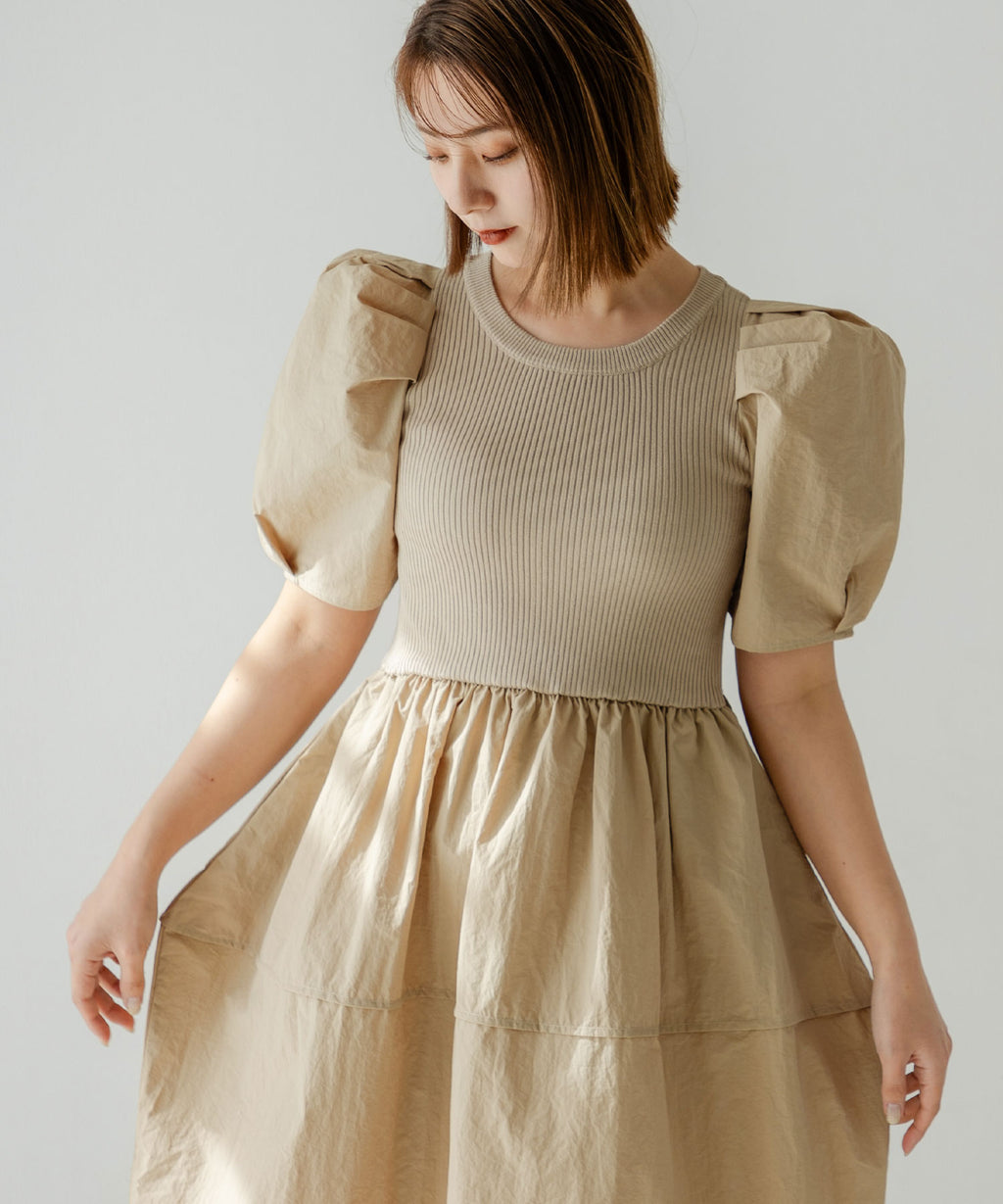さらりとした着心地の良いリブ編みニットに異素材をドッキングさせたワンピース。