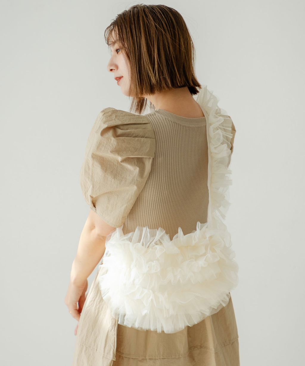 甘いデザインに、素材感と落ち着いたカラーで中和させ、大人の雰囲気に。