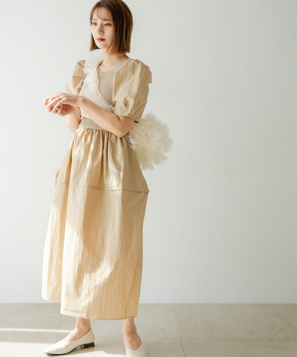 ウエスト部分にはたっぷりギャザーを入れ、裾にかけてふわっと広がるシルエット。