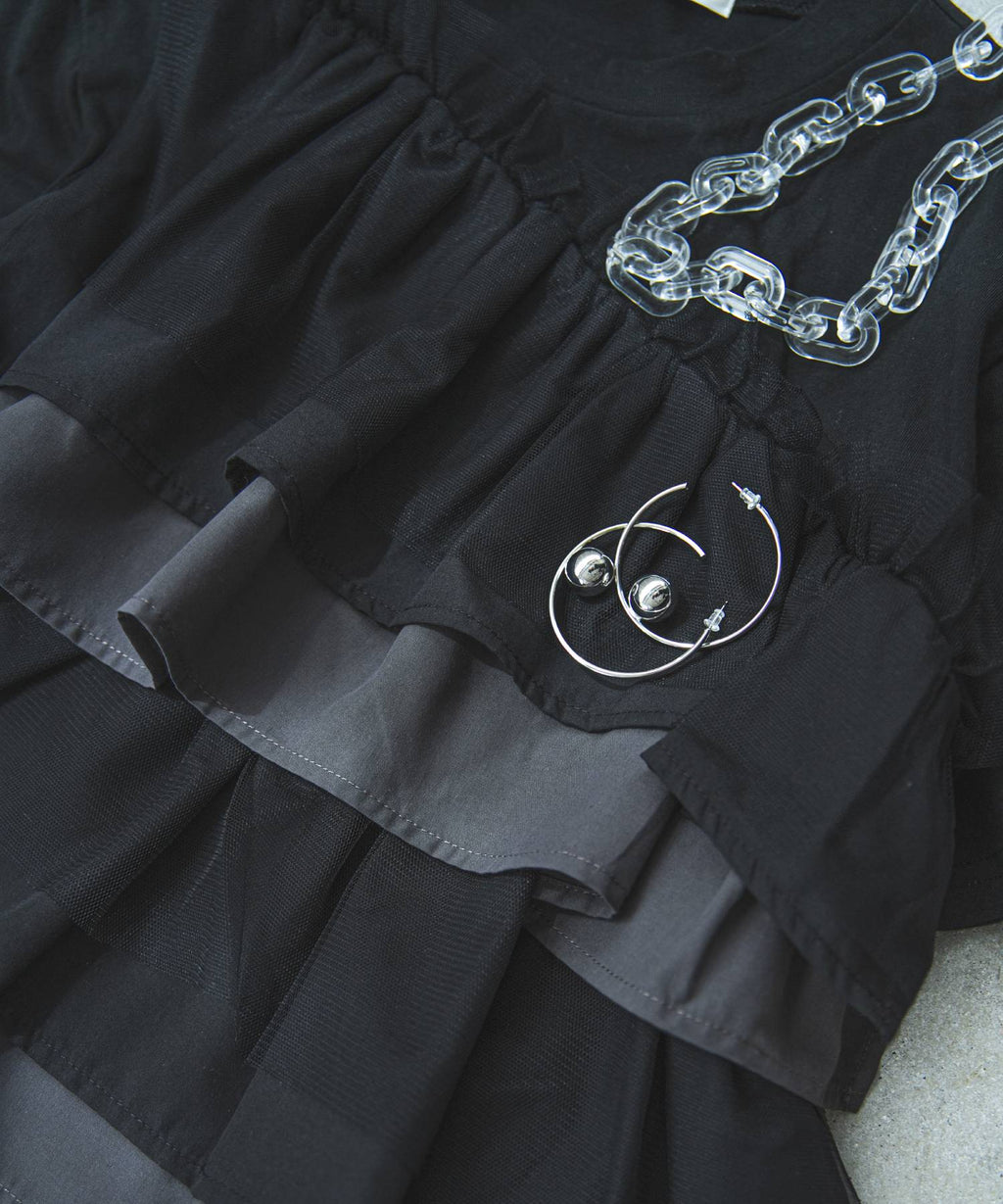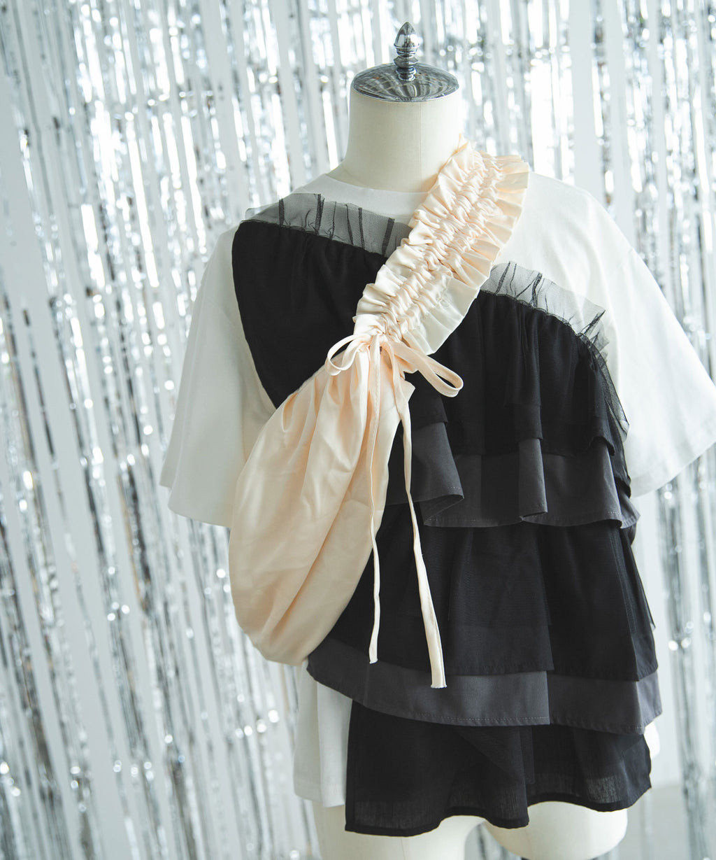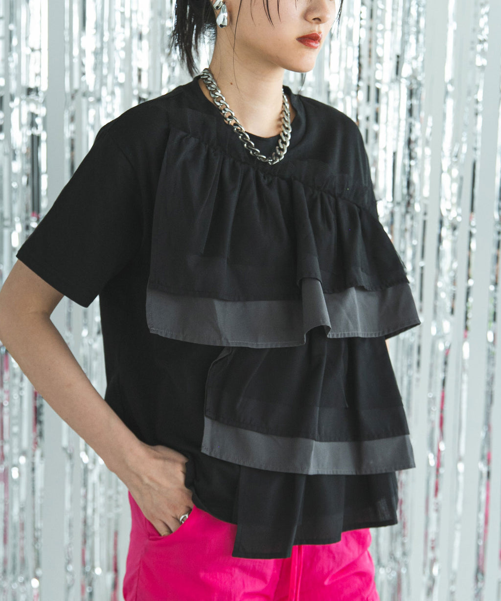 異素材のシャツ生地とチュール生地でフリルを全面にあしらいました。