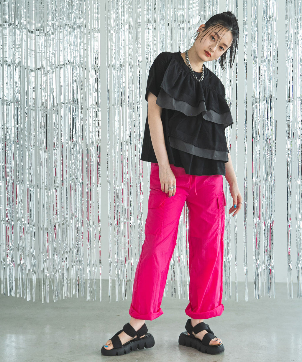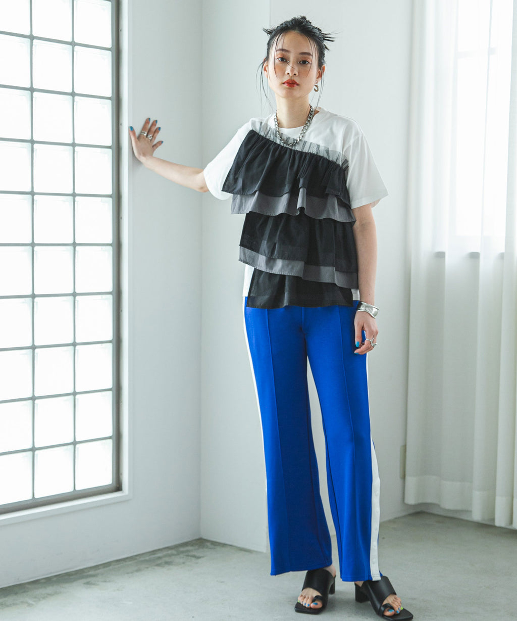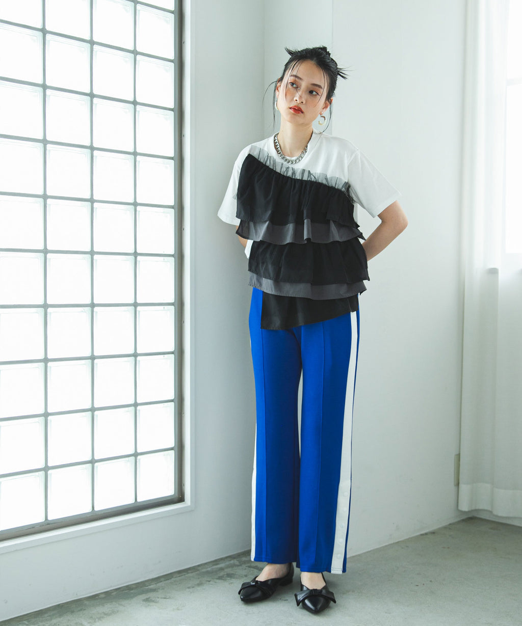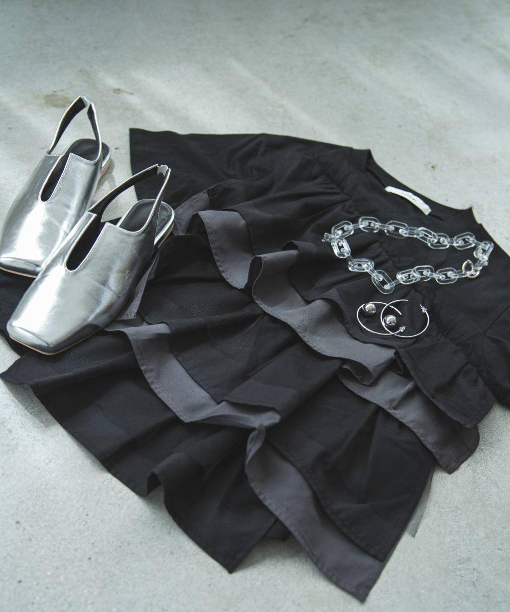 異素材のシャツ生地とチュール生地でフリルを全面にあしらいました。