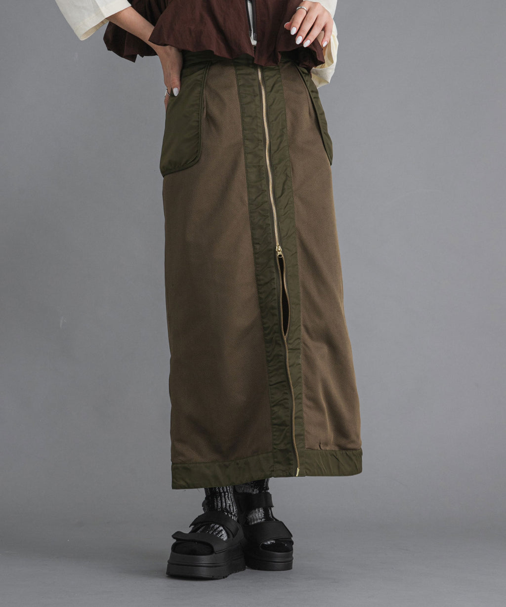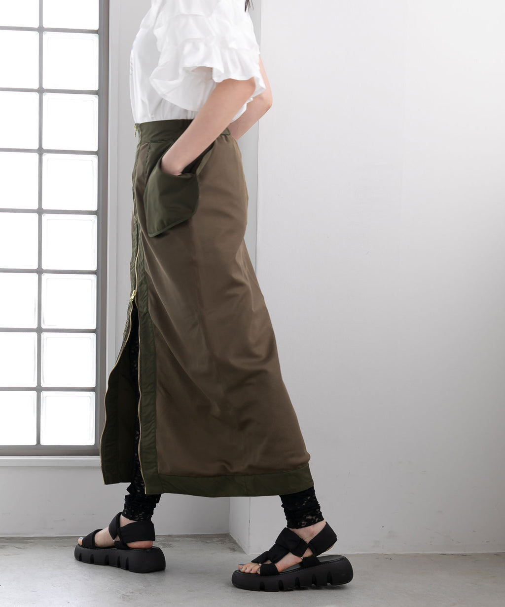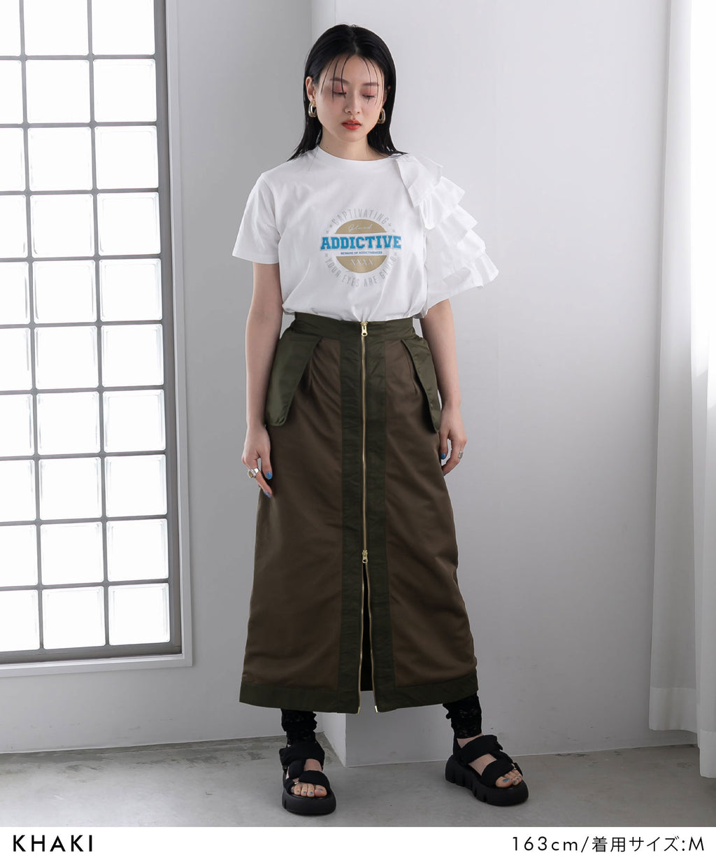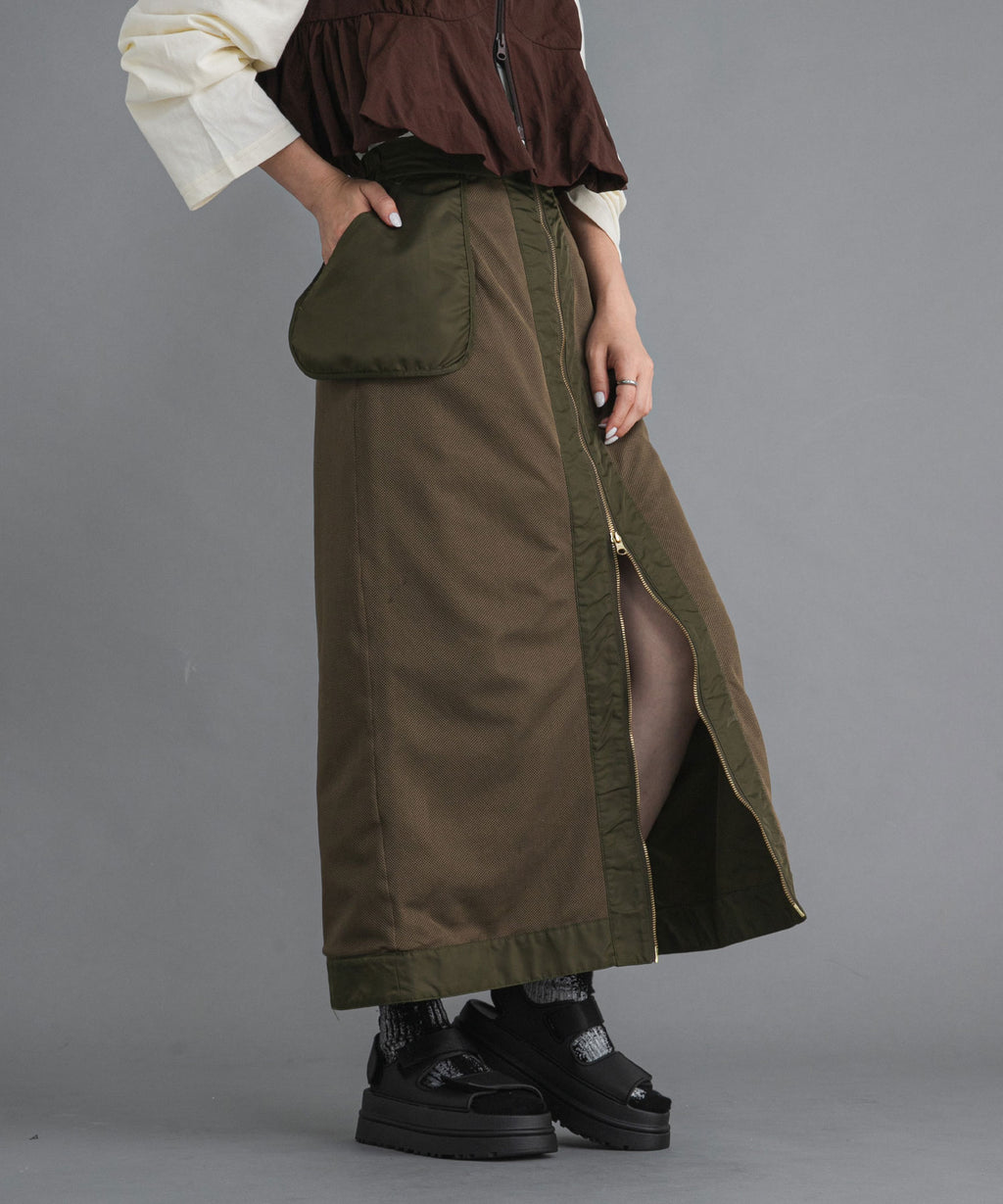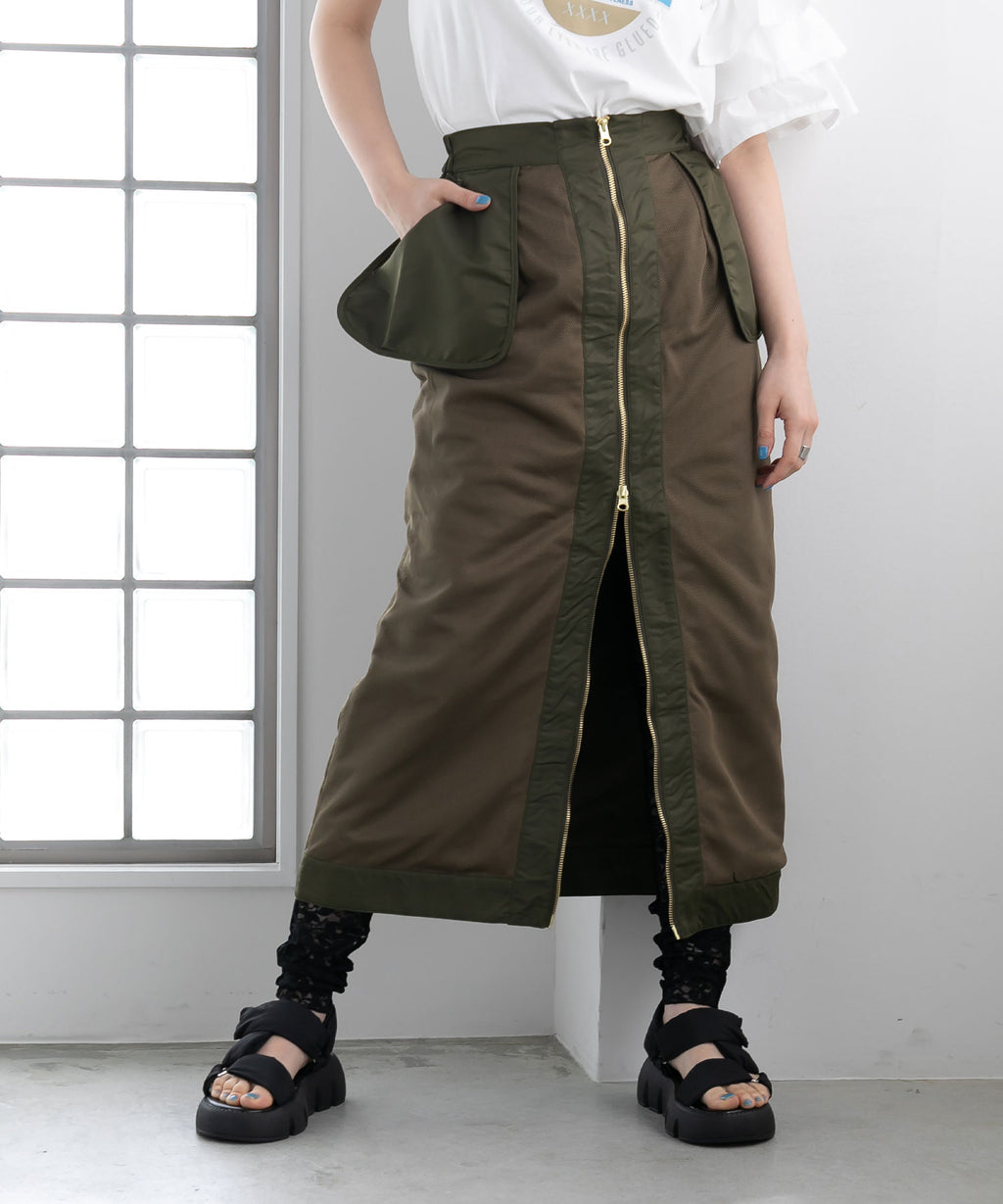 ポケットデザインと、裏地のようなデザインがポイントのミリタリー風のデザインスカート。