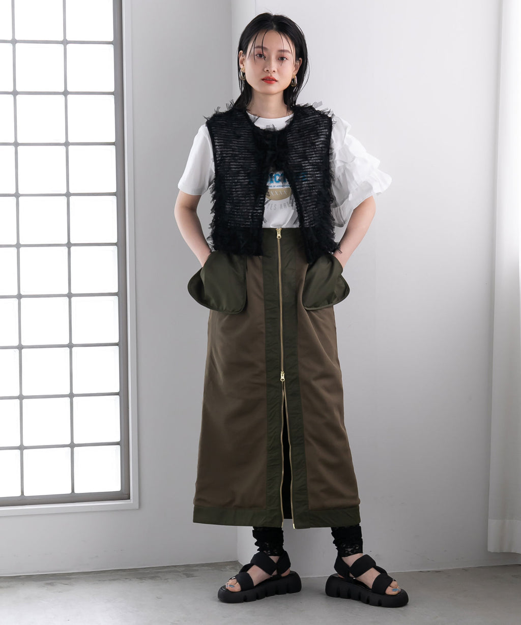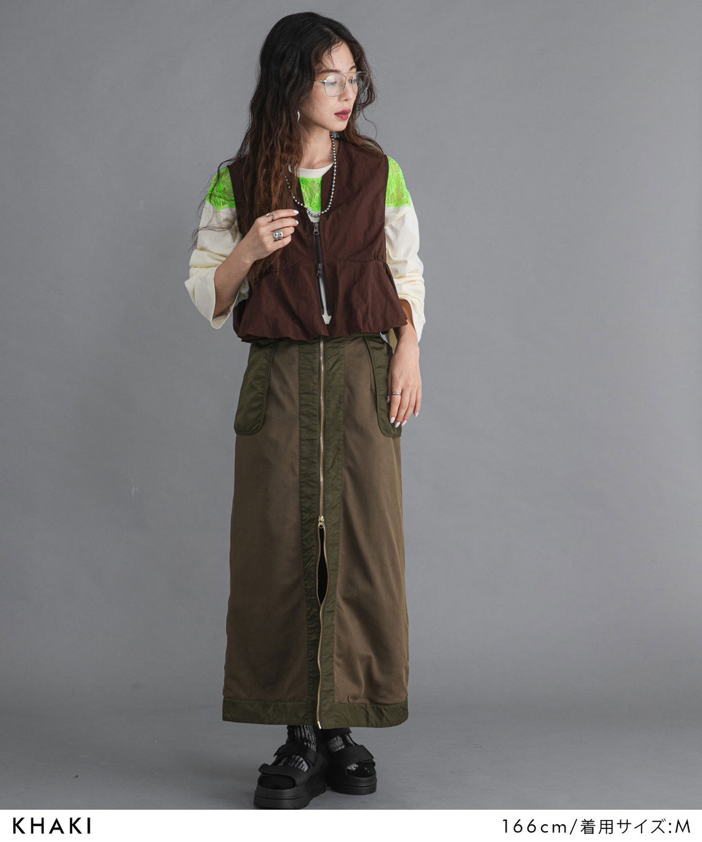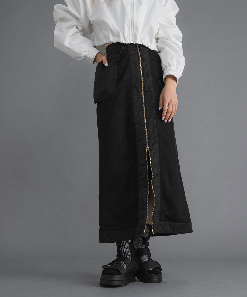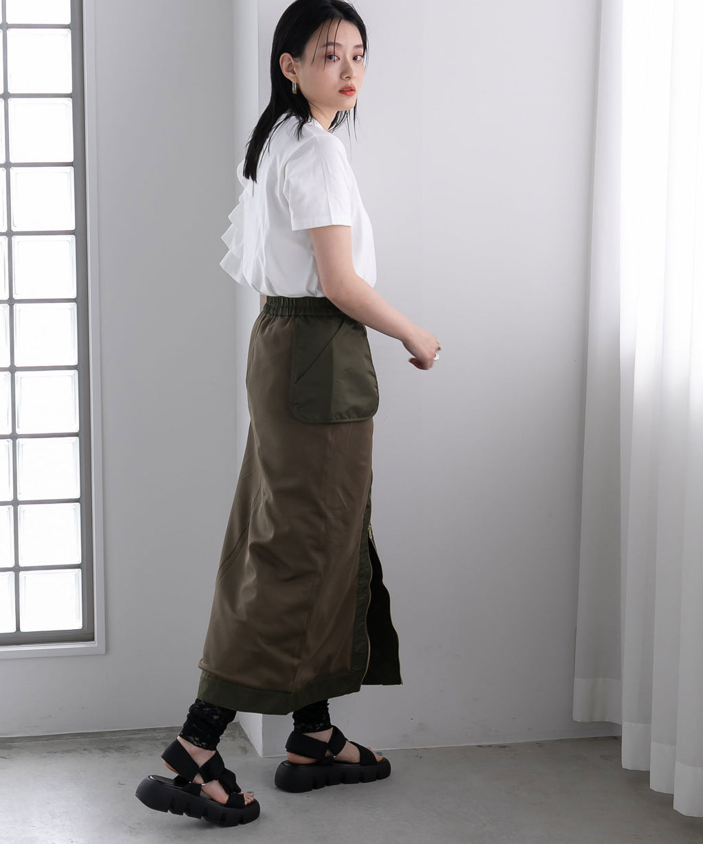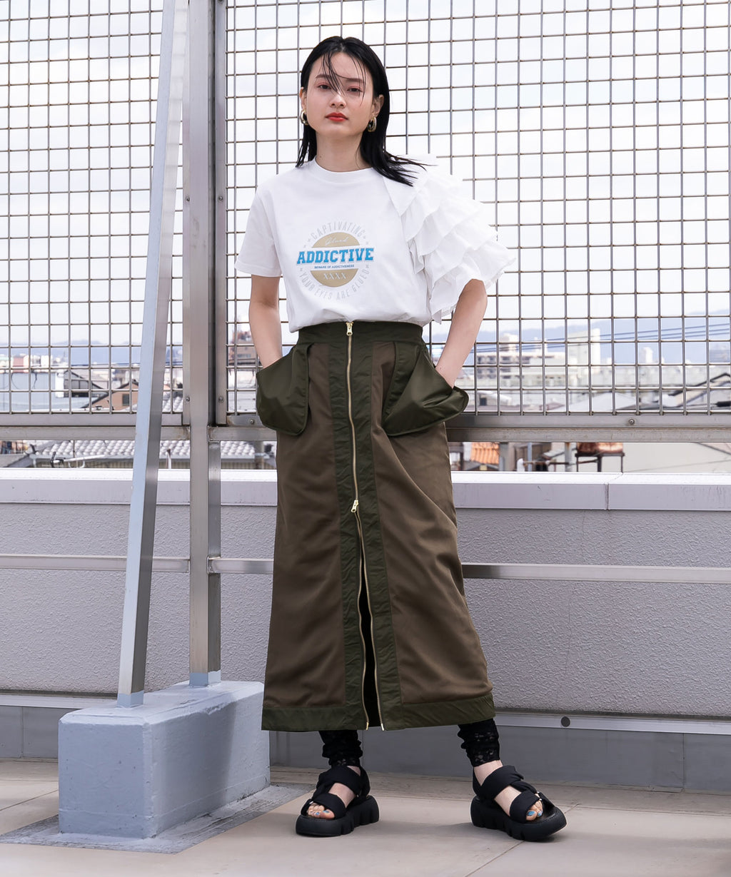 ポケットデザインと、裏地のようなデザインがポイントのミリタリー風のデザインスカート。