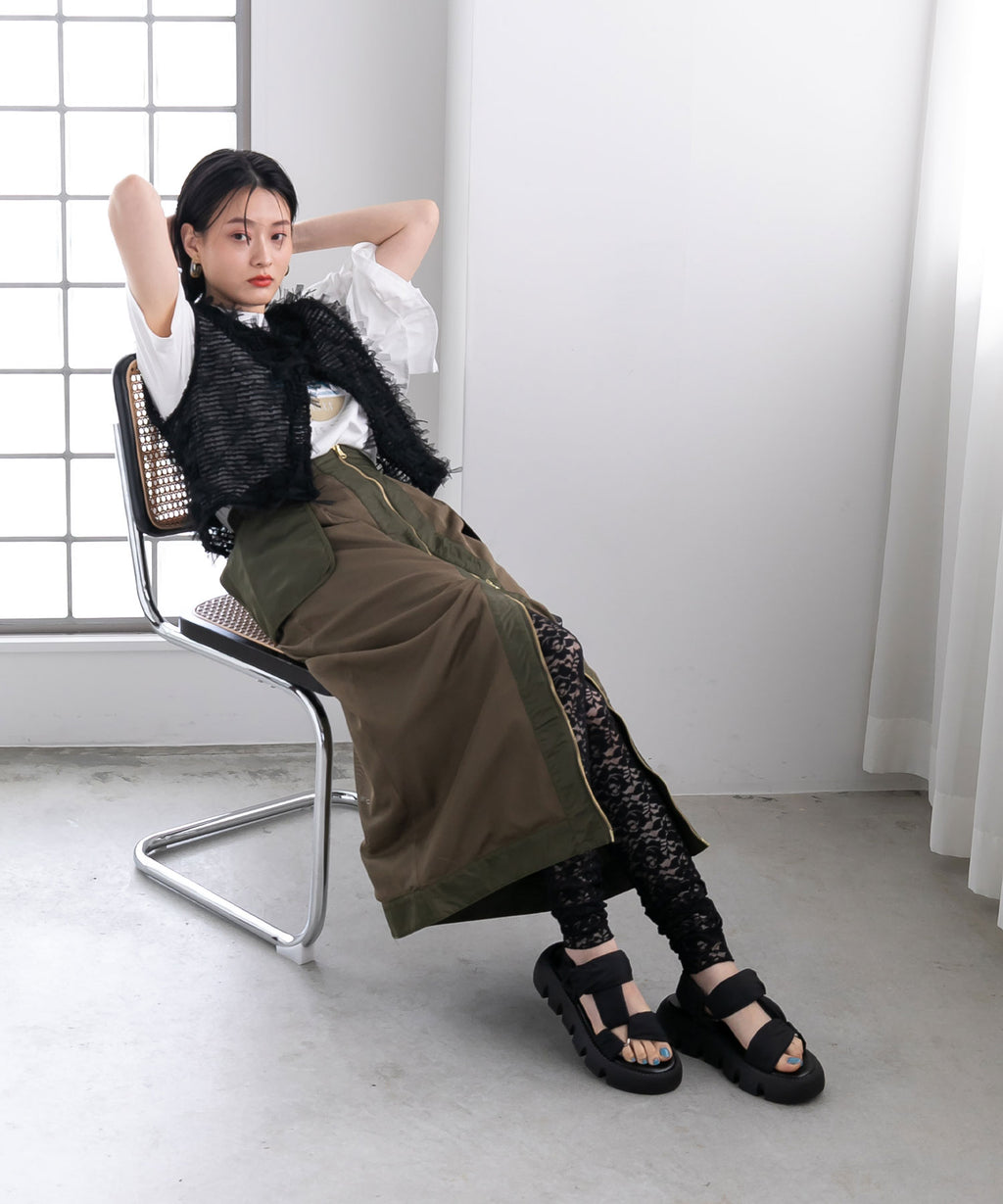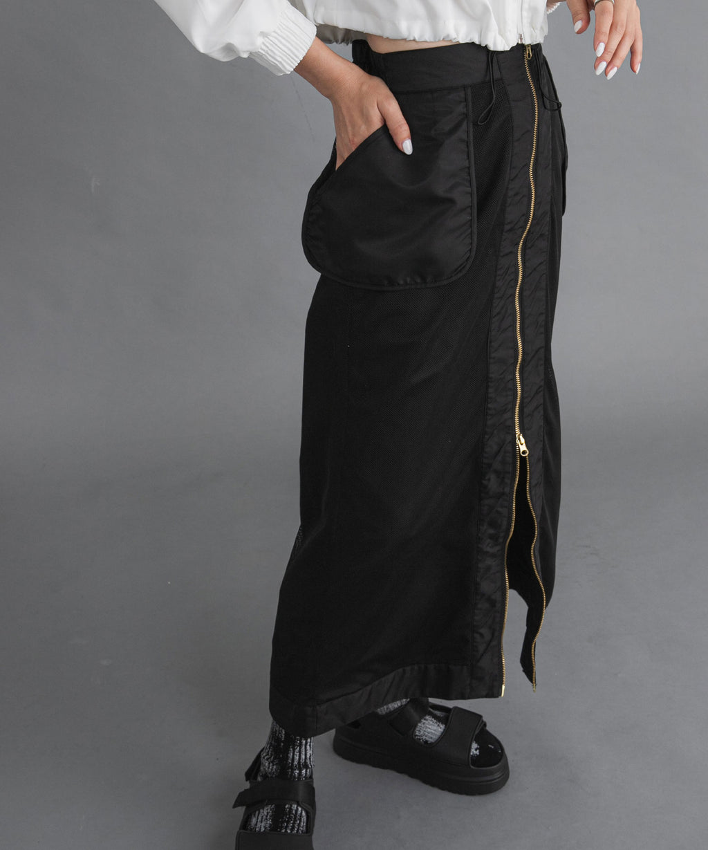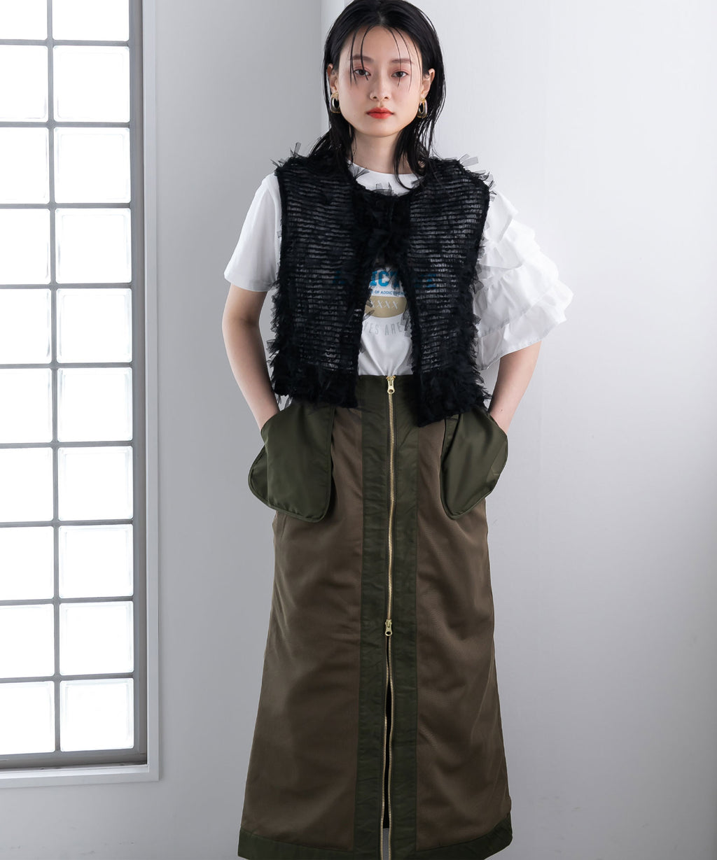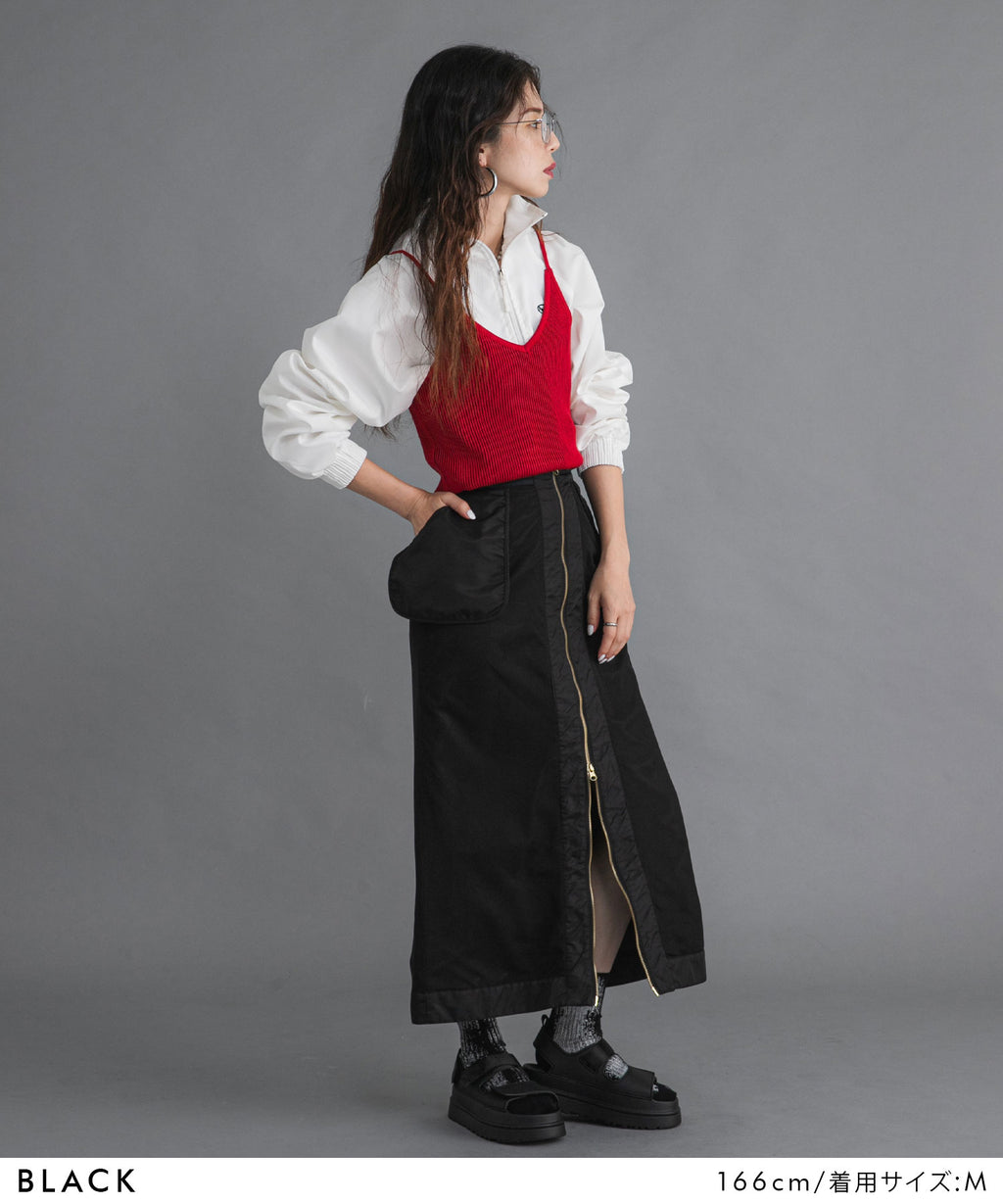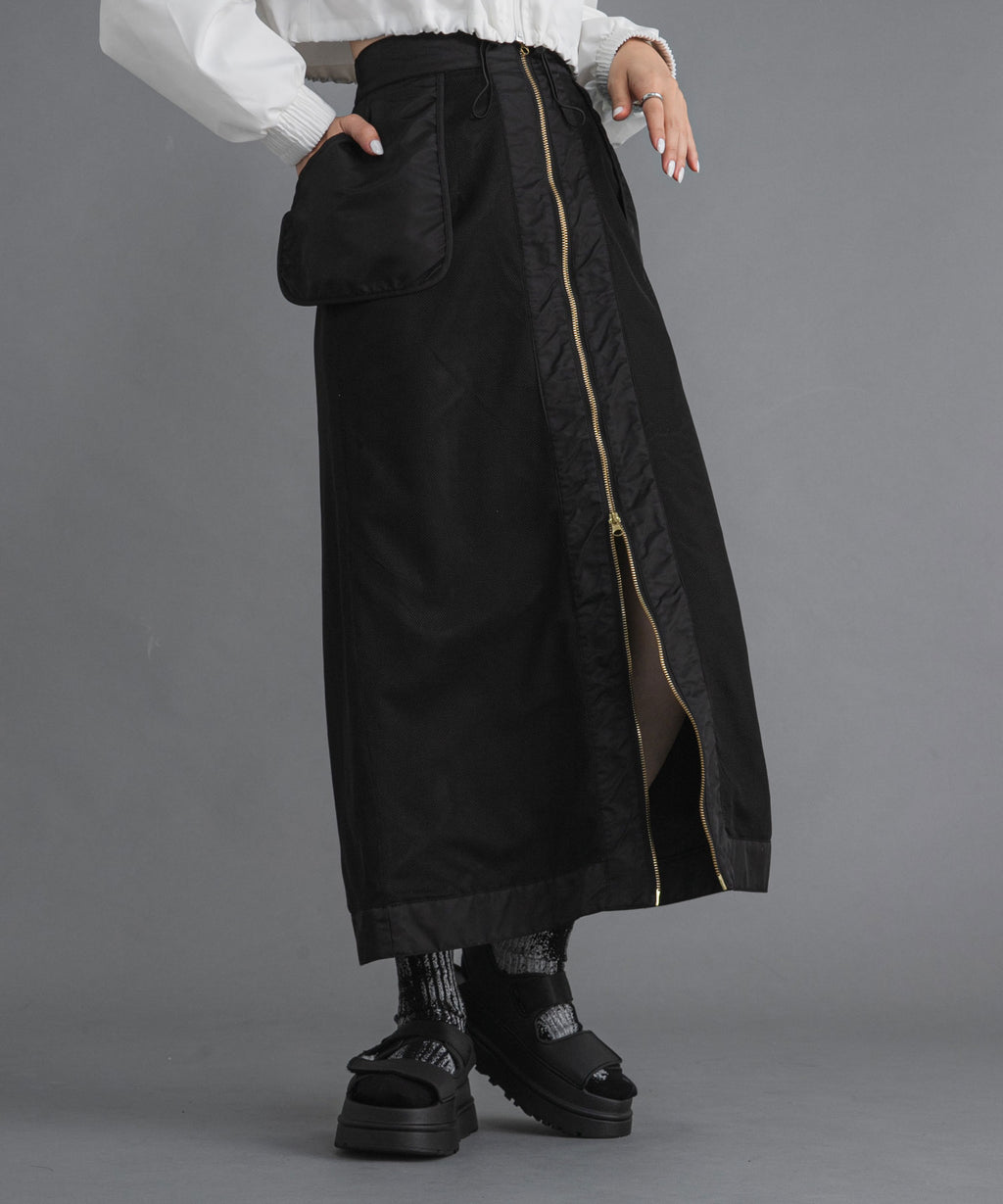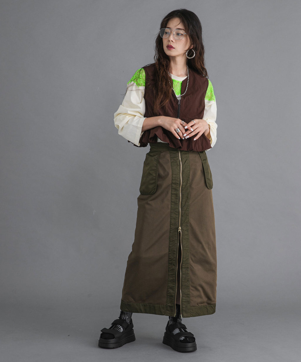 ポケットデザインと、裏地のようなデザインがポイントのミリタリー風のデザインスカート。