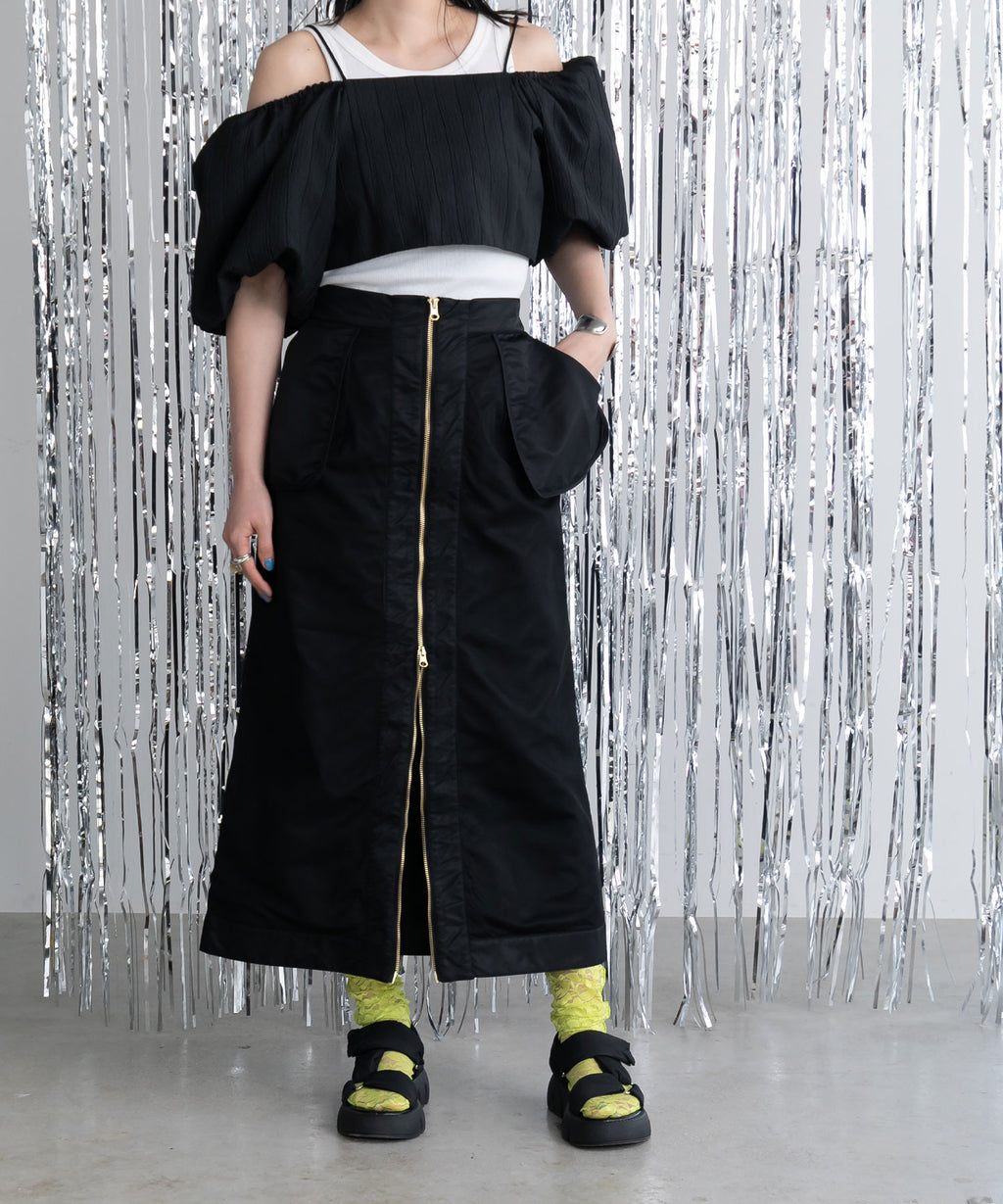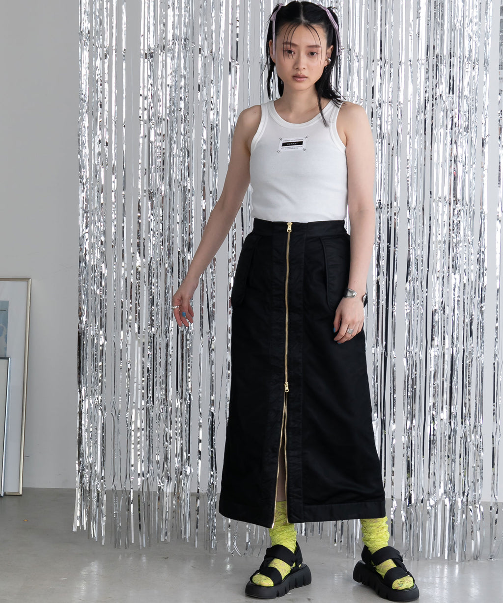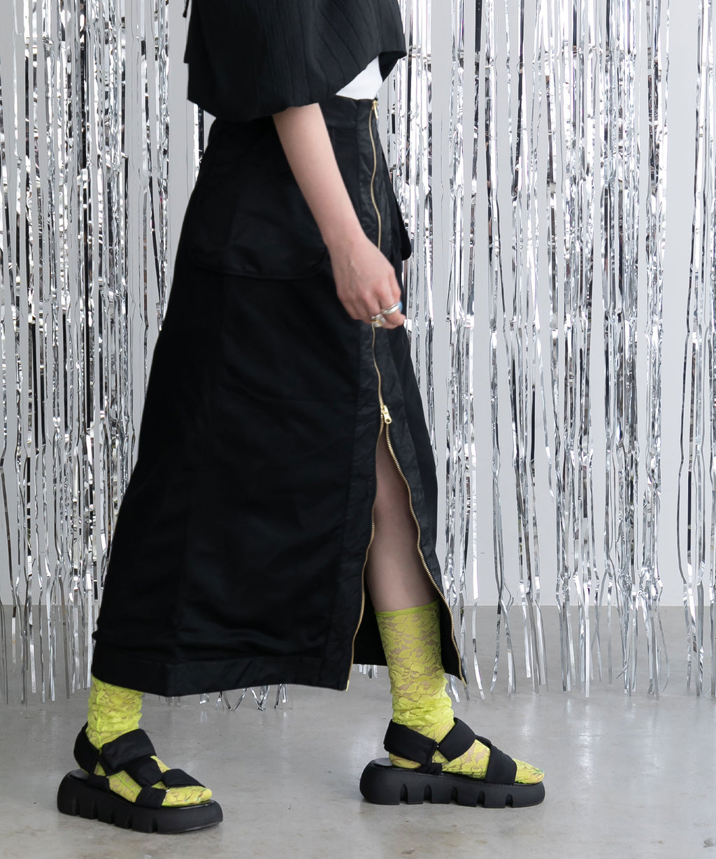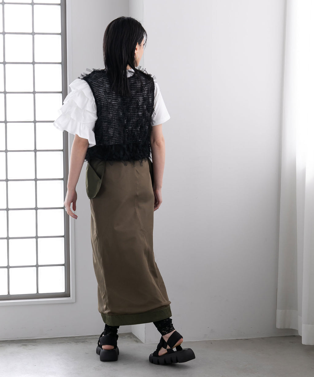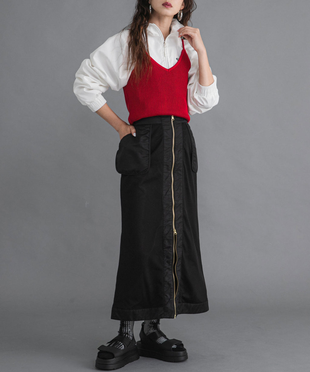 ポケットデザインと、裏地のようなデザインがポイントのミリタリー風のデザインスカート。