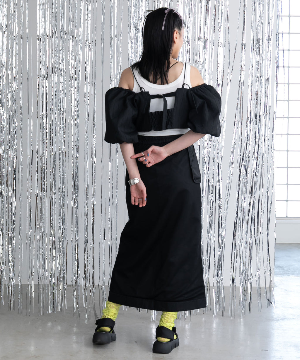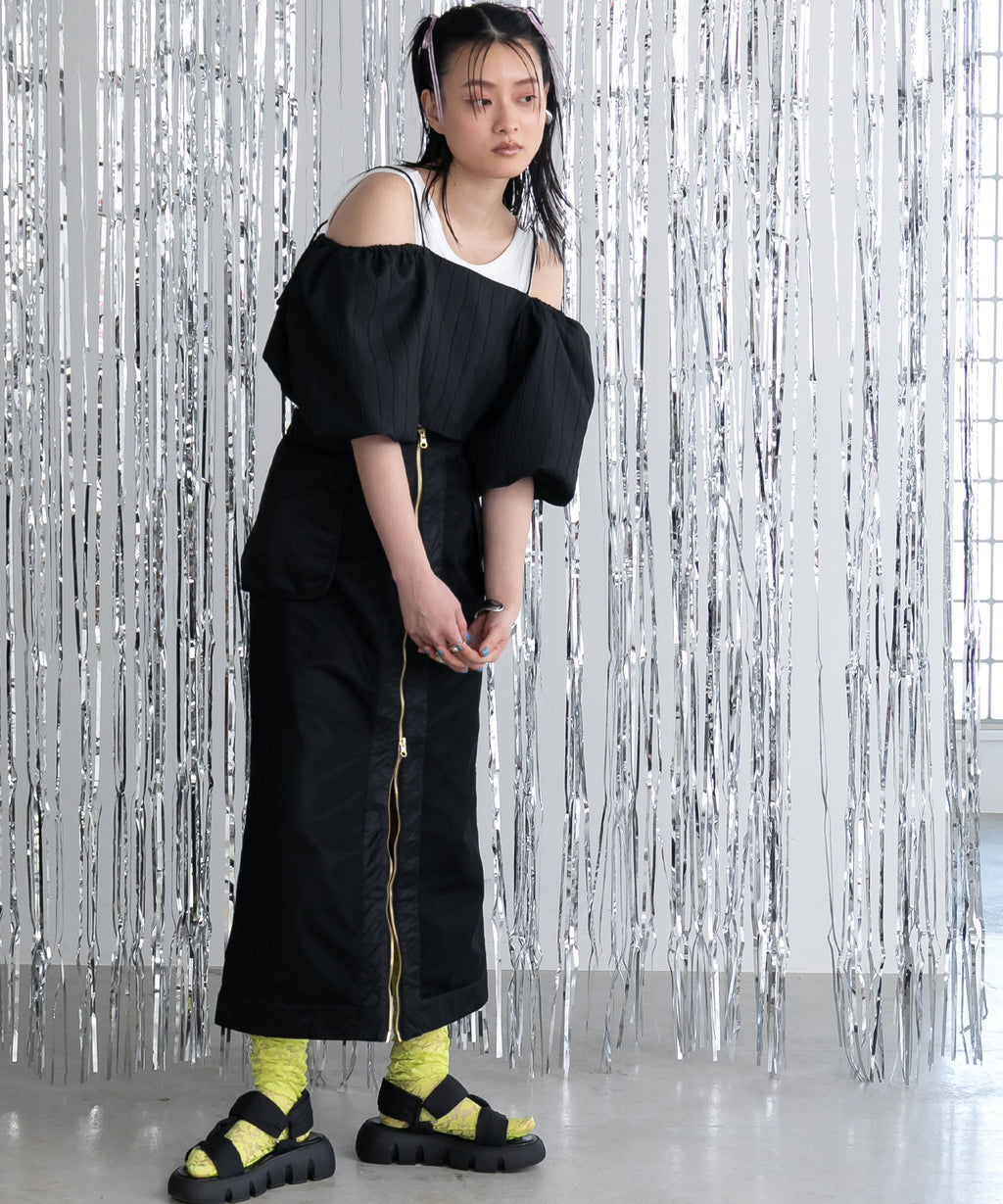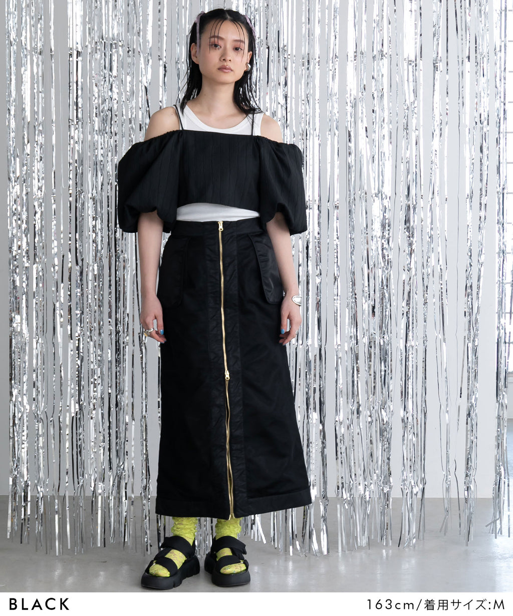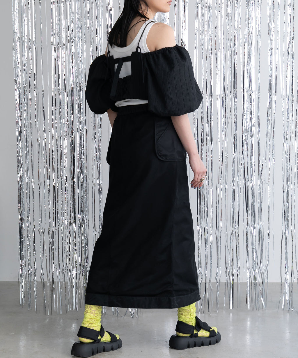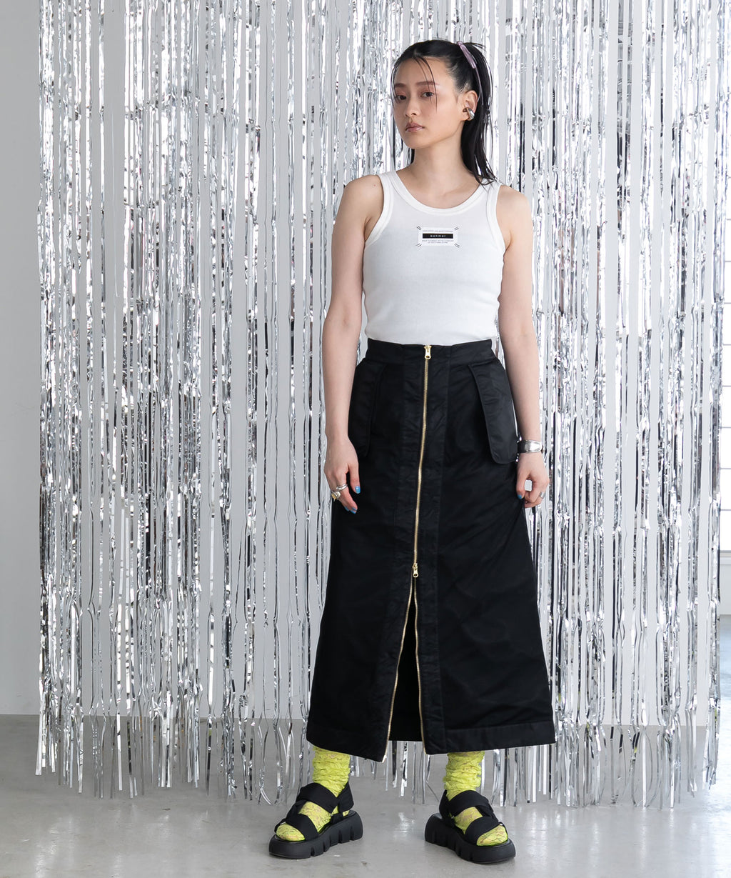 ポケットデザインと、裏地のようなデザインがポイントのミリタリー風のデザインスカート。