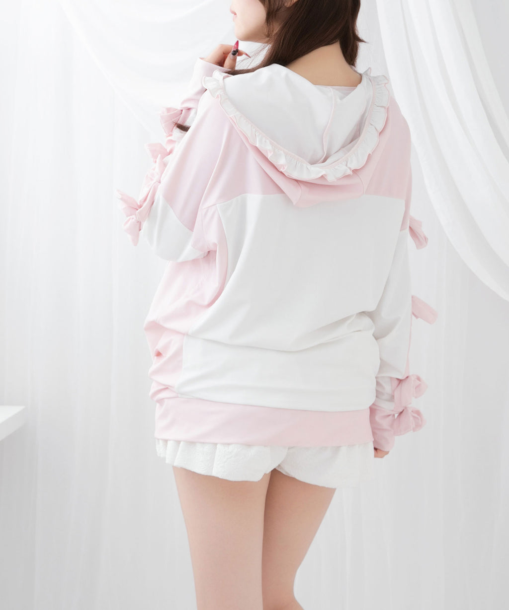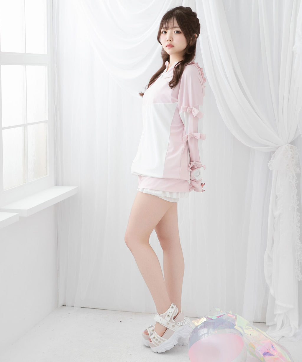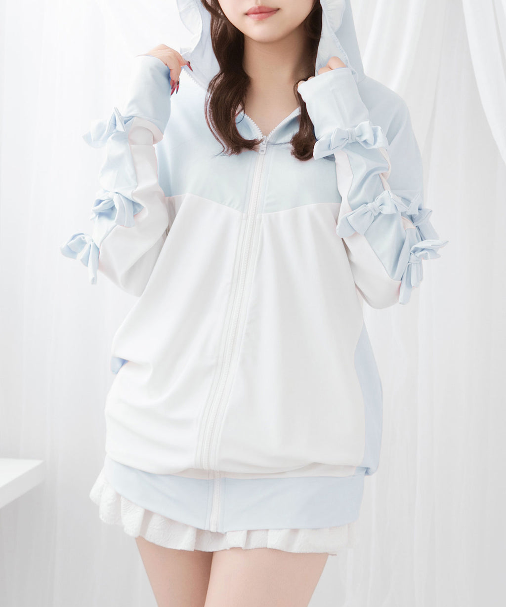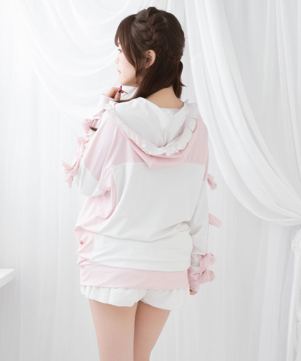 ジャージライクな配色切り替えや袖のリボン、フード口のフリルなどサブカル地雷や天使界隈系にぴったりのデザインがたっぷりです♪