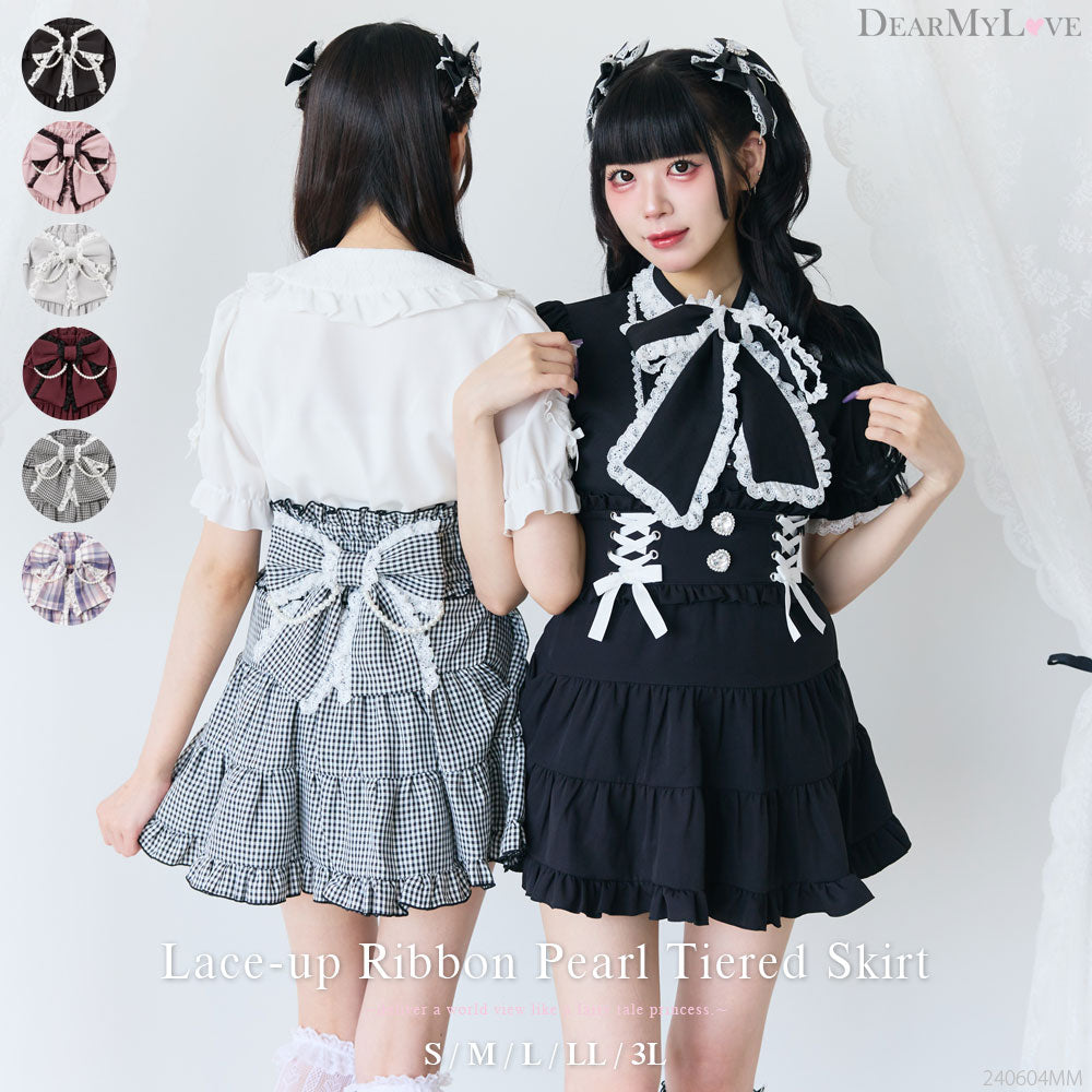 ウエストに配色のレースアップ2つとキラキラハートビジュー釦