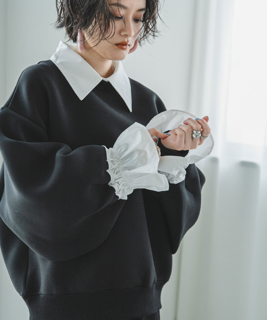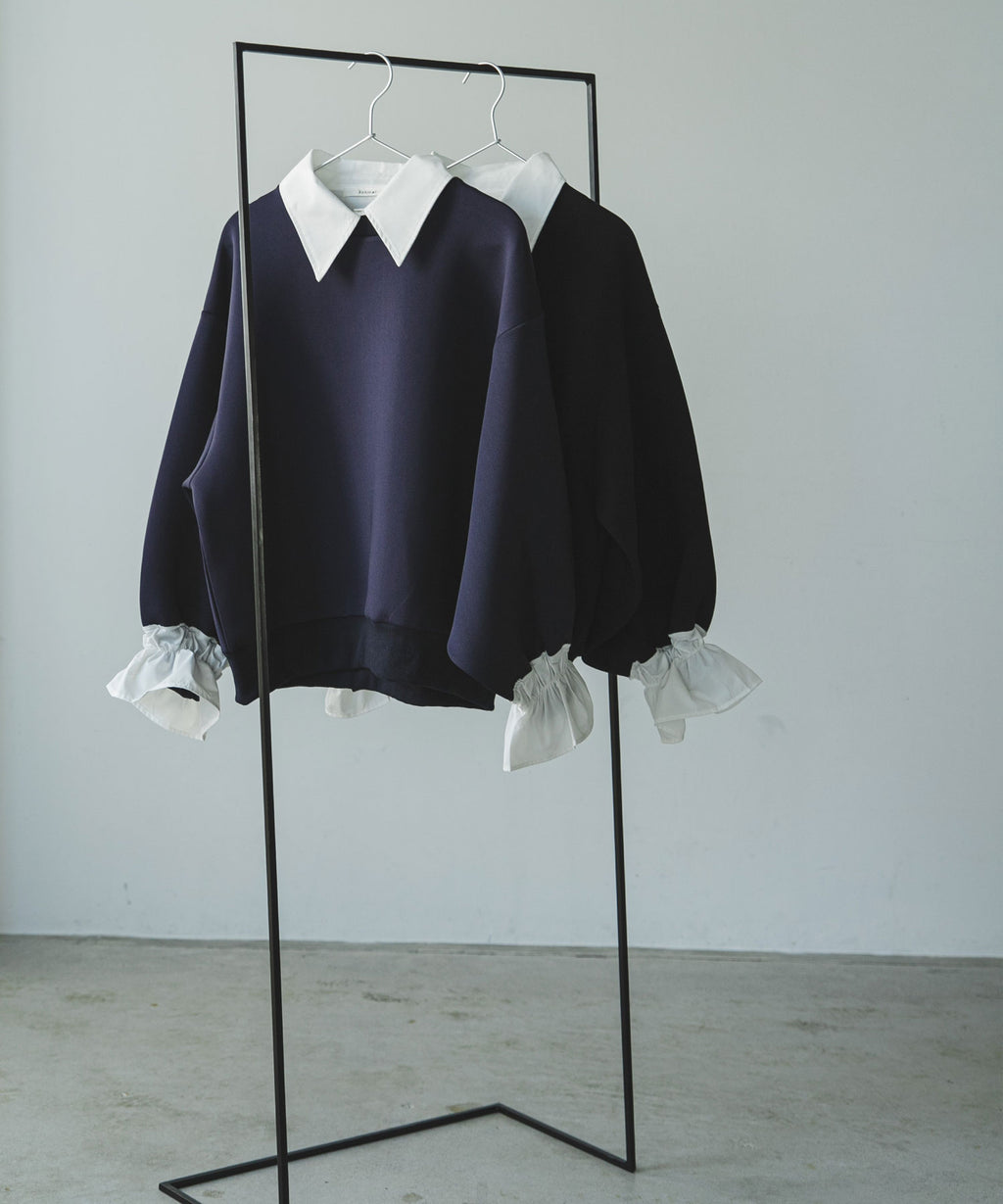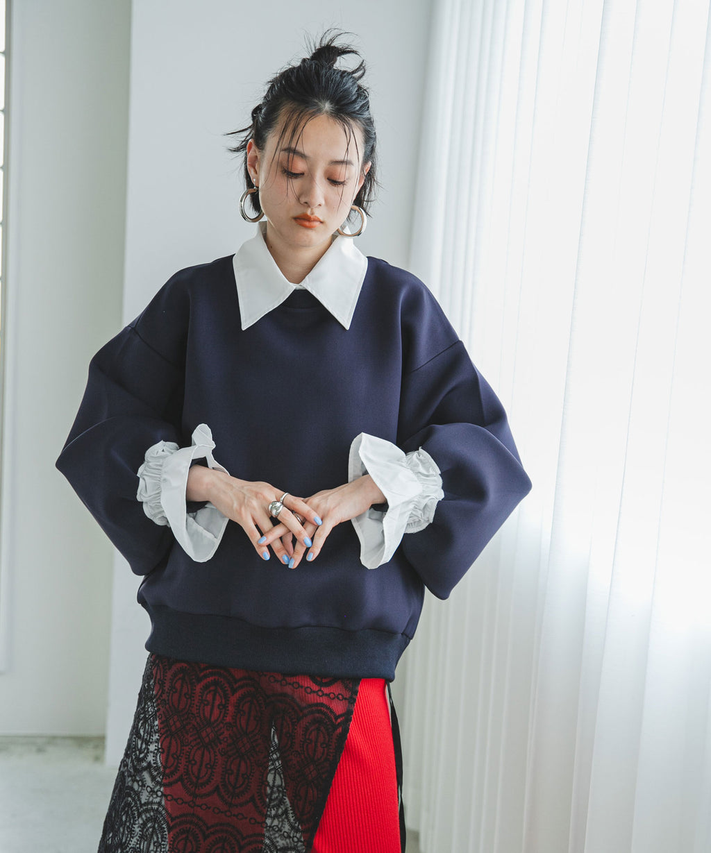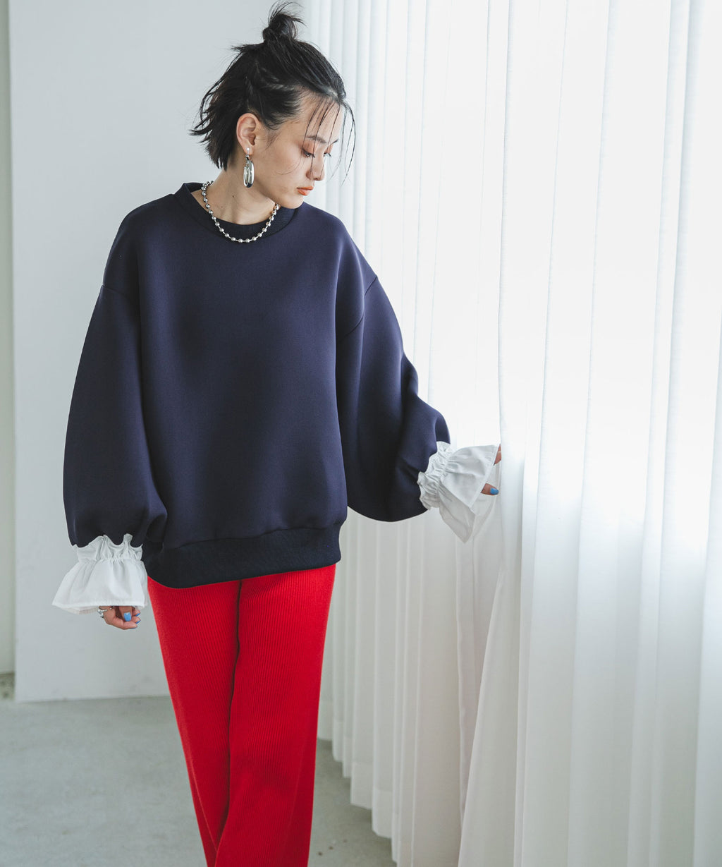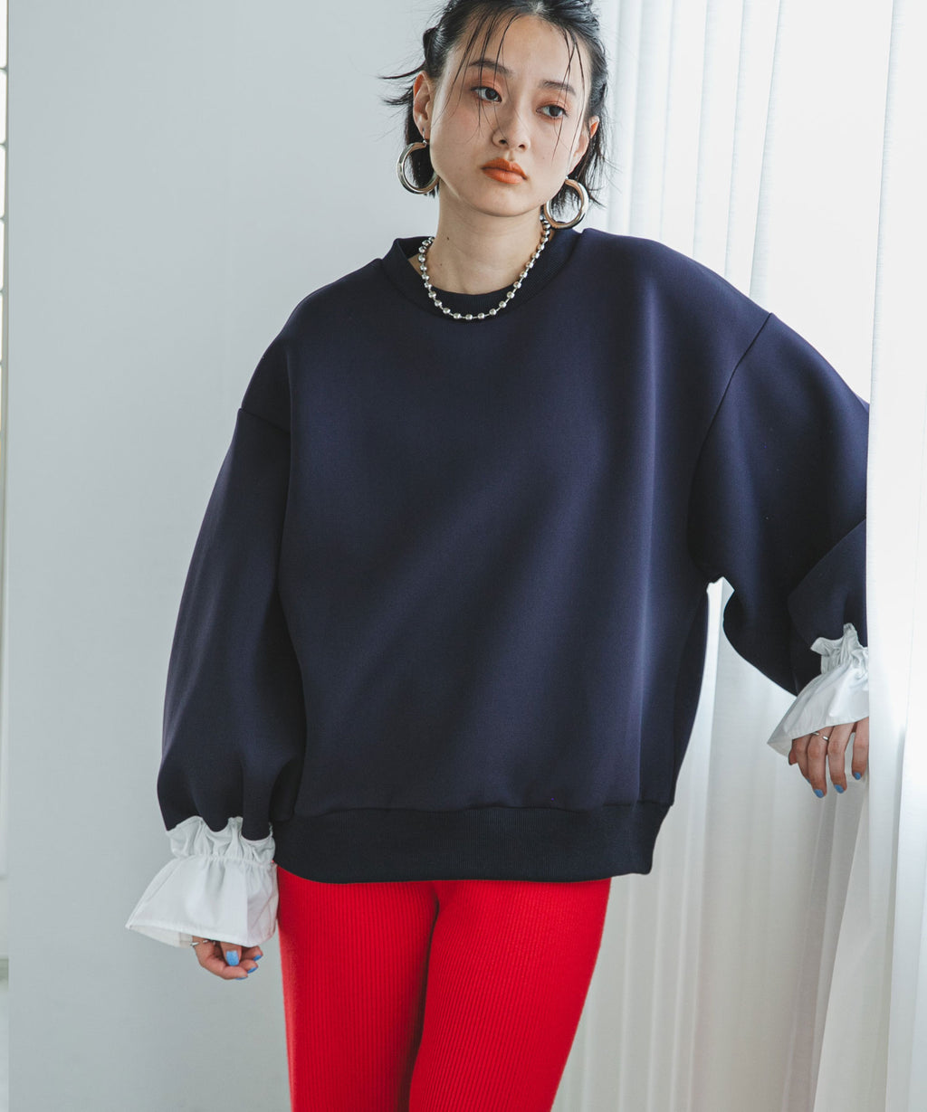 スウェットと異素材のフリルが袖と襟にドッキングされたアイテム。