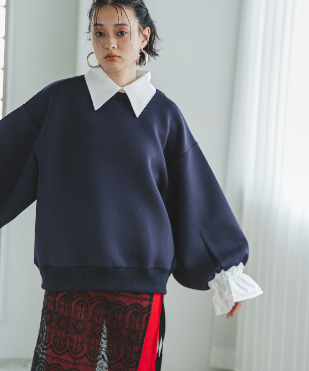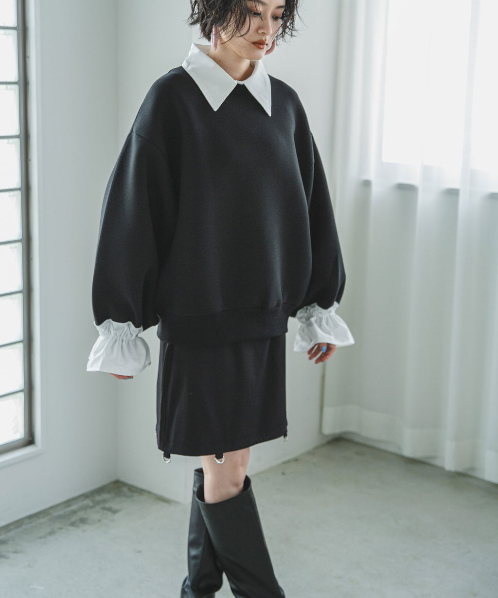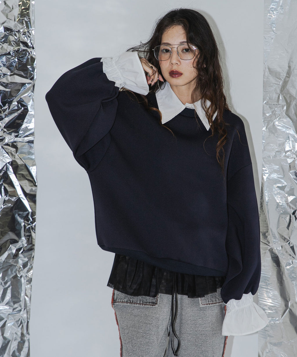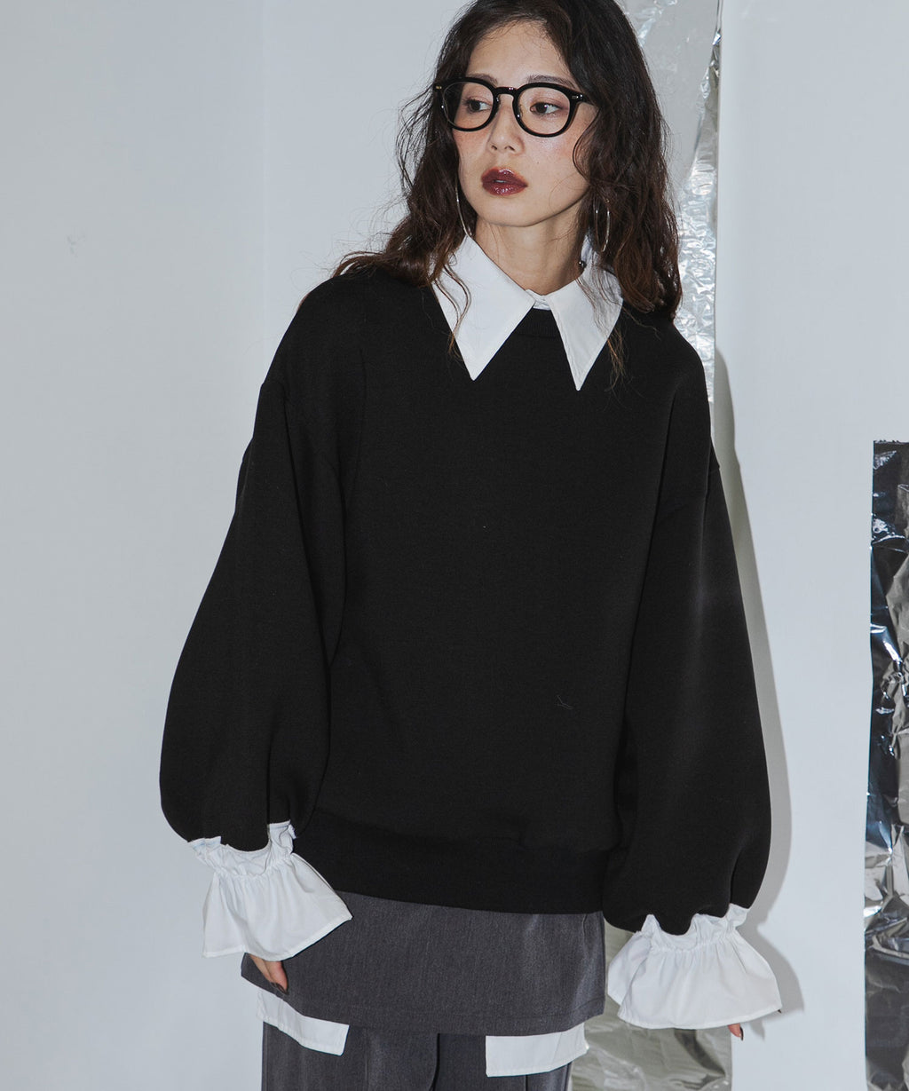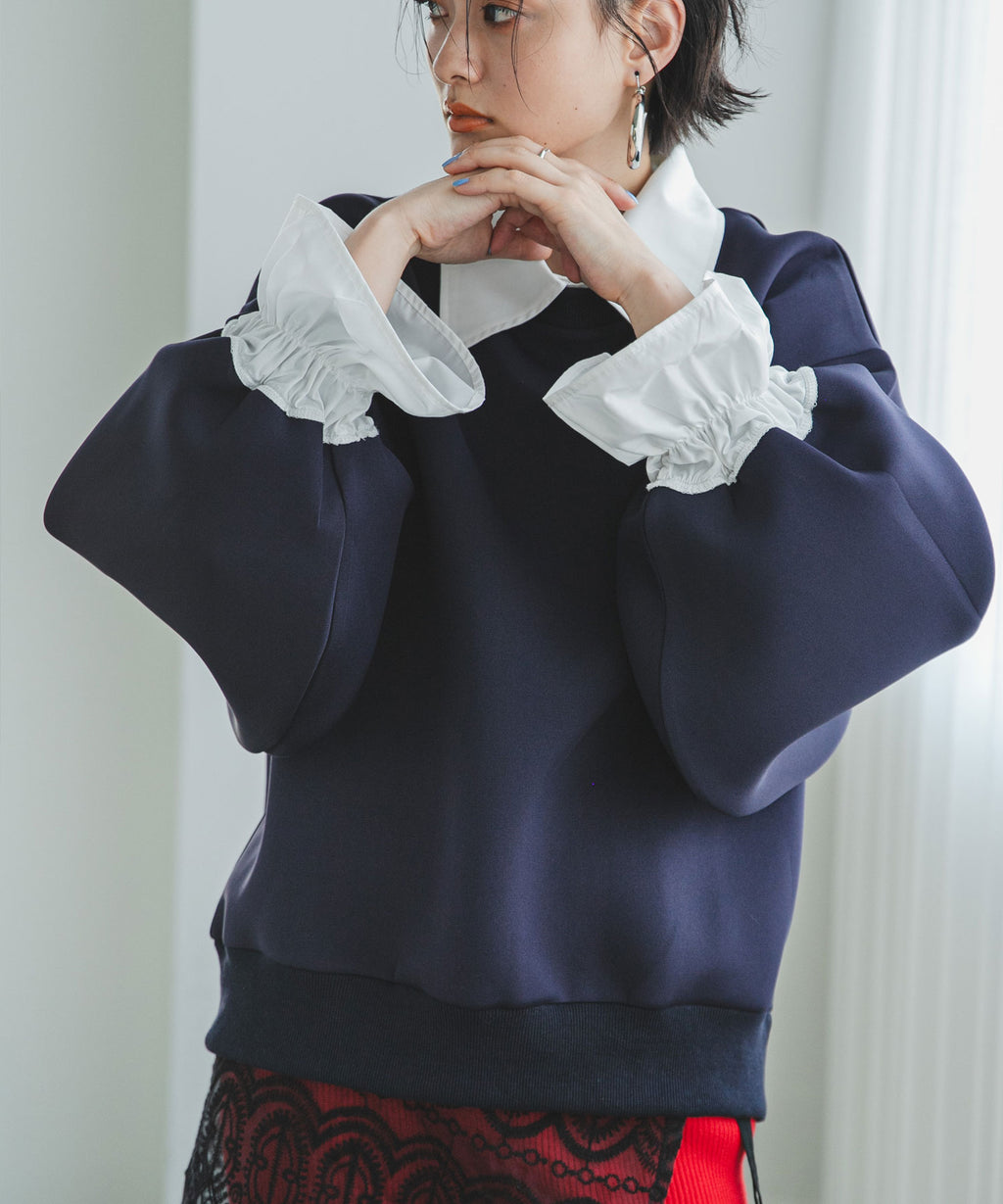 スウェットと異素材のフリルが袖と襟にドッキングされたアイテム。