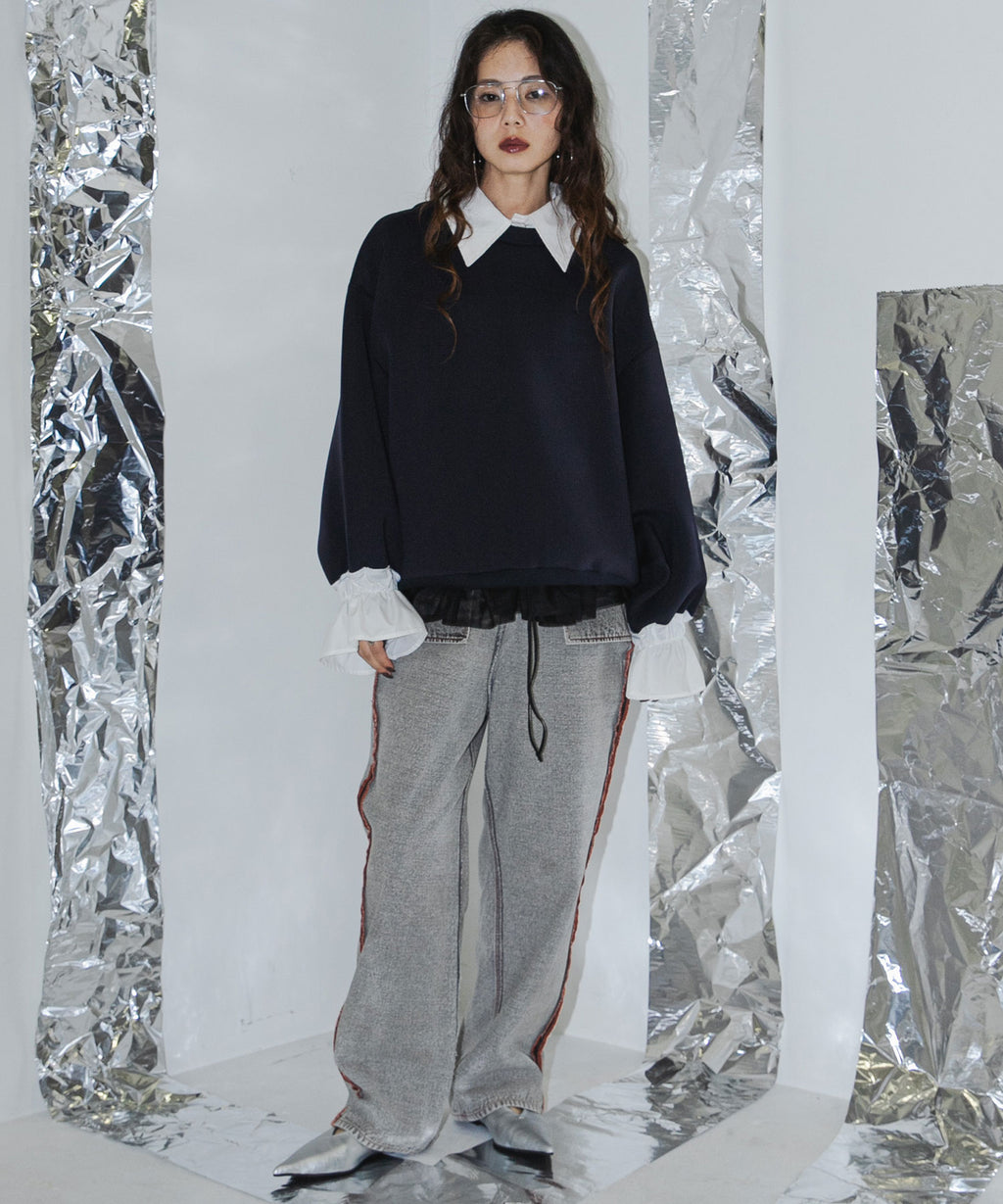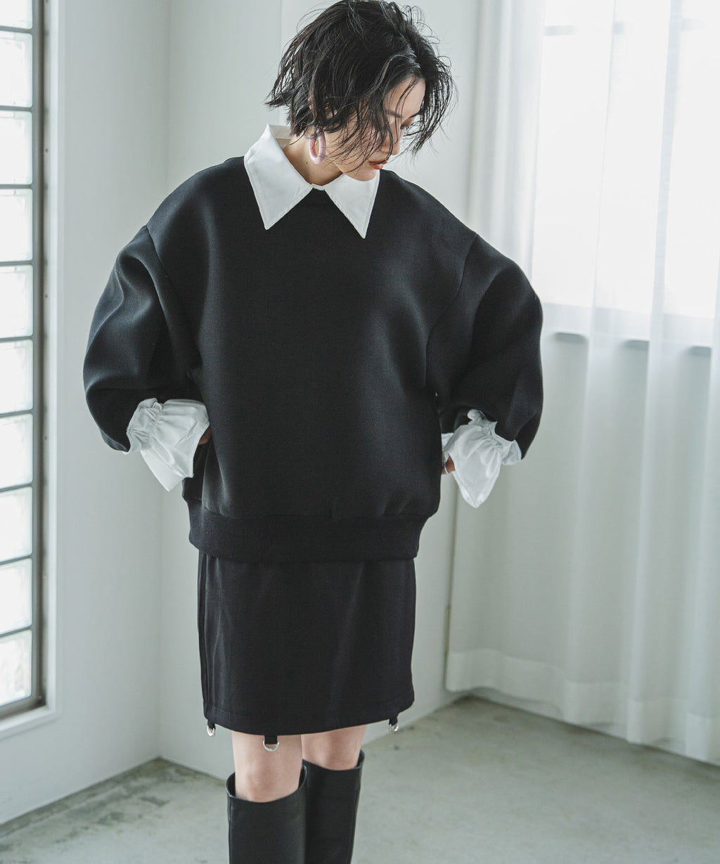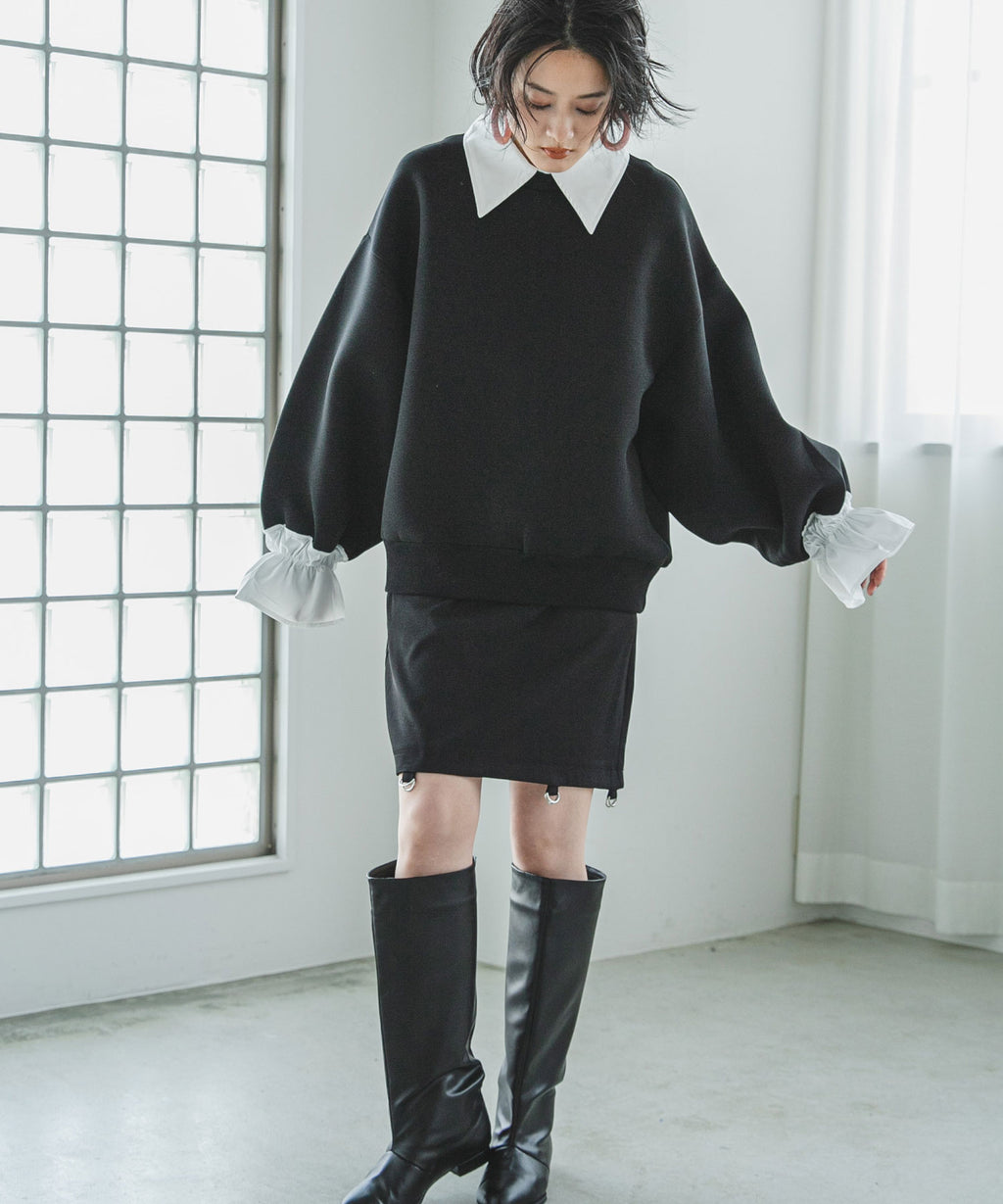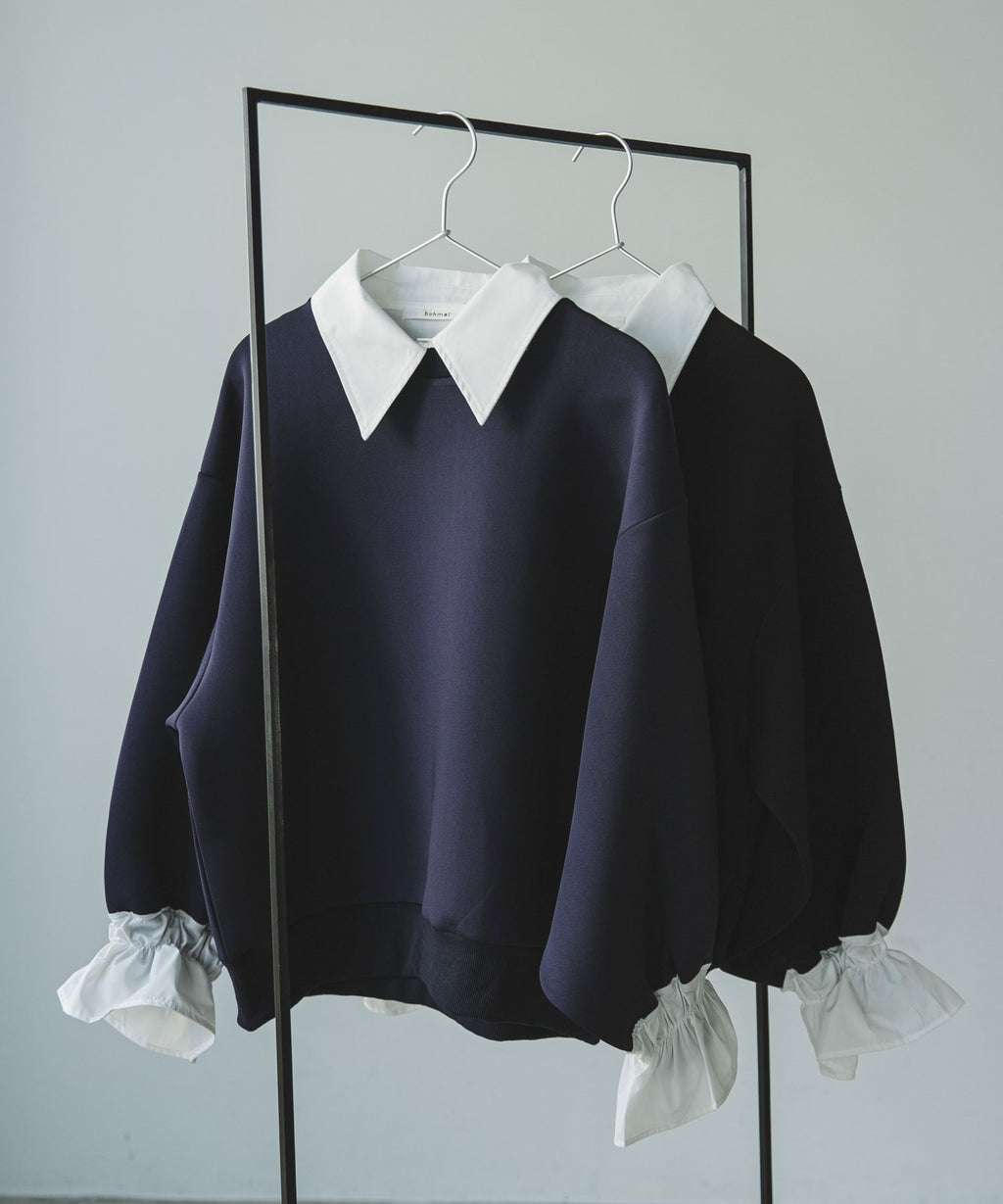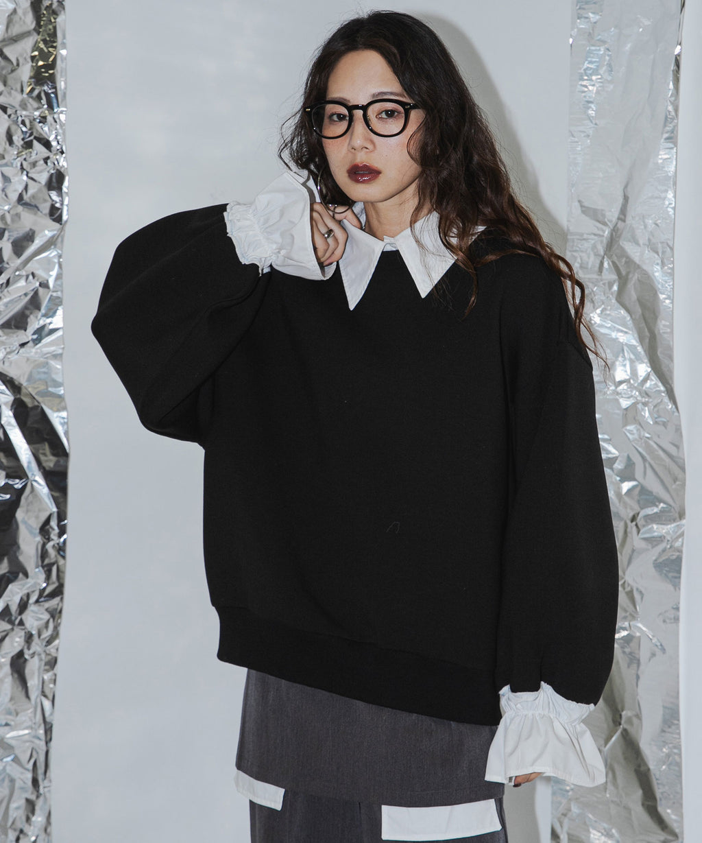スウェットと異素材のフリルが袖と襟にドッキングされたアイテム。