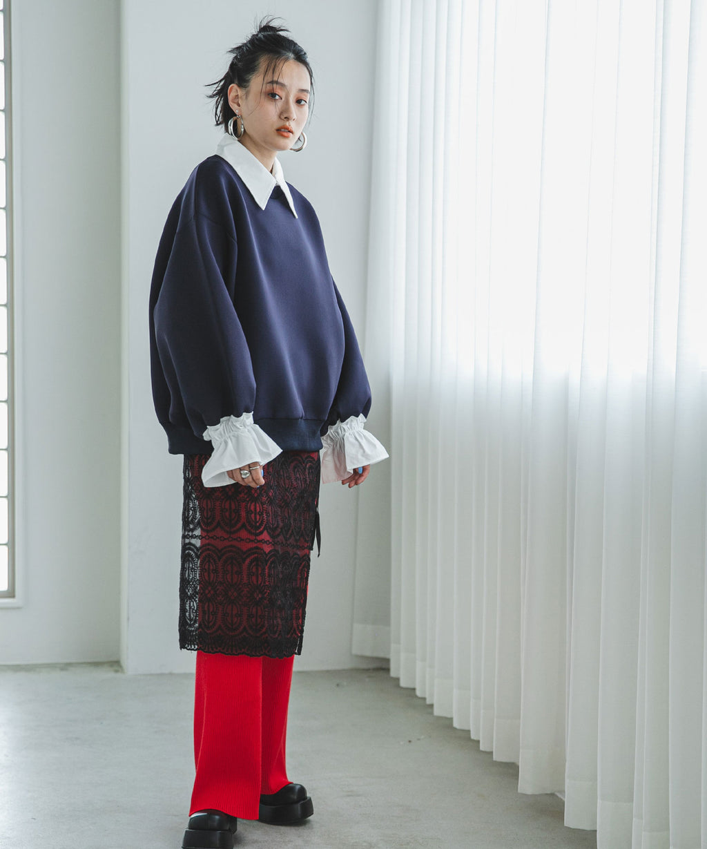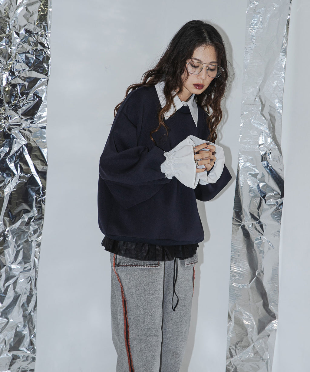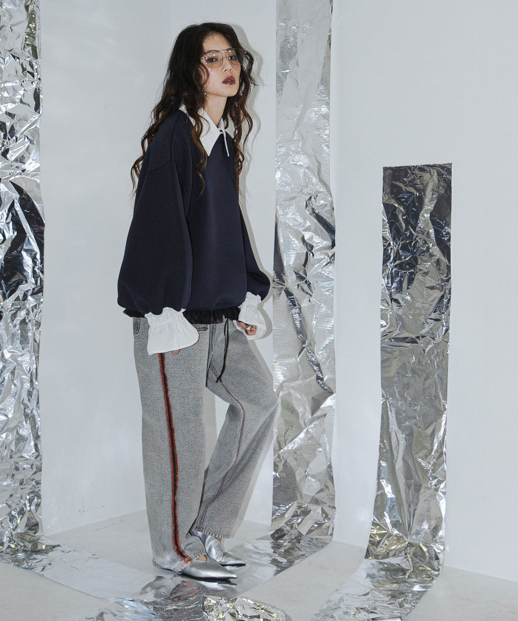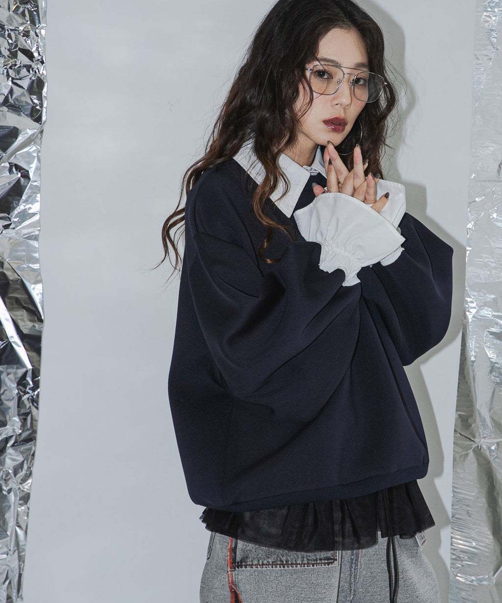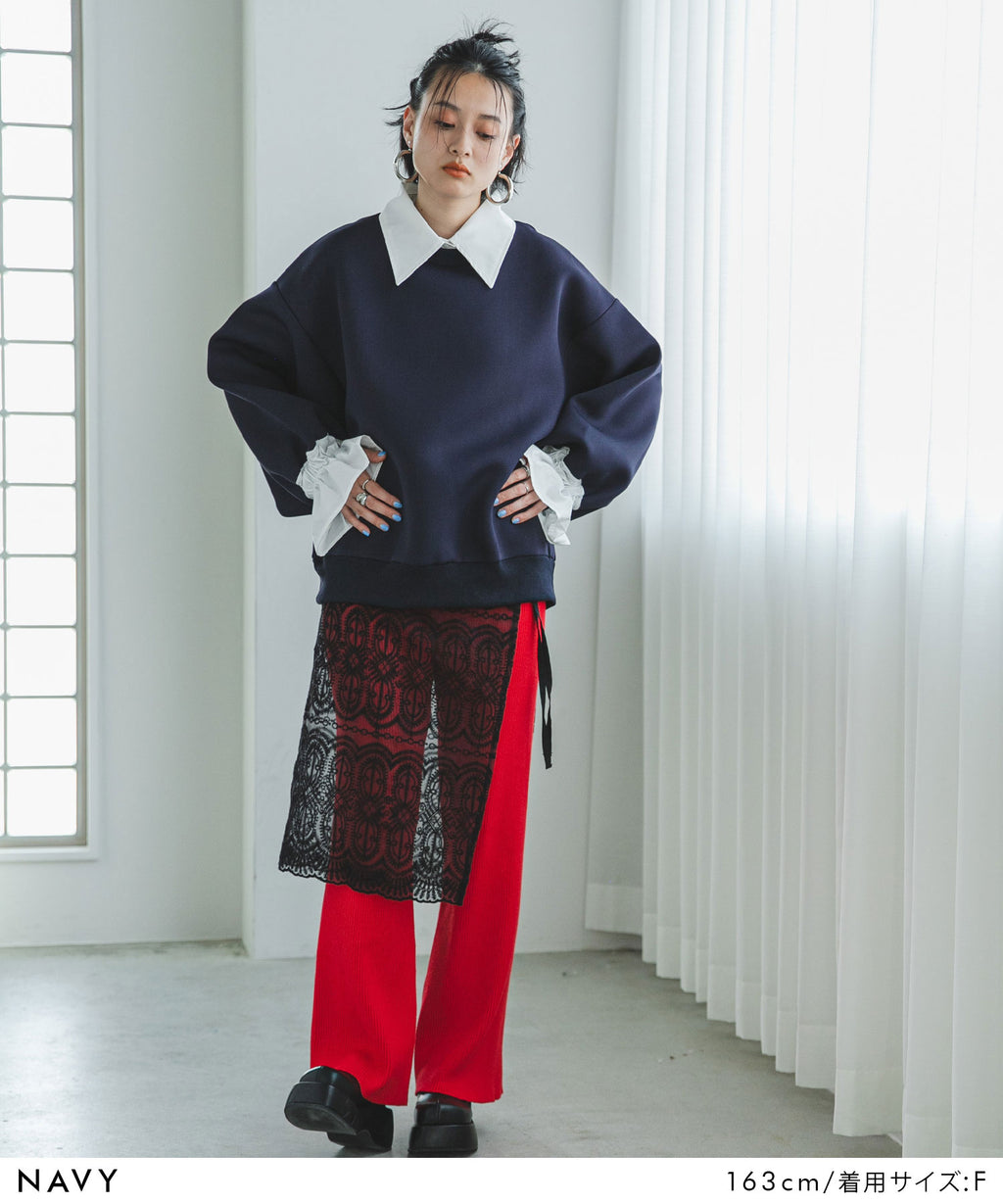 スウェットと異素材のフリルが袖と襟にドッキングされたアイテム。