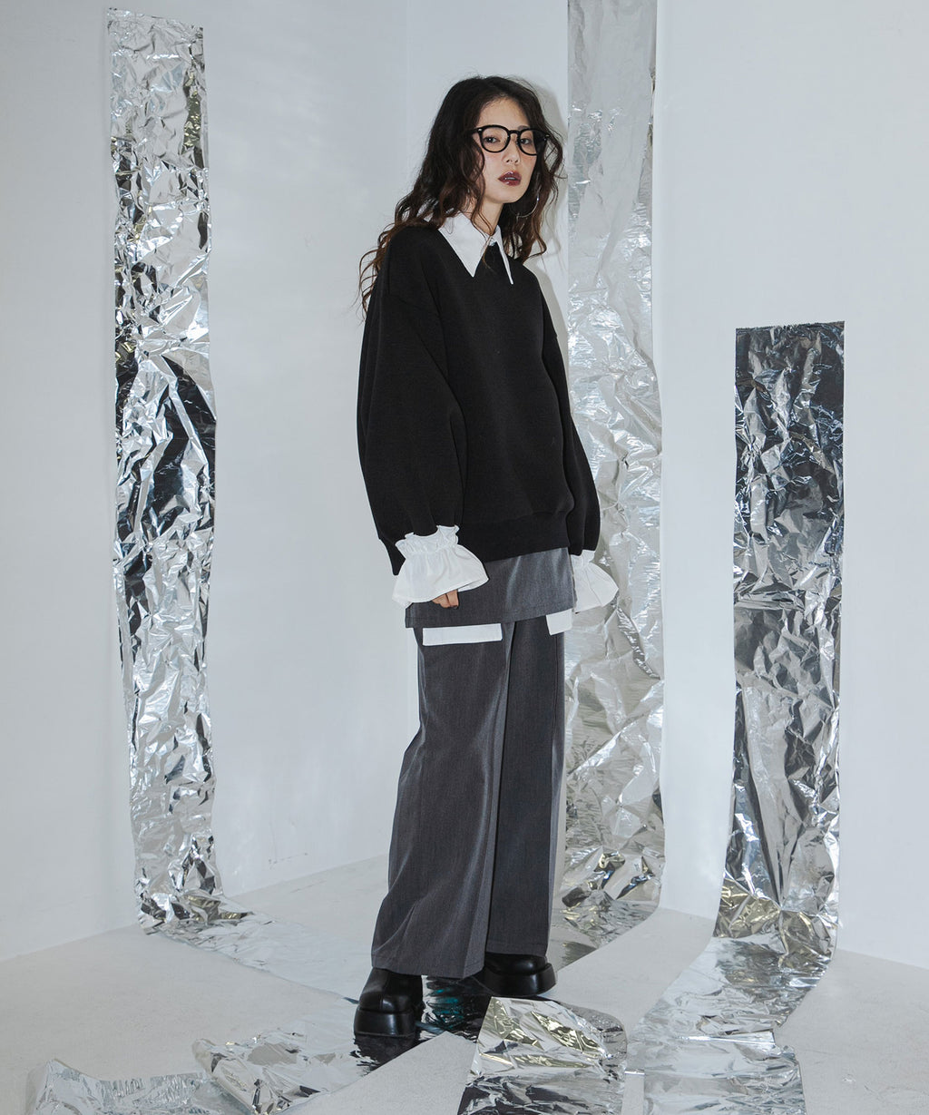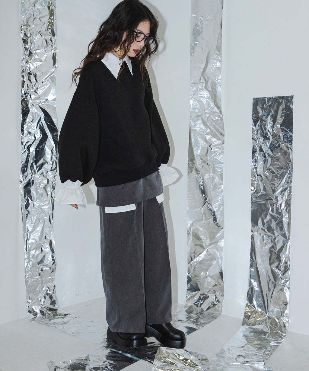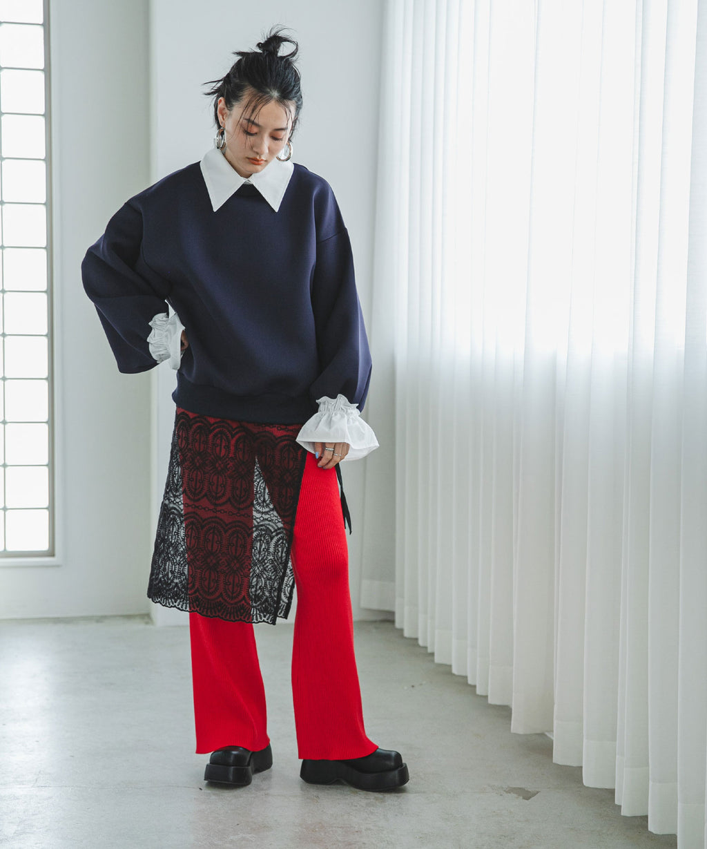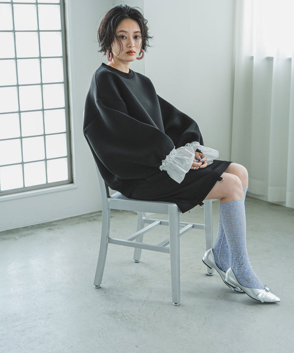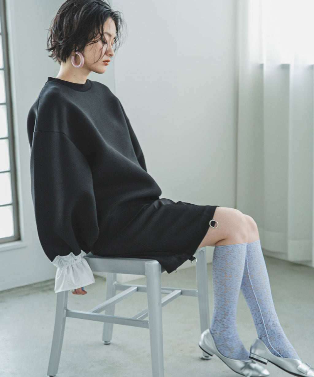 スウェットと異素材のフリルが袖と襟にドッキングされたアイテム。
