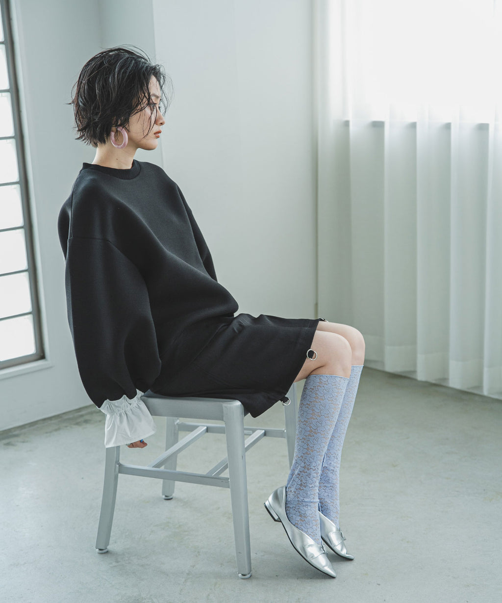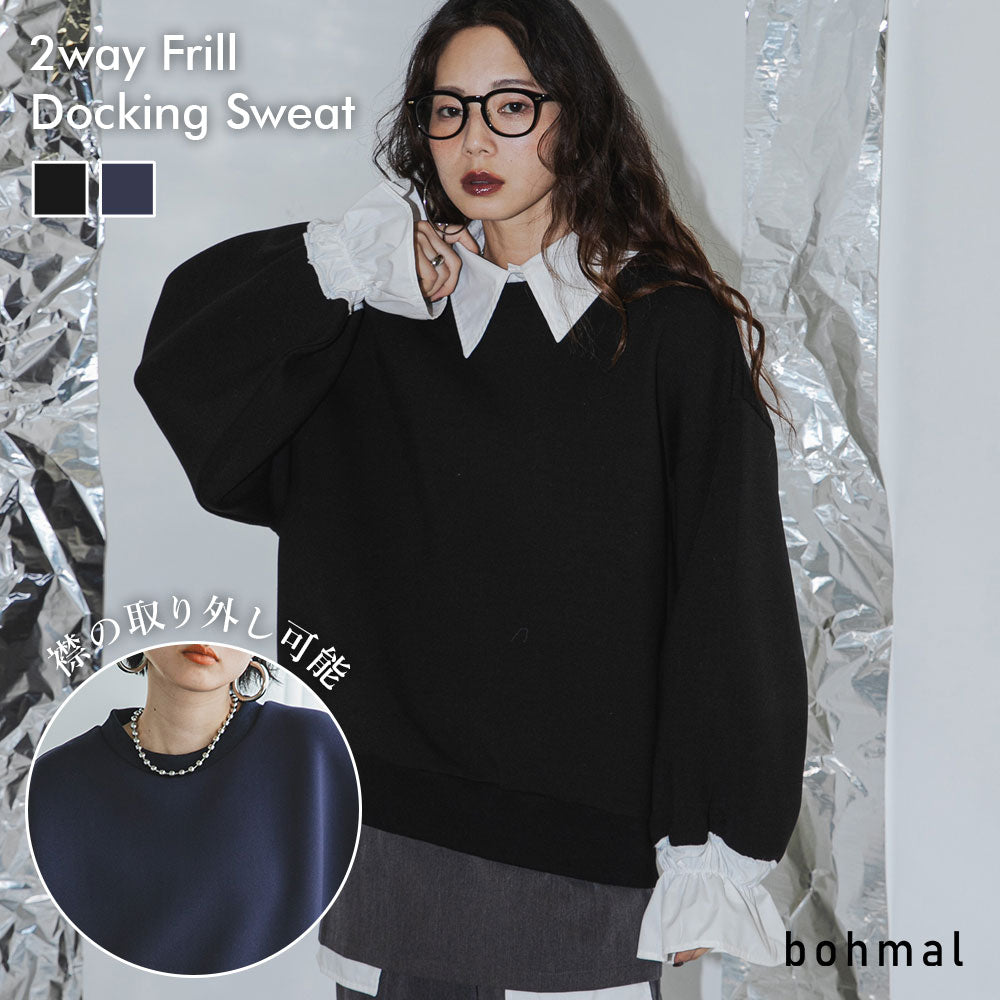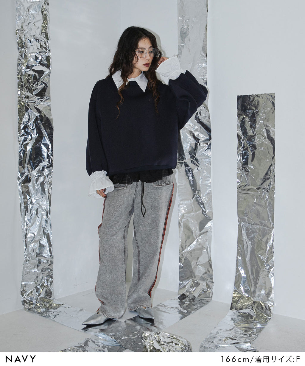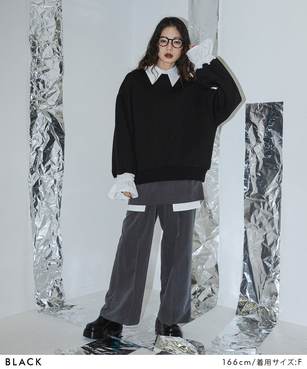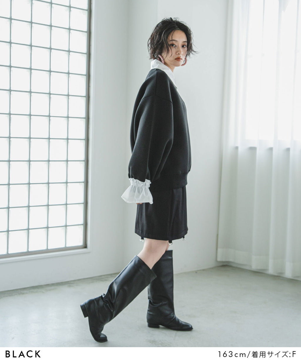 スウェットと異素材のフリルが袖と襟にドッキングされたアイテム。