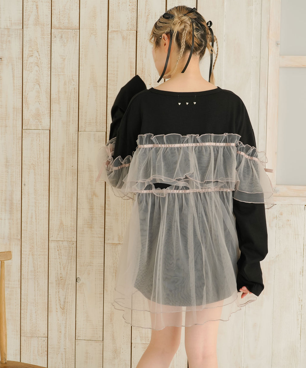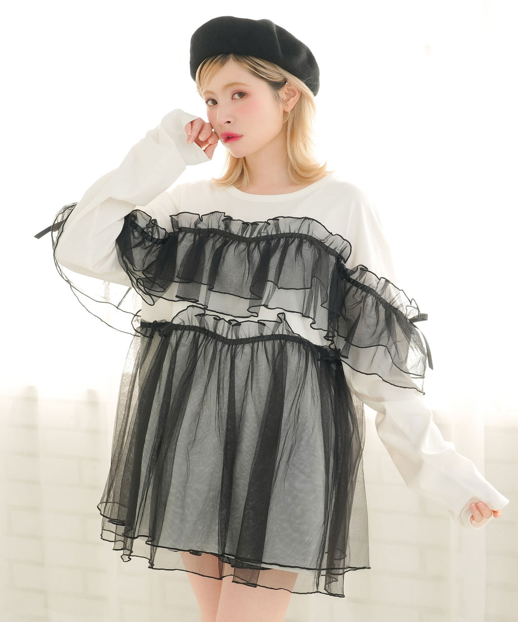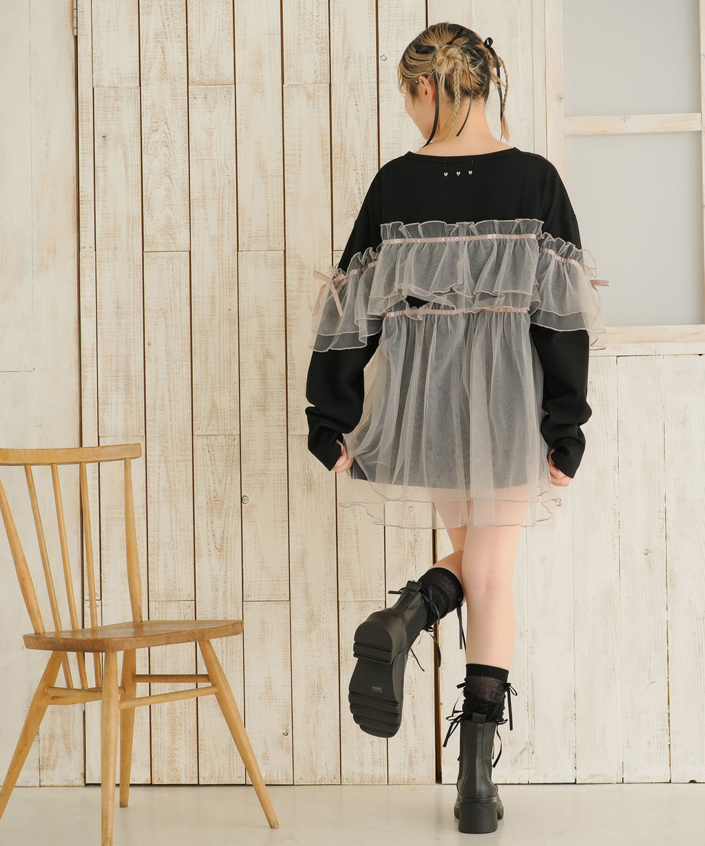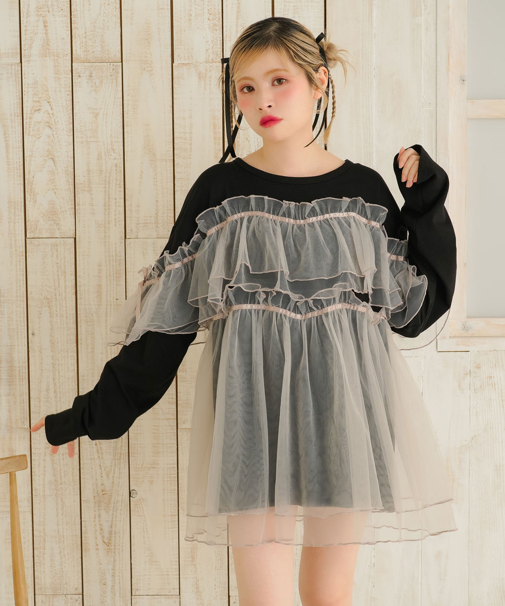 ふわっふわのたっぷりチュールフリルが可愛いチュニック丈ロンTのご紹介。