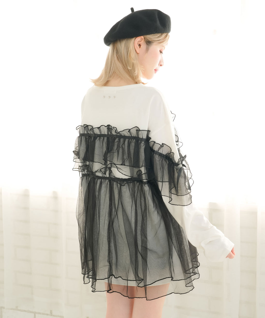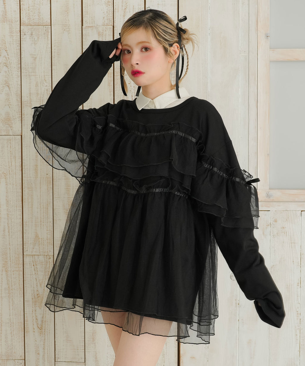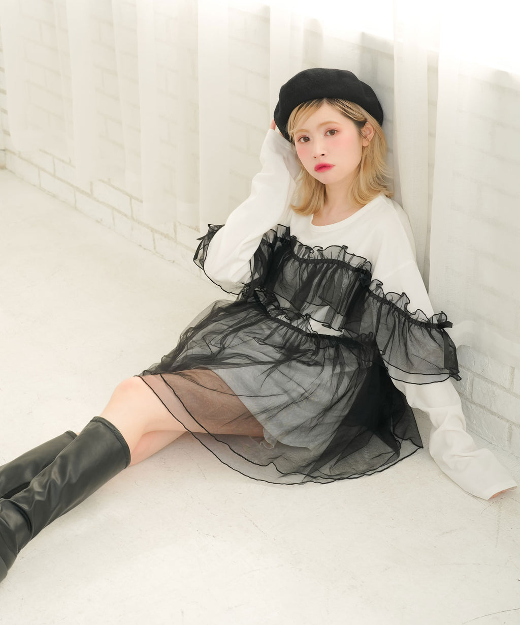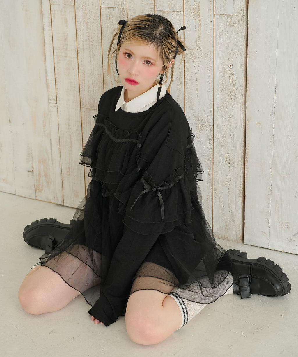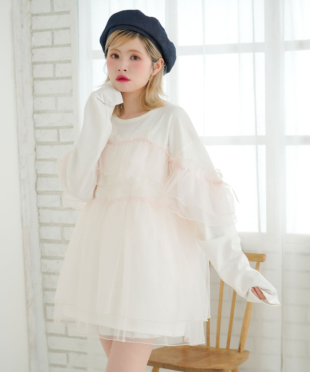 ふわっふわのたっぷりチュールフリルが可愛いチュニック丈ロンTのご紹介。