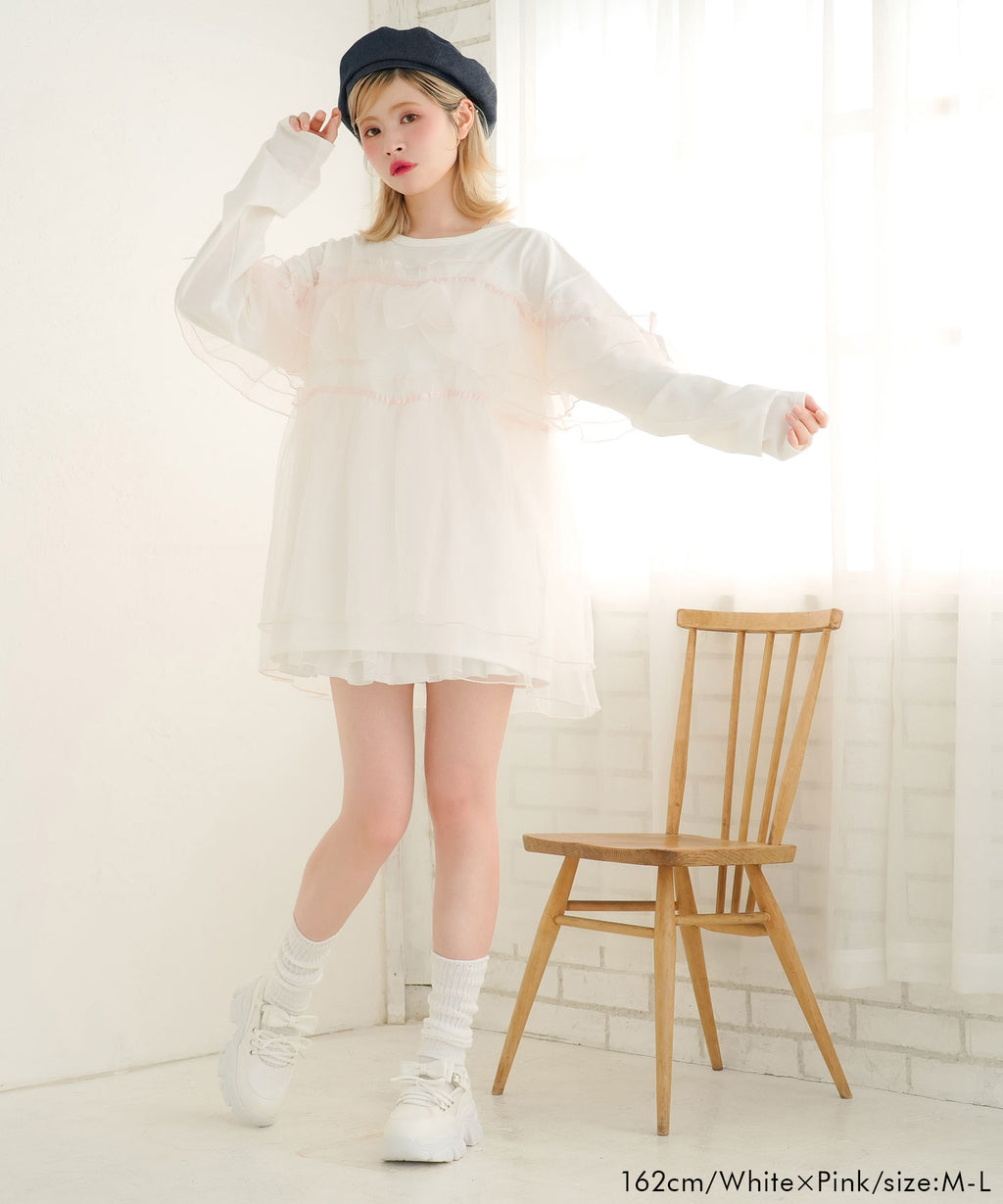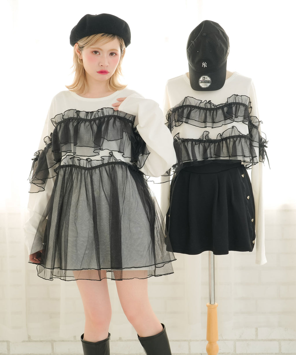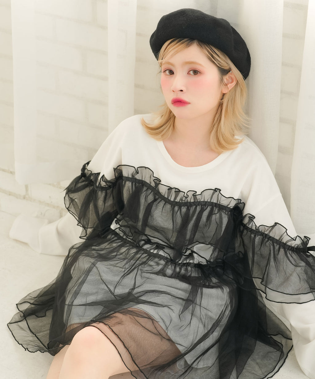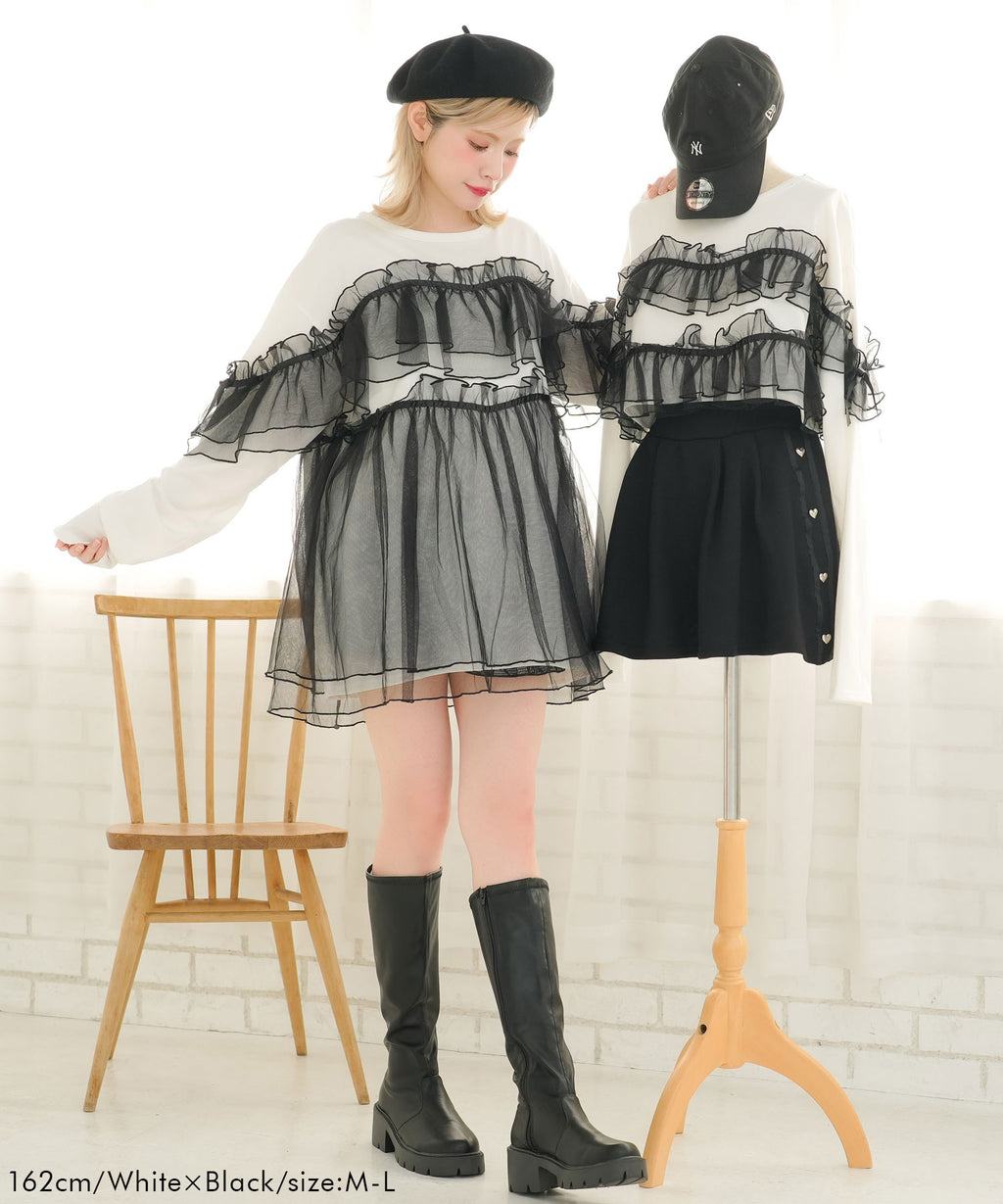 ふわっふわのたっぷりチュールフリルが可愛いチュニック丈ロンTのご紹介。